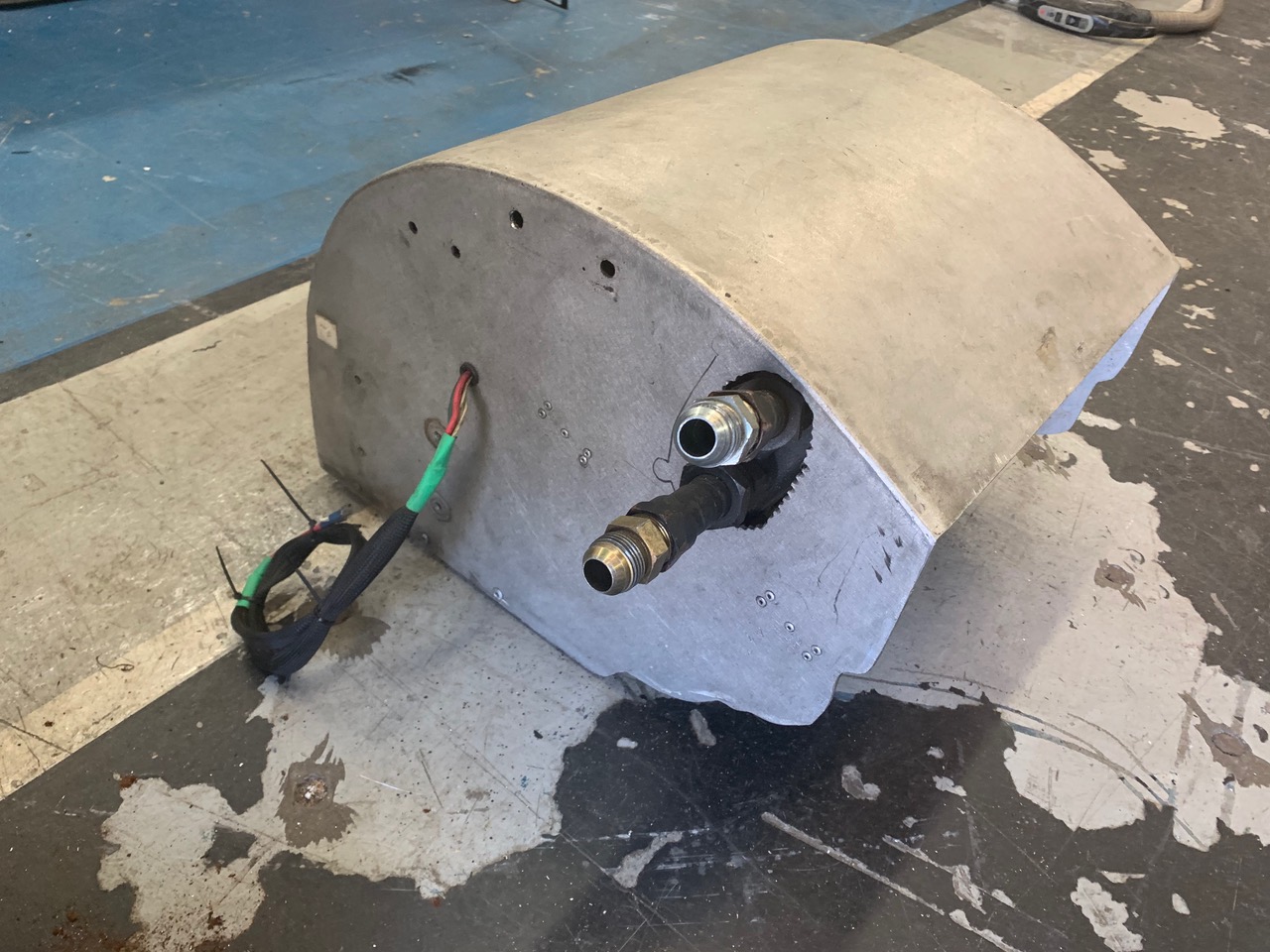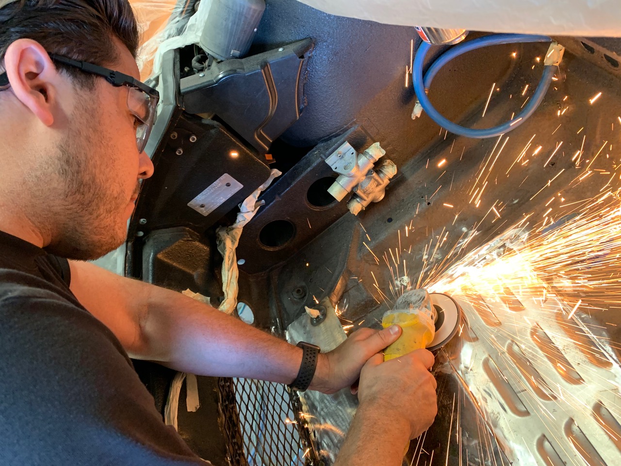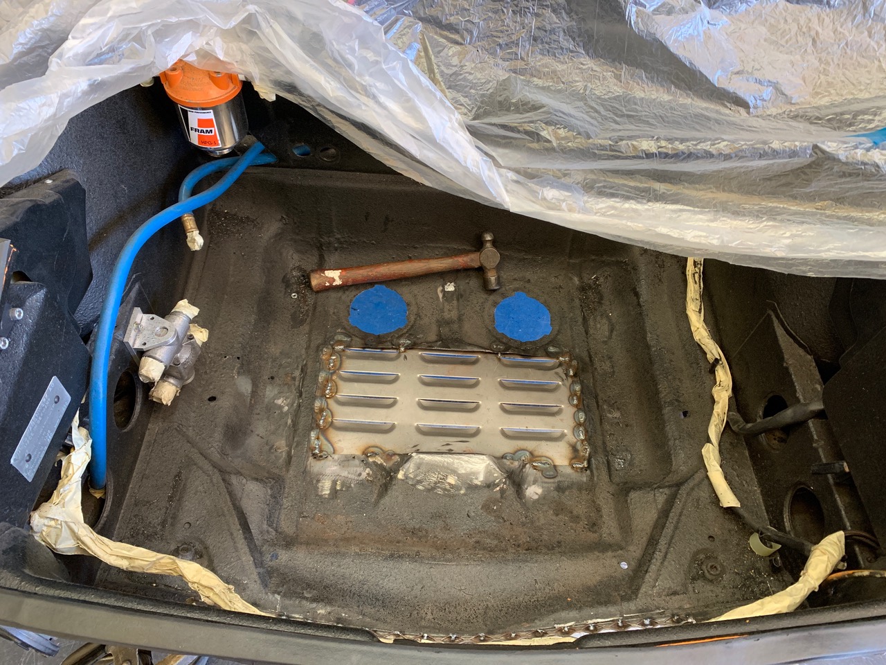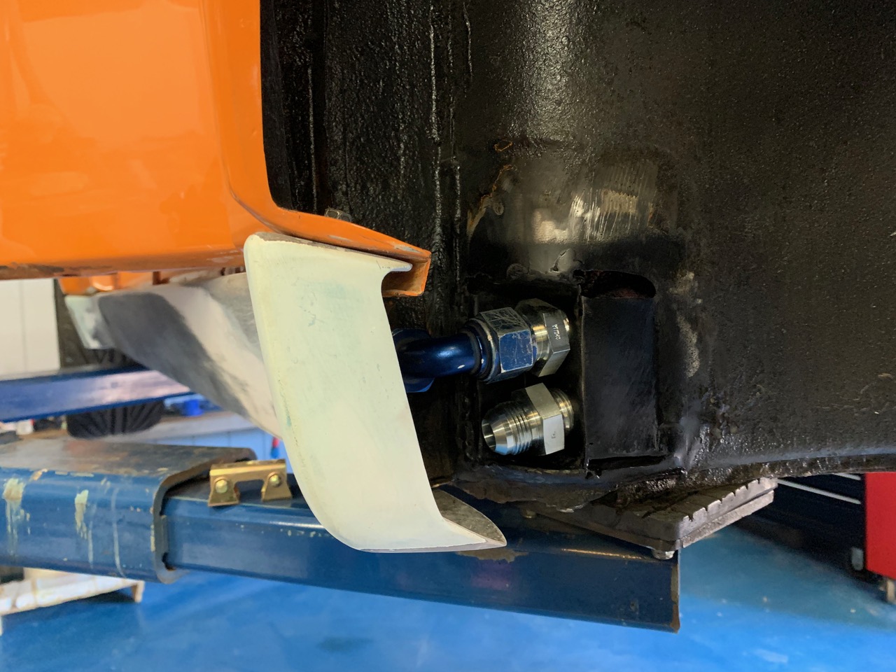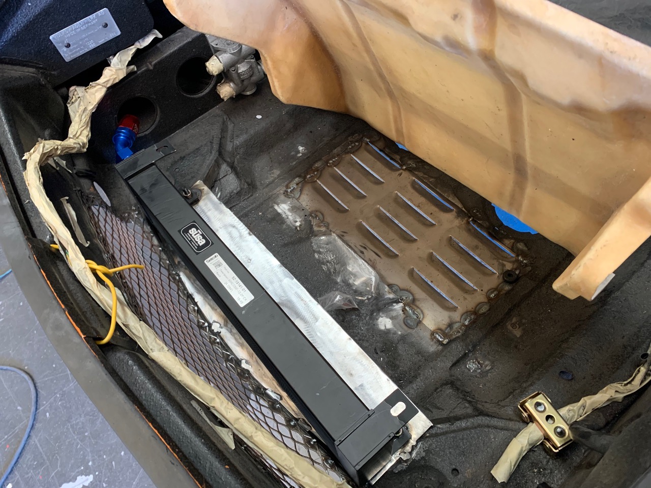 Oil-cooler well on its way to completion. The beginning of this week was all about finishing up fabrication, starting off with the new additions to the front trunk and passenger-side bulkhead mount for the AN12 oil-lines.