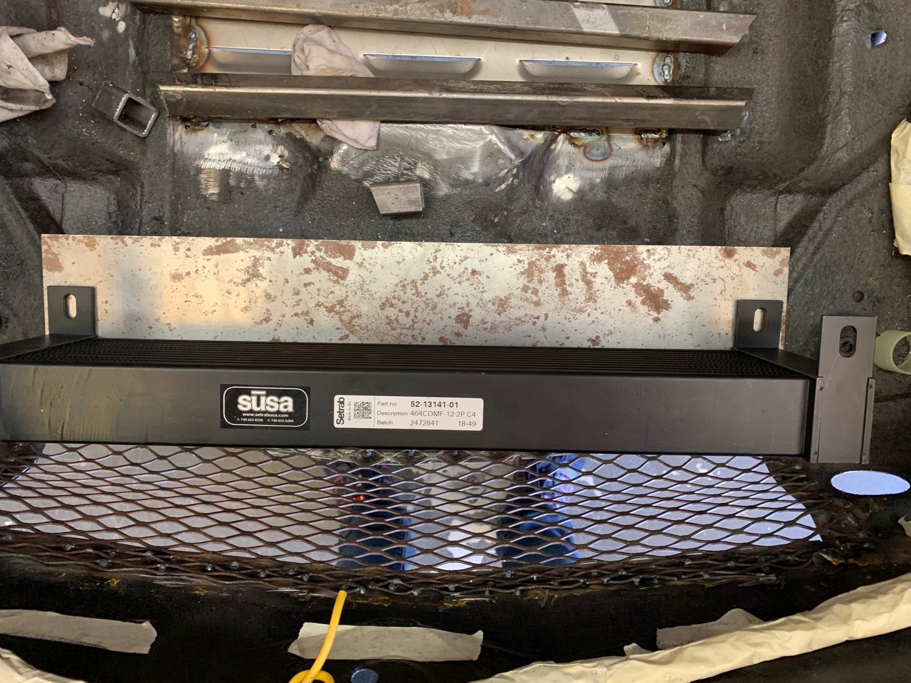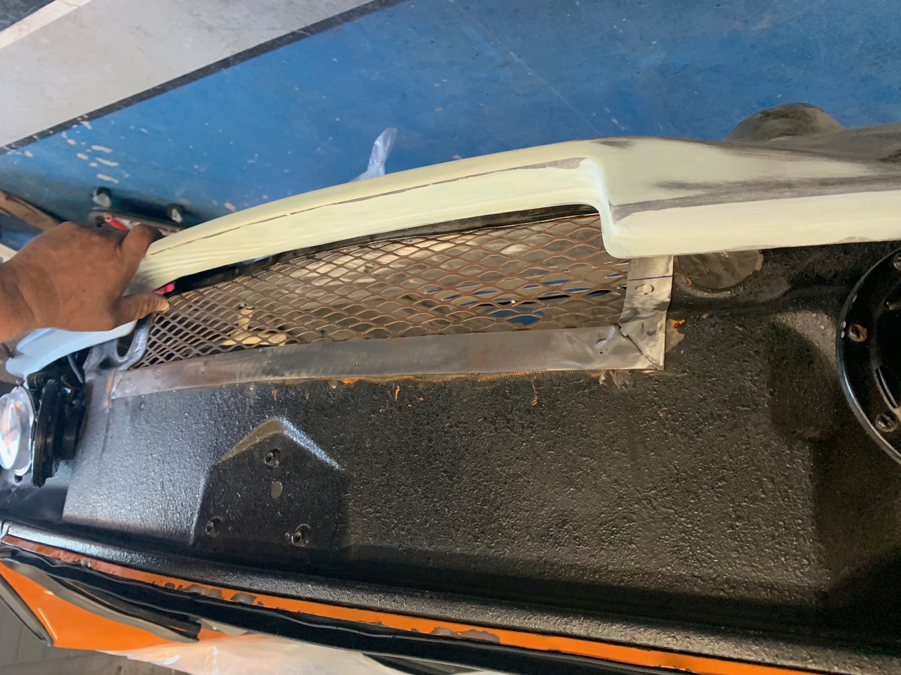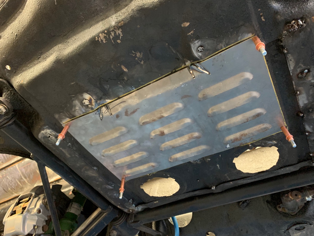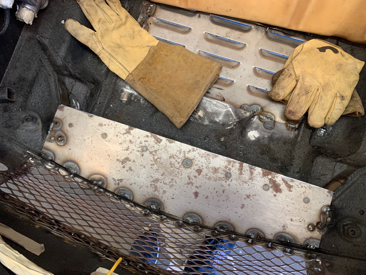 As work continues, my main focus has been fitting the GT cooler. I'm not trying to 're-create' or 'replicate' a GT car in any form, I just want my design to be clean. I ended up purchasing a louvered sheet metal piece from Patrick Motorsports (PMS) for $68.00 and welding it in to the (already previously cut for an AC) floor. In a 'while I'm here approach' I re-welded the previously cut floor, and both sections will get seam-sealer once done.