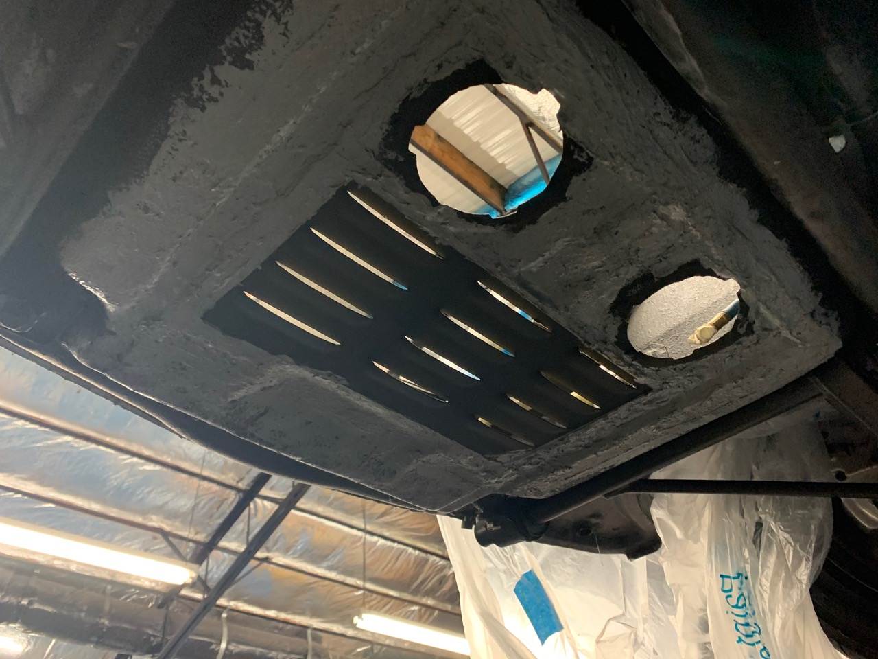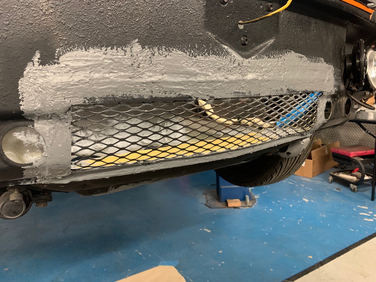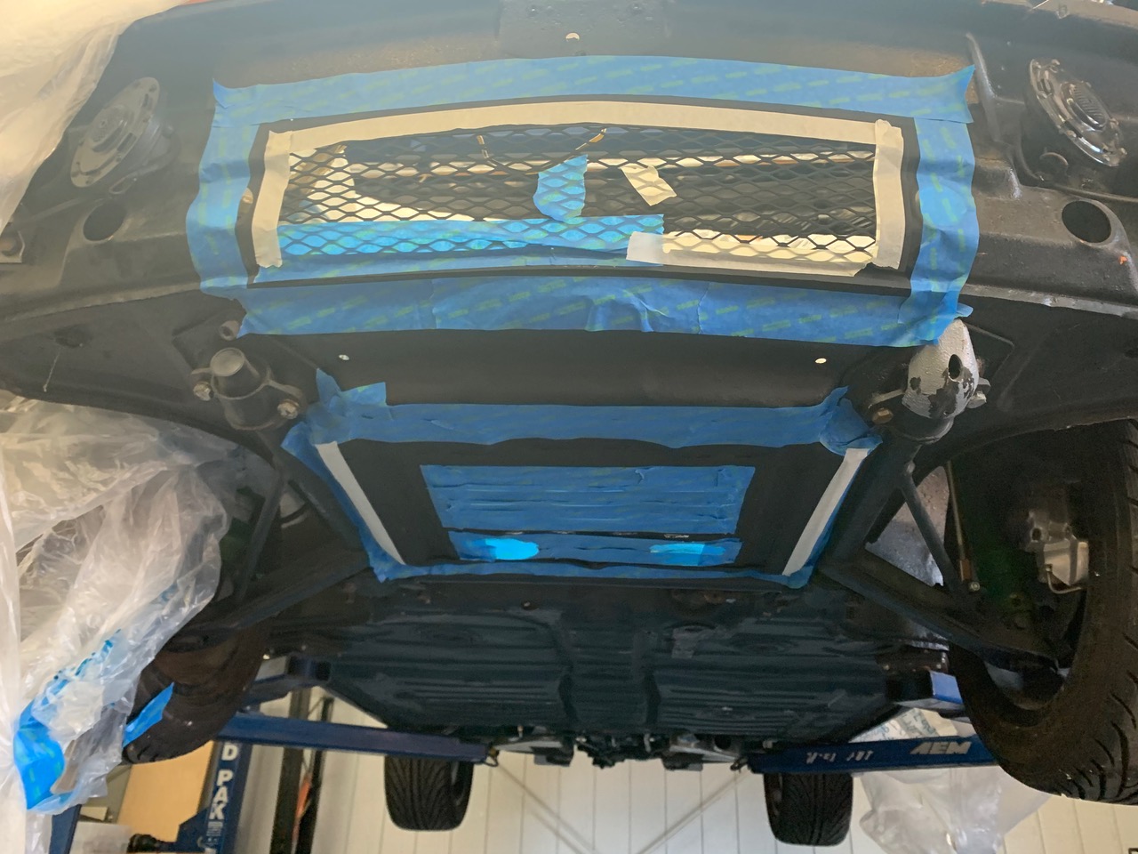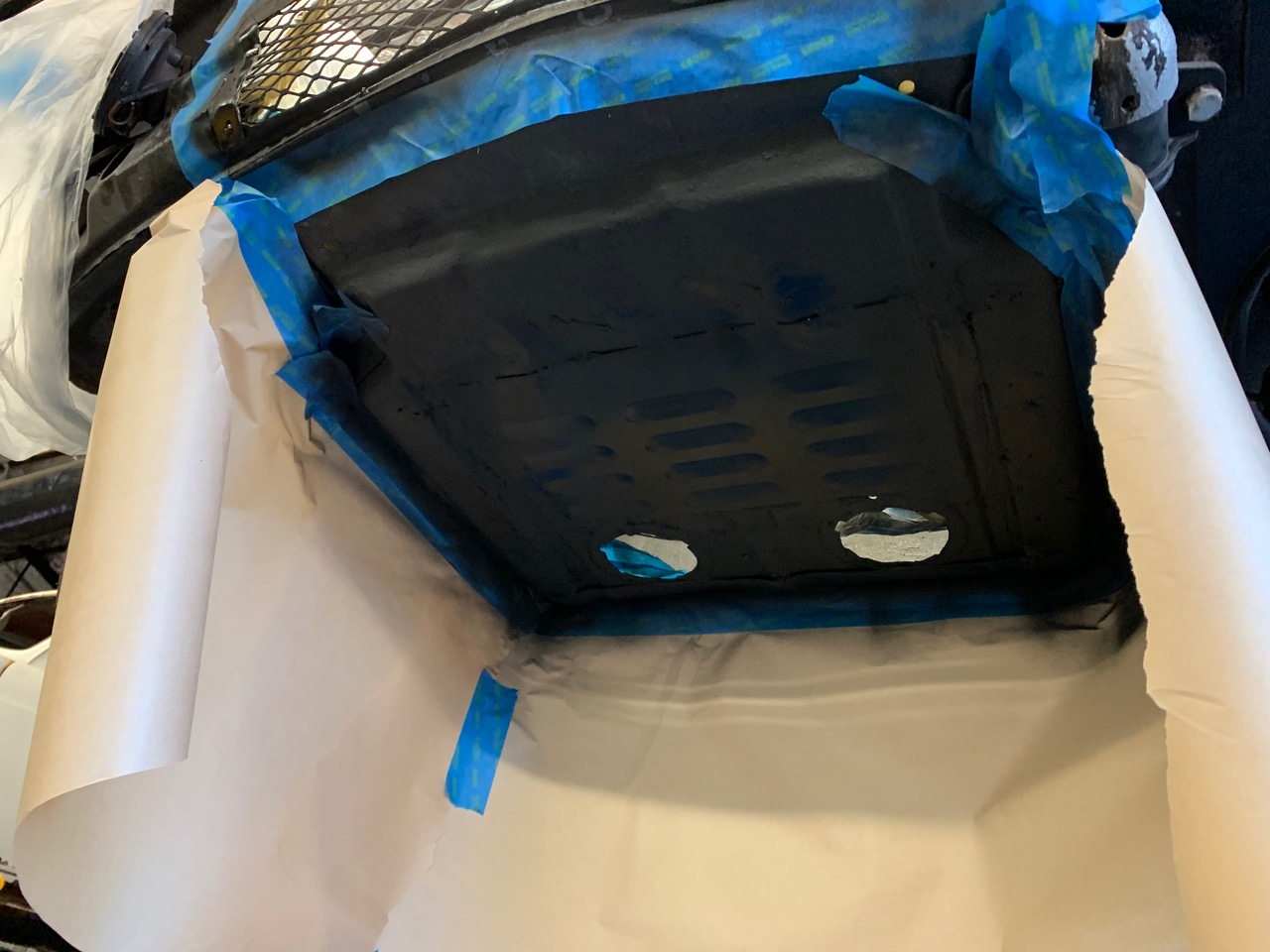 Primered both the interior of the front trunk, as well as the undercarriage and air-inlet in the front before adding sealer and rubberized undercoating, so that everything matches and looks tidy. NOTE: To the reader considering doing this fabrication on a project car; Do as much as you can before painting. My car has gone through numerous iterations, and it is sometimes nerve-racking working around finished bodywork and paint. As for the finishing, I chose to go 'thick' with the seam sealer and went with Wurth brushable. My car is 'anything but' stock, I like the look of this underneath the coating. It has nothing to do with 'it's what the factory used', nor am I trying to replicate that. I first applied it using a bondo applicator squeege to make sure to get inside the seams, then passed over the masked area with the brush. Love it, the way it looks, to me is pure 70's inspired racing. |