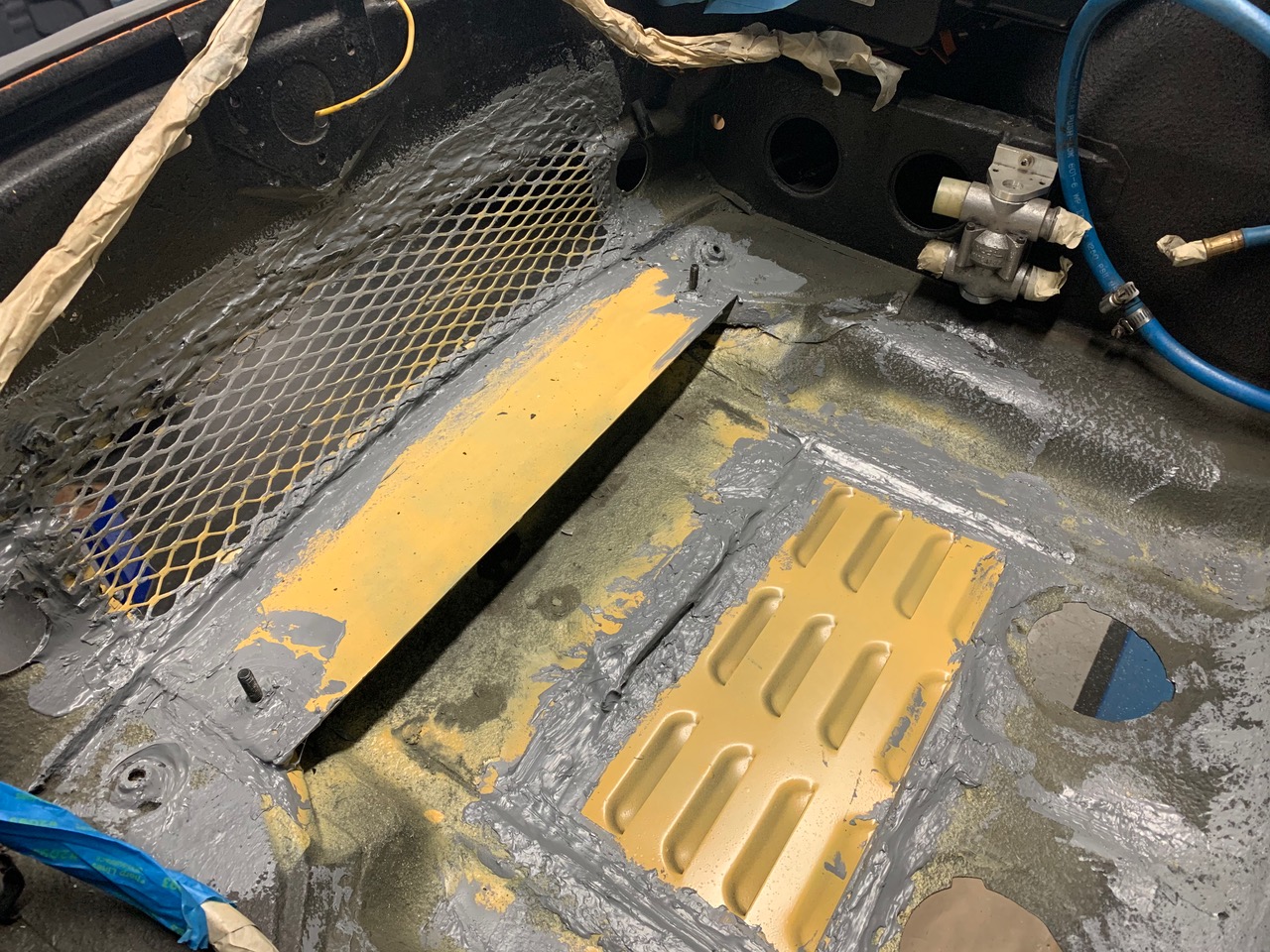 Monday, Tuesday and Wednesday this week were all about the oil-lines running on the passenger side. After reinforcing the area around the new bulkhead inlet, I also covered this with seam-sealer and applied rubberized undercoating. As I was re-running the oil-lines, I decided that the gussets that support the passenger entry 'step' still looked a bit big and needed to be ground-down a bit more, and then touched up this area with more undercoating, as well as the inside of the long there the bulkhead connections will be.