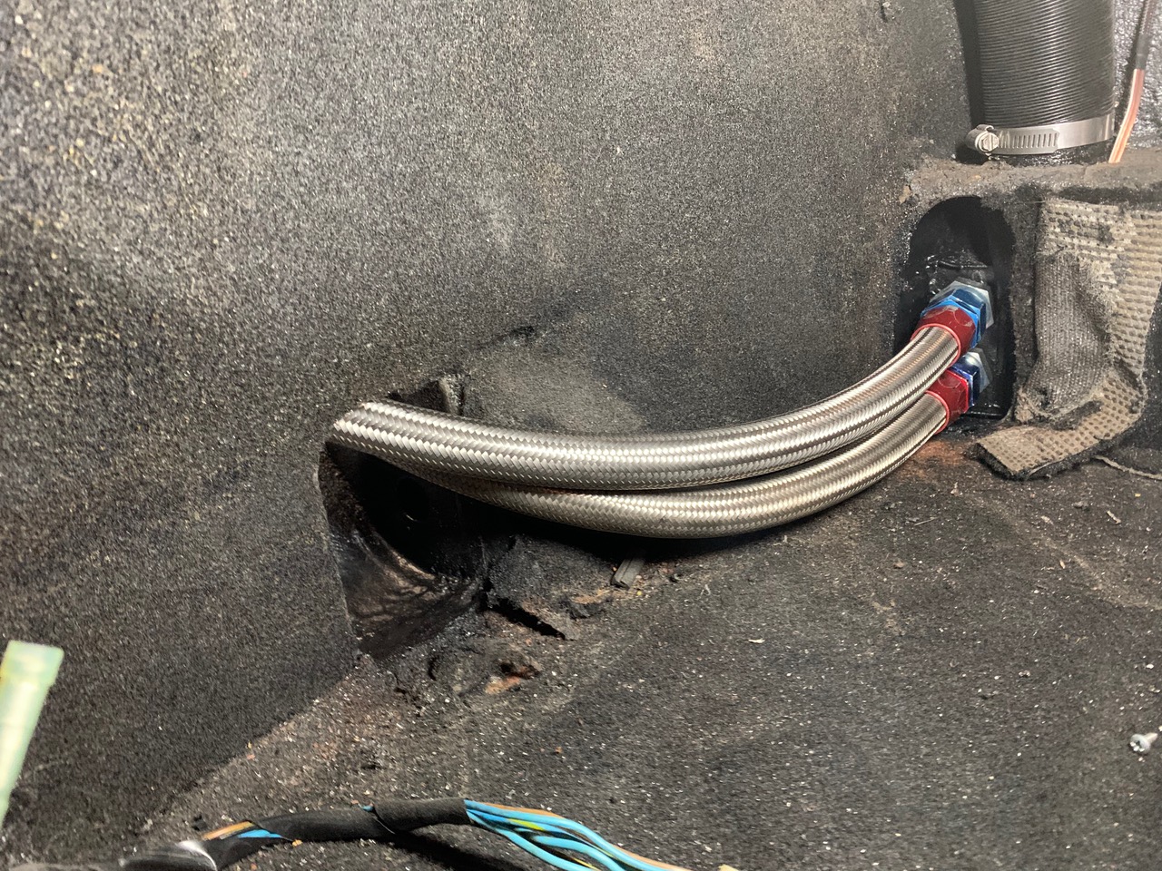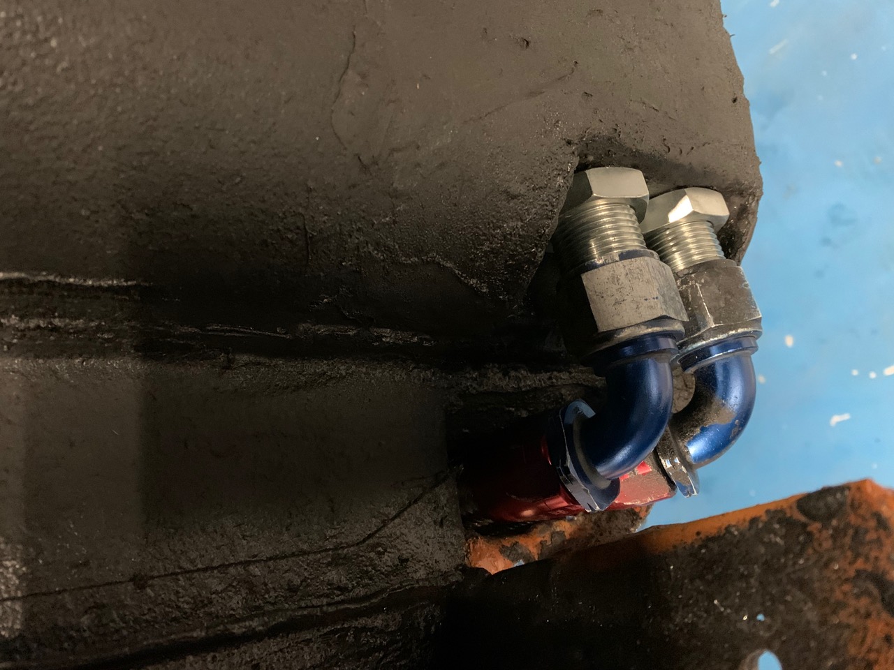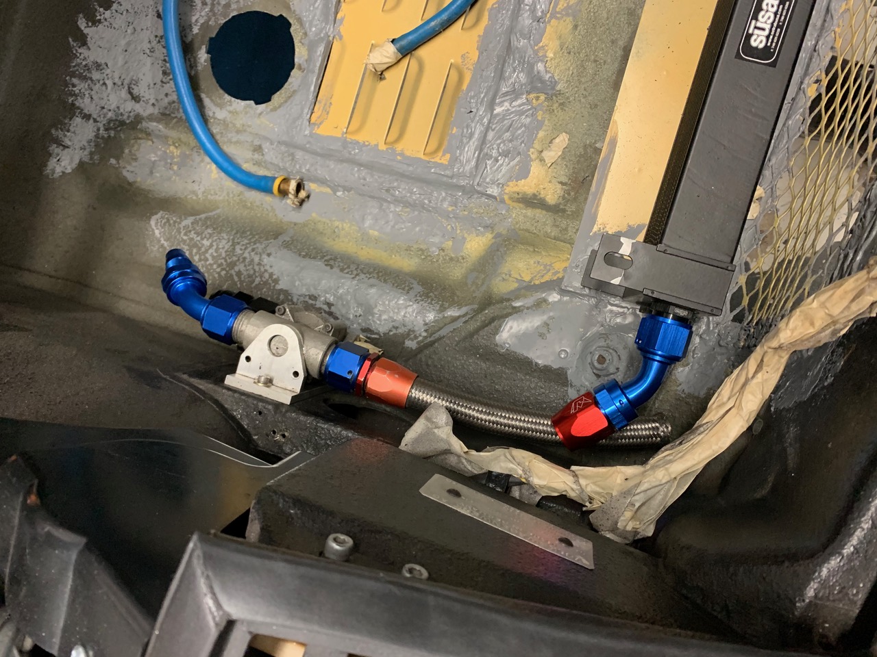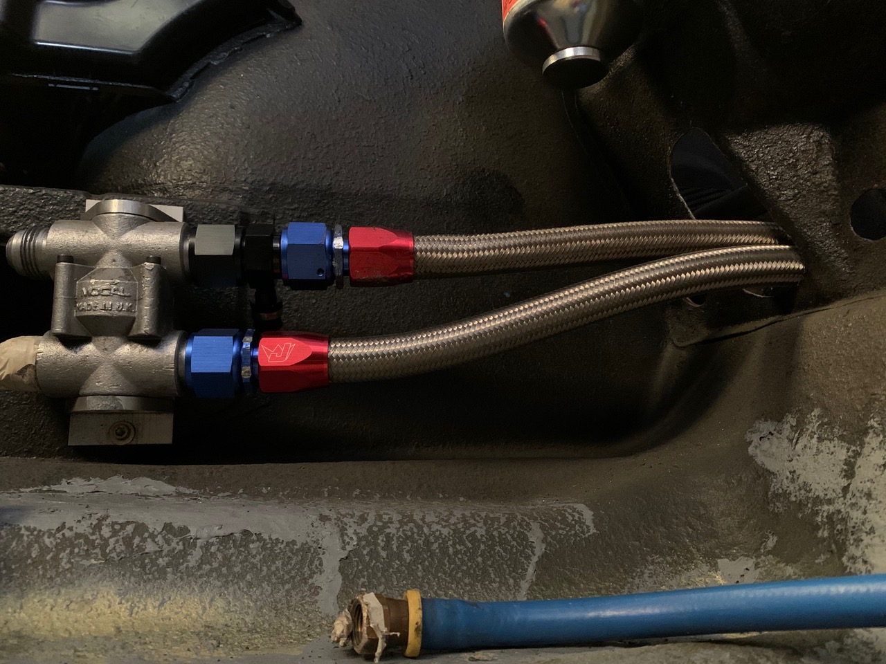 Work continues on the oil-system, and I'm happy to finally get the lines (mostly) wrapped up. The connection from the oil-tank / engine-out to the bulkhead fittings on the passenger-side longs is complete, as is the connection from the bulkhead fitting to the thermostat (routed through the inside of the cabin, under the gas-tank and into the front trunk). Also, I'de like to take this moment to mention how much I DO NOT love working with braided steel lines. For those of you moving in a similar direction, I highly suggest watching the various techniques on YouTube, investing in gloves, and learning how to curse in 4-languages... You'll need all of those! (IMG:style_emoticons/default/headbang.gif) For future reference, I can see the benefit when running them outside a shielded area, but will be moving to nylon whenever possible. NOTE: For those creating a similar solution, the connection from the thermostat to the oil-cooler is where it gets tricky, depending on where you mount the thermostat. Whereas originally I was going to run a 45º and then about 6" of braided hose, I find that I will have to install a 2"-3" 'extender' on the oil-cooler, then a 90º bend to be able to route this correctly (with the 45º, it would rub or 'kink' against the support below the headlight), see the last picture of where things don't line up like I was expecting, and the extender(s) I found on JEGS, not sure which one will end up being the solution.... ![]() |