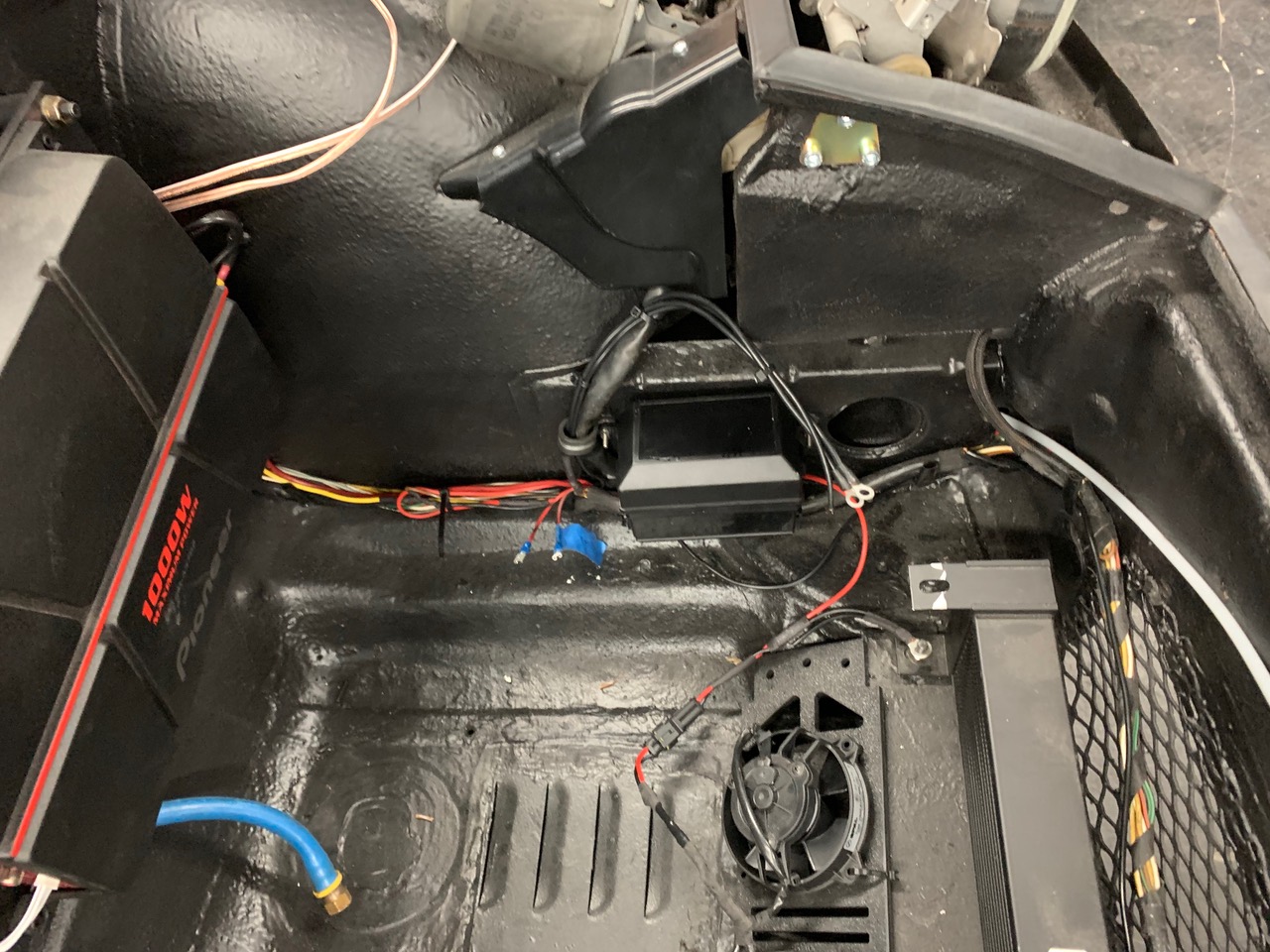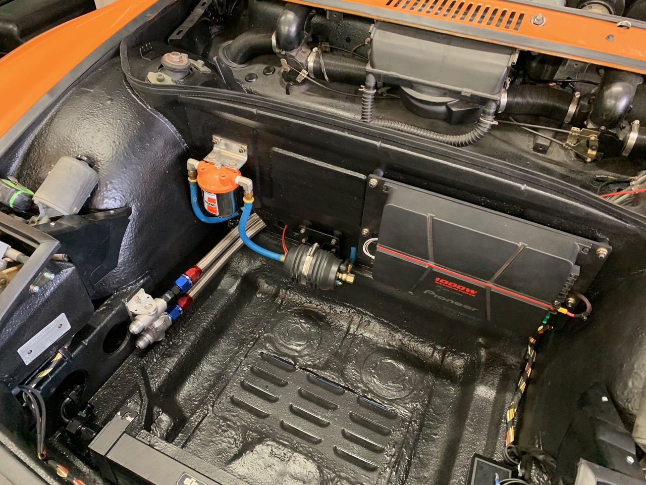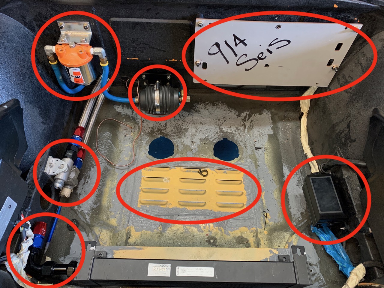 - Top Right Corner on front bulkhead - Amplifier bracket template (actual is 1/4" ABS) - Designed this myself, laser-cut. Used metric 8mm x 35 bolts back-drilled from the 'gas tank side' of the trunk. To isolate and stand off for wires and speaker cables, I added plastic spacers (approx 1.5"). Note: For the top-left bolt, it is necessary to drill through top-support of the bulkhead/firewall to have access to the tubing. - Top Left Corner on front bulkhead - 3.6 Fram Fuel-filter - As with the amplifier, back-drilled from the 'gas-tank side' of the trunk for easy access / studs. - Bottom-center on front bulkhead - 3.6 Fuel pump with isolators and bracket - Careful here, as it's close to the sway bar. Mounted the fuel pump on a bracket with 1" rubber isolators to reduce vibration. This location was chosen as it's (nearly) the lowest point of the front trunk, and doesn't interfere with the oil-cooler shroud. - Driver Side, below headlight - Aux Relay / Fuse Box - Found this on Amazon (Link here - Relay/Fusebox). Great model and very tidy. This will hold all fuses / relays for equipment in the front trunk; Fuel Pump, Amplifier, Oil-Cooler Fans, Work-light. As I had to slightly re-route the stock-harness for the Driver-Side headlights and turn-signal, I added an isolated wire-clamp. - Center-bottom of front trunk - Louvered sheet metal - Available on Patrick Motorsports (PMS Link here). Pretty straight-forward. - Front trunk Left - Oil Cooler thermostat - For those unfamiliar; When cool, the device returns oil to the engine. When up to operating temp., it will allow oil to flow to the front-mounted oil cooler. Additionally, I've mounted a Setrab inline thermal switch, also from Patrick Motorsports (PMS Website and link here). This is a 'set it and forget it measure'. When the oil temp gets to 190º, this will kick-on the 3x Spal fans (Link here). - Front trunk - Oil Cooler connections - I found it easiest to use a 90º bend and a small adapter to make everything fit and flow into the front-mounted oil-cooler. Cooler is a Setrab unit and, shocker-shocker, found on Patrick Motorsports (Oil Cooler - Link here) In case I haven't mentioned it, all lines and connections are AN12, and generally available on JEGS.com, Offroadwarehouse.com, etc. - Shroud - Used the GT replica shroud, this is available most anywhere. Cut the side out for the oil in/out to exit, and a small notch on the Drivers side for the fan electrical connections to pass under, making removing and installing easy. Additionally, I added 4x tabs to the top and bottom, drilled through the shroud and body, then welded 6mm nuts for the bolts to hold onto. No need to climb under the car or take off the bumper to remove, and no ugly sheet-metal screws (IMG:style_emoticons/default/shades.gif) |