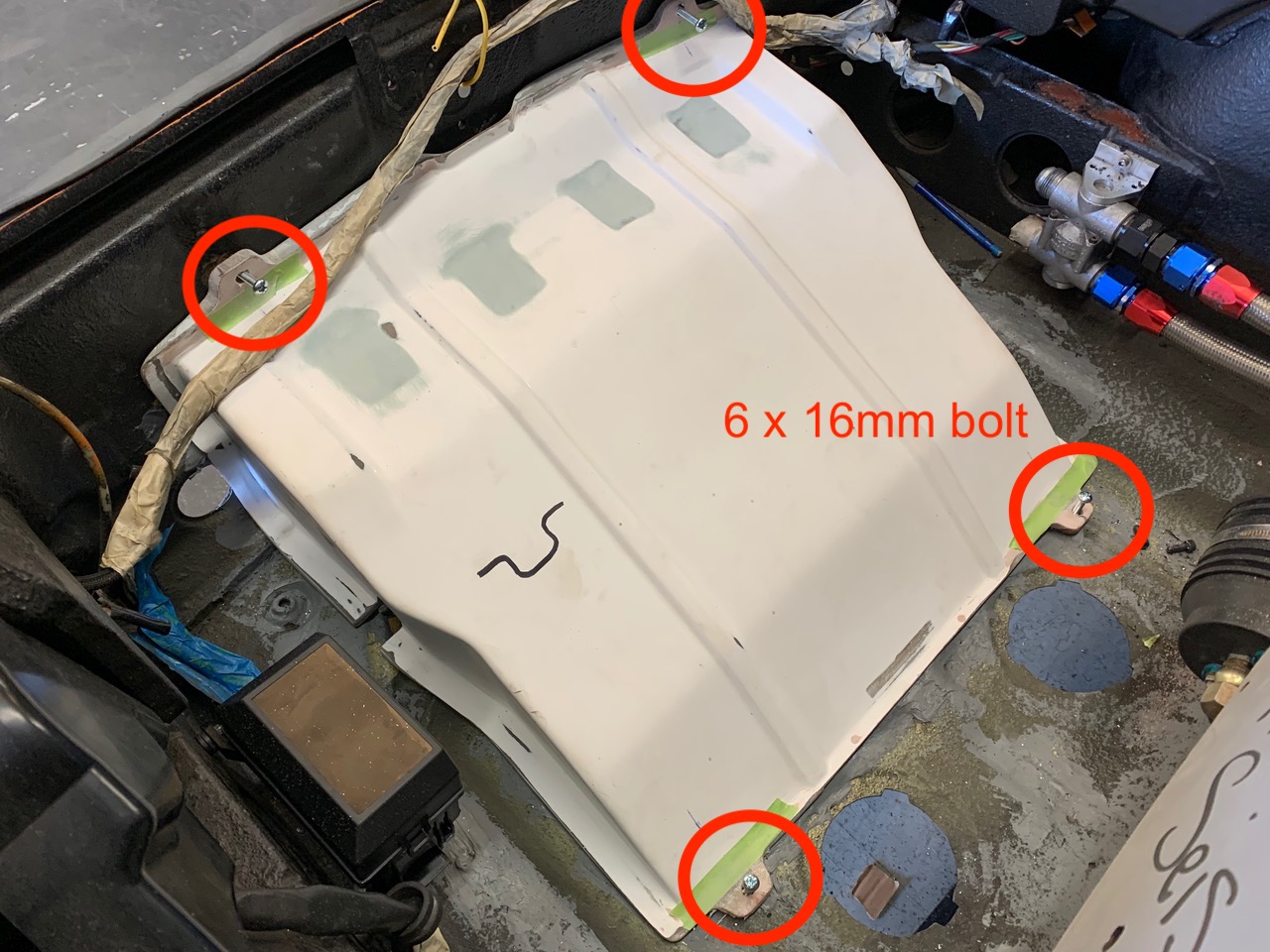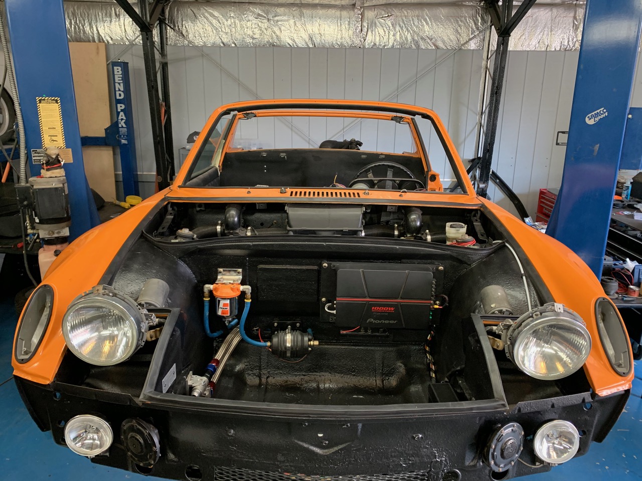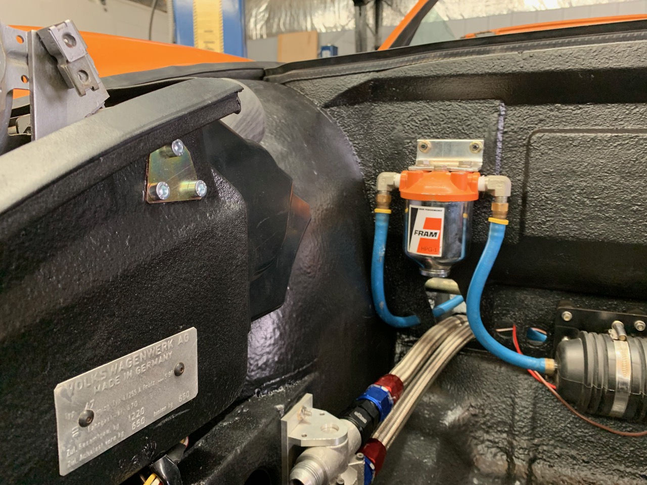 - Top Right Corner on front bulkhead - Amplifier bracket template (actual is 1/4" ABS) - Designed this myself, laser-cut. Used metric 8mm x 35 bolts back-drilled from the 'gas tank side' of the trunk. To isolate and stand off for wires and speaker cables, I added plastic spacers (approx 1.5"). Note: For the top-left bolt, it is necessary to drill through top-support of the bulkhead/firewall to have access to the tubing. - Top Left Corner on front bulkhead - 3.6 Fram Fuel-filter - As with the amplifier, back-drilled from the 'gas-tank side' of the trunk for easy access / studs. - Bottom-center on front bulkhead - 3.6 Fuel pump with isolators and bracket - Careful here, as it's close to the sway bar. Mounted the fuel pump on a bracket with 1" rubber isolators to reduce vibration. This location was chosen as it's (nearly) the lowest point of the front trunk, and doesn't interfere with the oil-cooler shroud. - Driver Side, below headlight - Aux Relay / Fuse Box - Found this on Amazon (Link here - Relay/Fusebox). Great model and very tidy. This will hold all fuses / relays for equipment in the front trunk; Fuel Pump, Amplifier, Oil-Cooler Fans, Work-light. As I had to slightly re-route the stock-harness for the Driver-Side headlights and turn-signal, I added an isolated wire-clamp. - Center-bottom of front trunk - Louvered sheet metal - Available on Patrick Motorsports (PMS Link here). Pretty straight-forward. - Front trunk Left - Oil Cooler thermostat - For those unfamiliar; When cool, the device returns oil to the engine. When up to operating temp., it will allow oil to flow to the front-mounted oil cooler. Additionally, I've mounted a Setrab inline thermal switch, also from Patrick Motorsports (PMS Website and link here). This is a 'set it and forget it measure'. When the oil temp gets to 190º, this will kick-on the 3x Spal fans (Link here). - Front trunk - Oil Cooler connections - I found it easiest to use a 90º bend and a small adapter to make everything fit and flow into the front-mounted oil-cooler. Cooler is a Setrab unit and, shocker-shocker, found on Patrick Motorsports (Oil Cooler - Link here) In case I haven't mentioned it, all lines and connections are AN12, and generally available on JEGS.com, Offroadwarehouse.com, etc. - Shroud - Used the GT replica shroud, this is available most anywhere. Cut the side out for the oil in/out to exit, and a small notch on the Drivers side for the fan electrical connections to pass under, making removing and installing easy. Additionally, I added 4x tabs to the top and bottom, drilled through the shroud and body, then welded 6mm nuts for the bolts to hold onto. No need to climb under the car or take off the bumper to remove, and no ugly sheet-metal screws (IMG:style_emoticons/default/shades.gif) |
