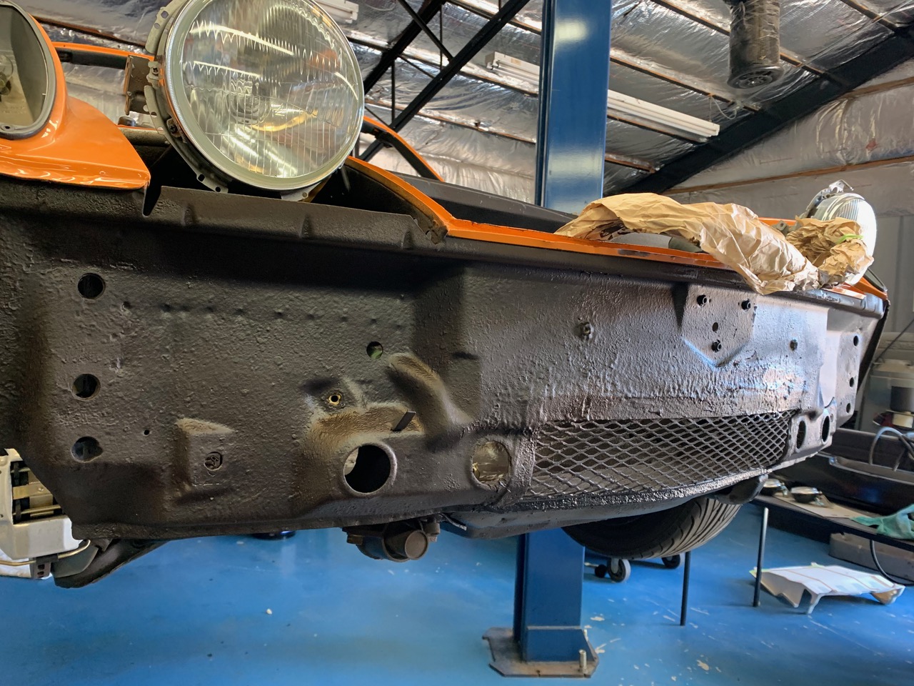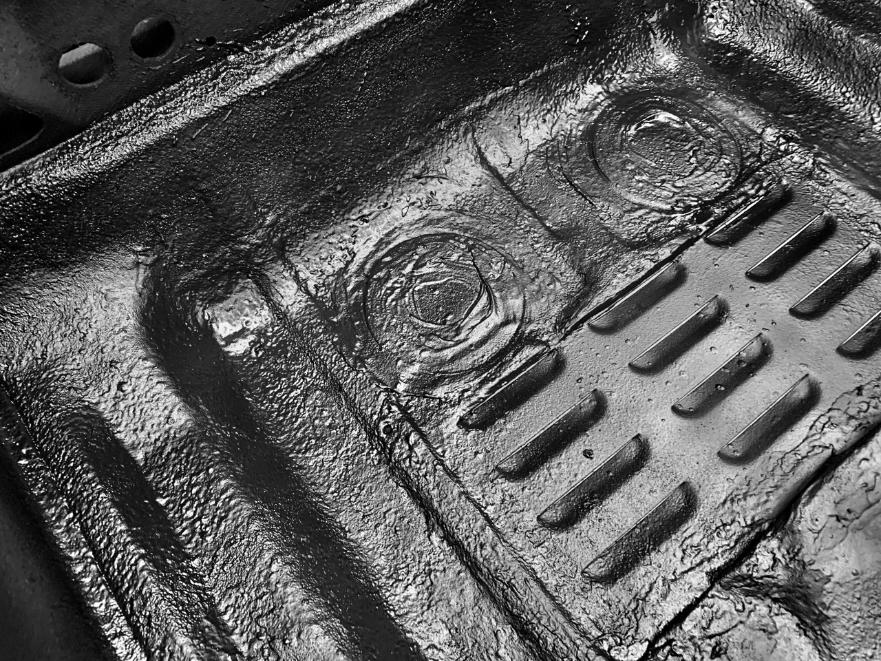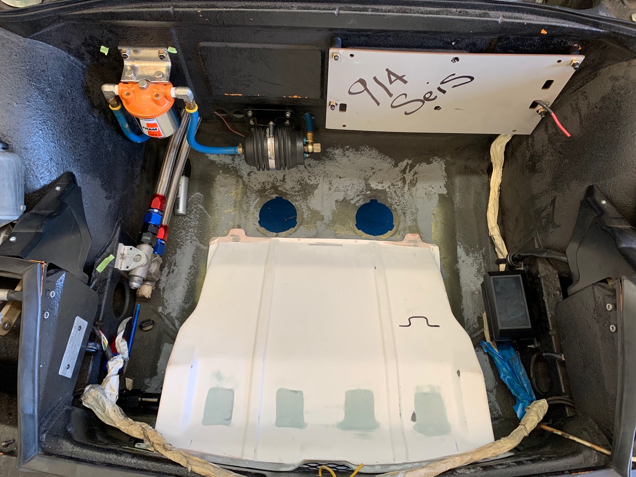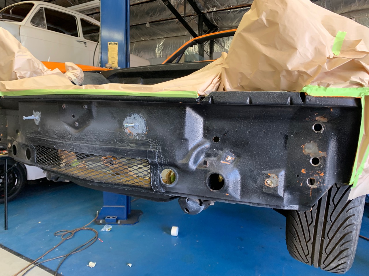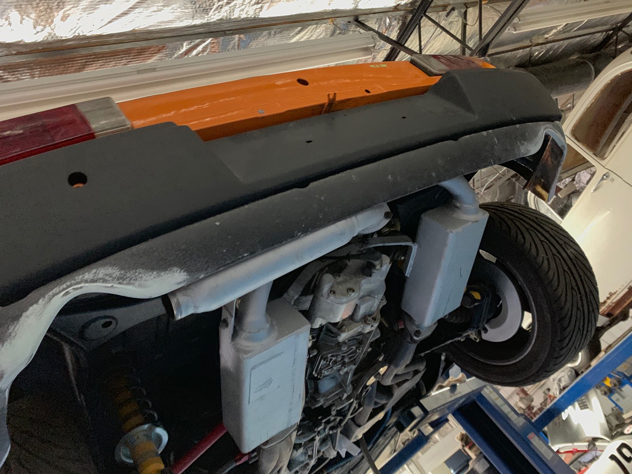 Once complete with the mockup, it's time to undo all the work seal up the new bolts and old-bolt holes, sand-down and re-shoot the front trunk, front bumper area, and trunk undercarriage. Luckily, with the original build, I used high-grade rubberized undercoating and it's still available. Not shown; Below the fuel tank and in the hard-to get to areas, I went a little-tougher and added more POR15, Wurth seam-sealer and truck bed-liner as some of this is exposed to moisture coming in from the suspension access plate.