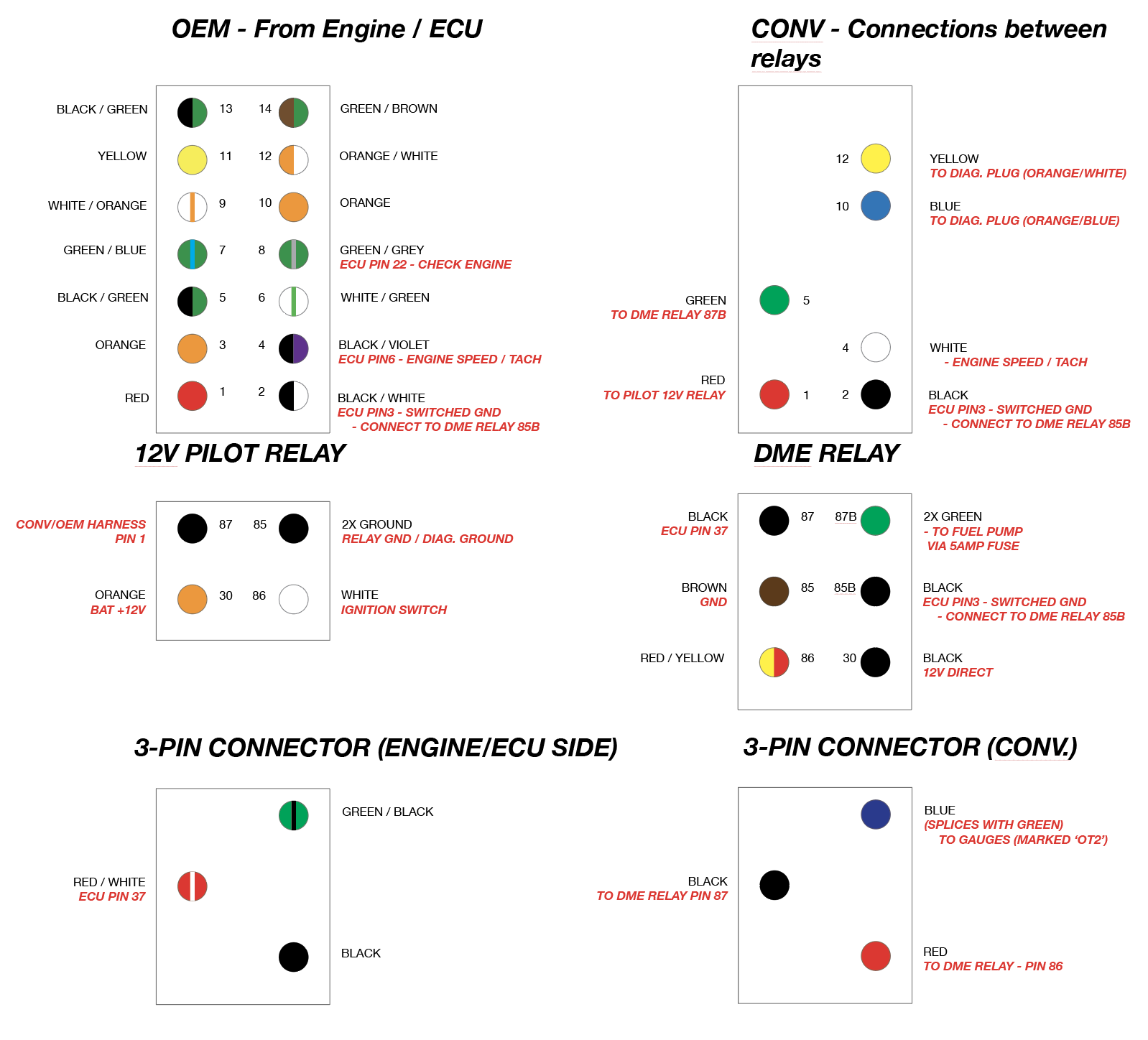 I've begun decoding the setup the previous owner had. While I originally thought I could simply copy the setup from @racerx9146 - this was not the case as the original relay board has already been bypassed. No matter, his diagram is still an incredible help when it comes to the pin callouts on the DME relay. If anyone can help identify wires, especially when it comes to the OEM 14-pin connector, that would be very appreciated. I'm hoping to be able to figure this out myself over the course of time-off during the next week, or at the least, make a big-enough dent to be able to have a shop take it over and get it running. |