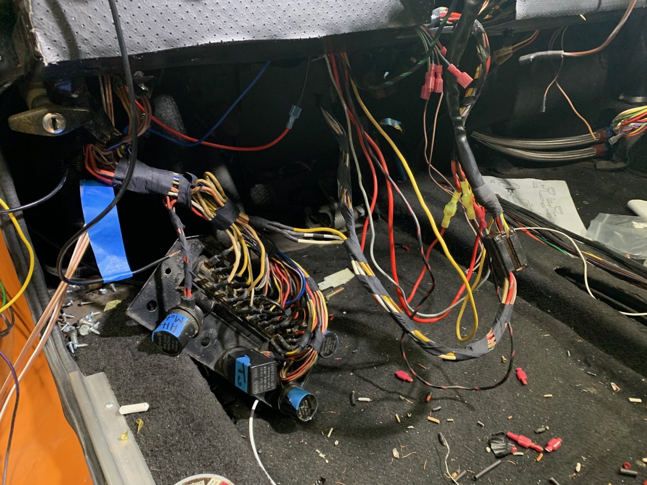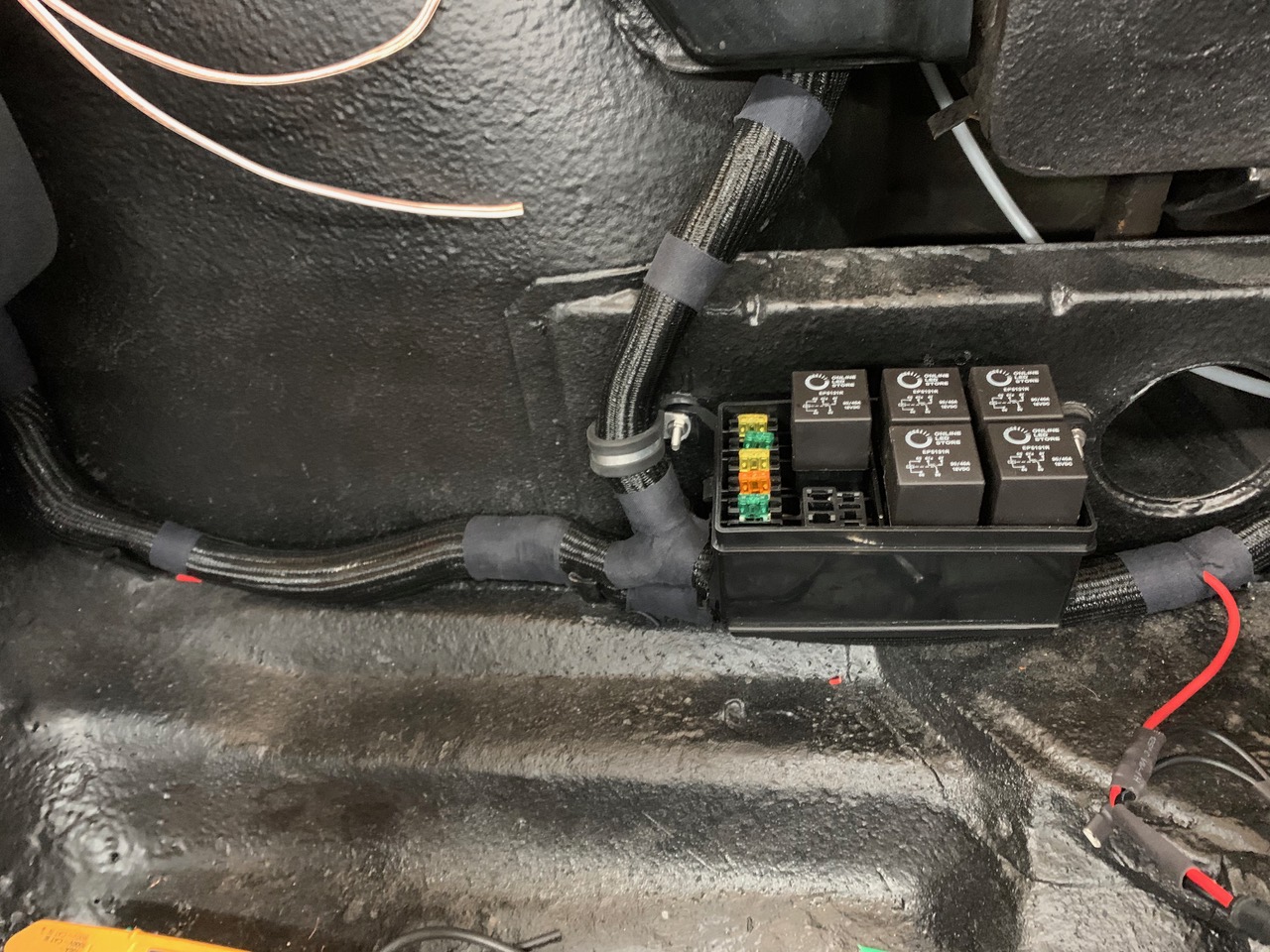 Happy to say I'm 'wrapping up' the front trunk harness. Decided to move away from the 'stock look' of wrapped tape, and go with something more modern. This is also safer for the 2x new +12v lines I added below the tank for items in the front trunk.
