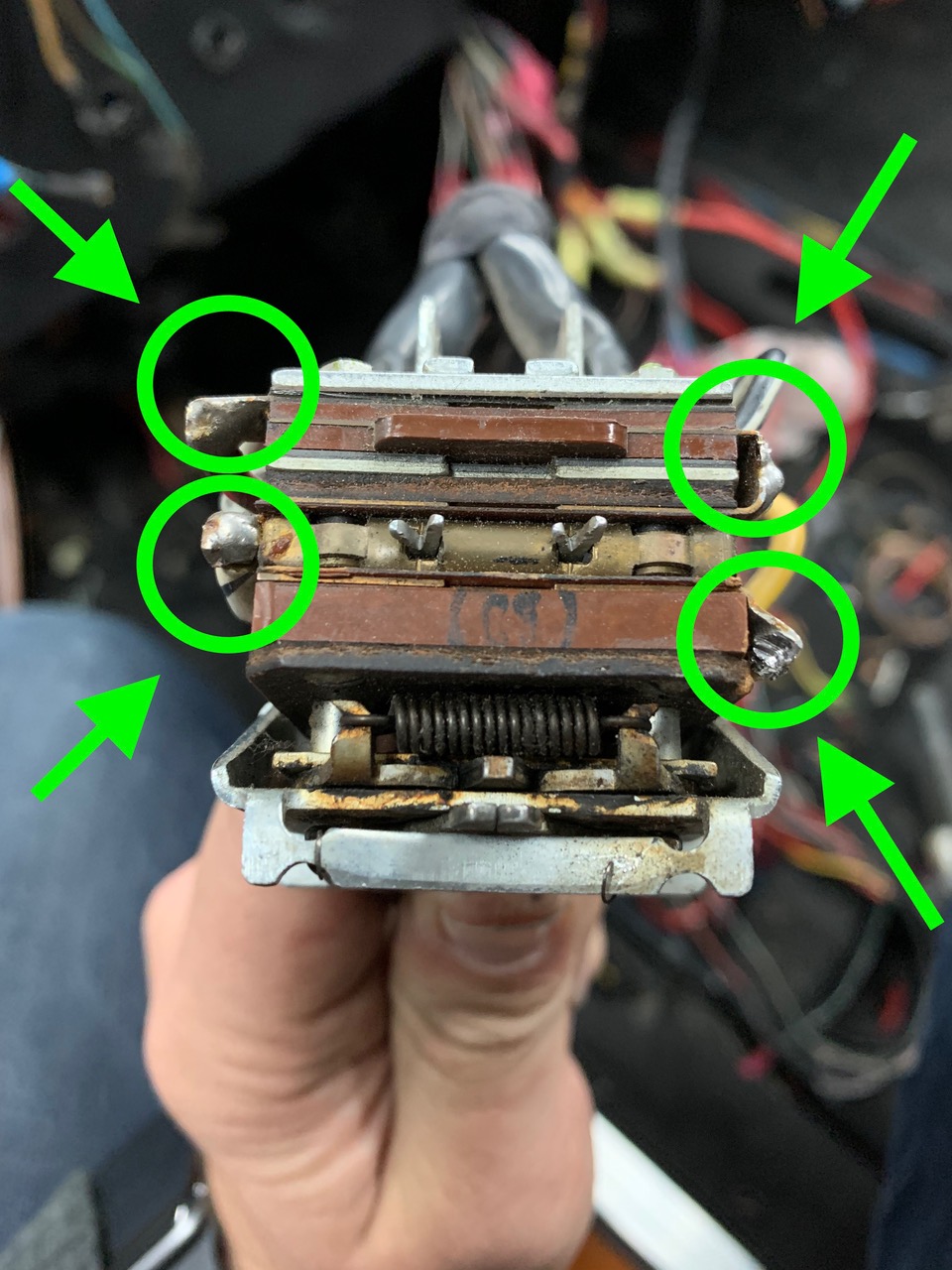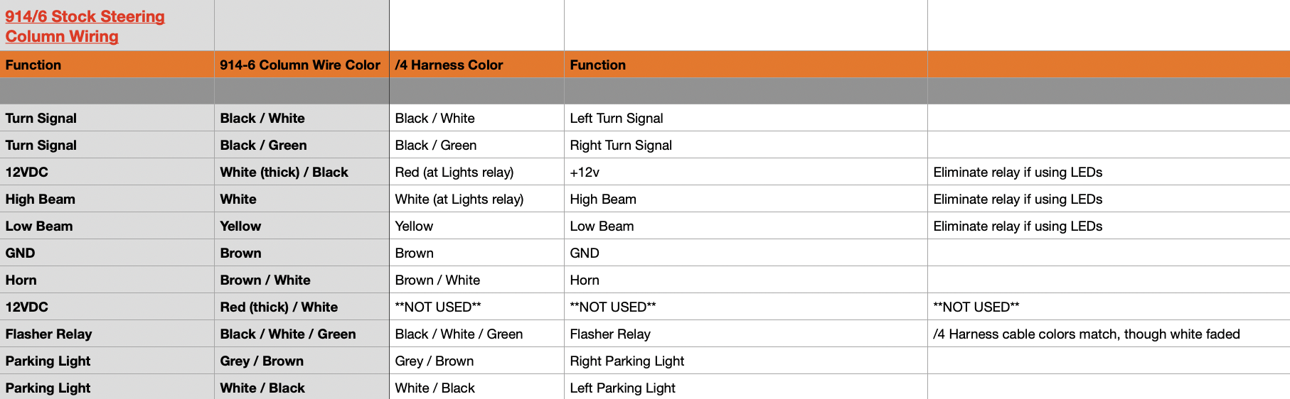 NOTE: My car is a 1970 914-4, with a 1975 modified wiring harness using various 914-6 / 964 parts For those readers following this thread using an actual 914-6 on a 914-4 harness, see page 40 of this build-thread. Essentially, one will need to eliminate the stock 914/4 headlight relay (attached in this post - first photo circled in neon green), which can become troublesome as then the 914-6 switch (possibly the same for 911 conversions) takes the entire load of the hi-lo beams and can lead to the contacts burning out. This would result in the need to install a different relay(s) OR simply converting to LEDs. My take? Ditch the stock relay, pay the $120 to 914rubber, and call it a night. Furthermore, make sure that the contacts on the 914-6 turn signal / light switch are bent and not protruding too much (see the second photo, also highlighted in green). The bracket / cradle that allows this switch to attach to the steering column only allows a bit of clearance. In my case, my high-beam was grounding out against the column, and I nearly burnt-out my switch, 12-pin connector, and some of my wiring harness. Learn from my mistake! Specifically for the headlights, the wire-conversion is as follows... Attached thumbnail(s) |
