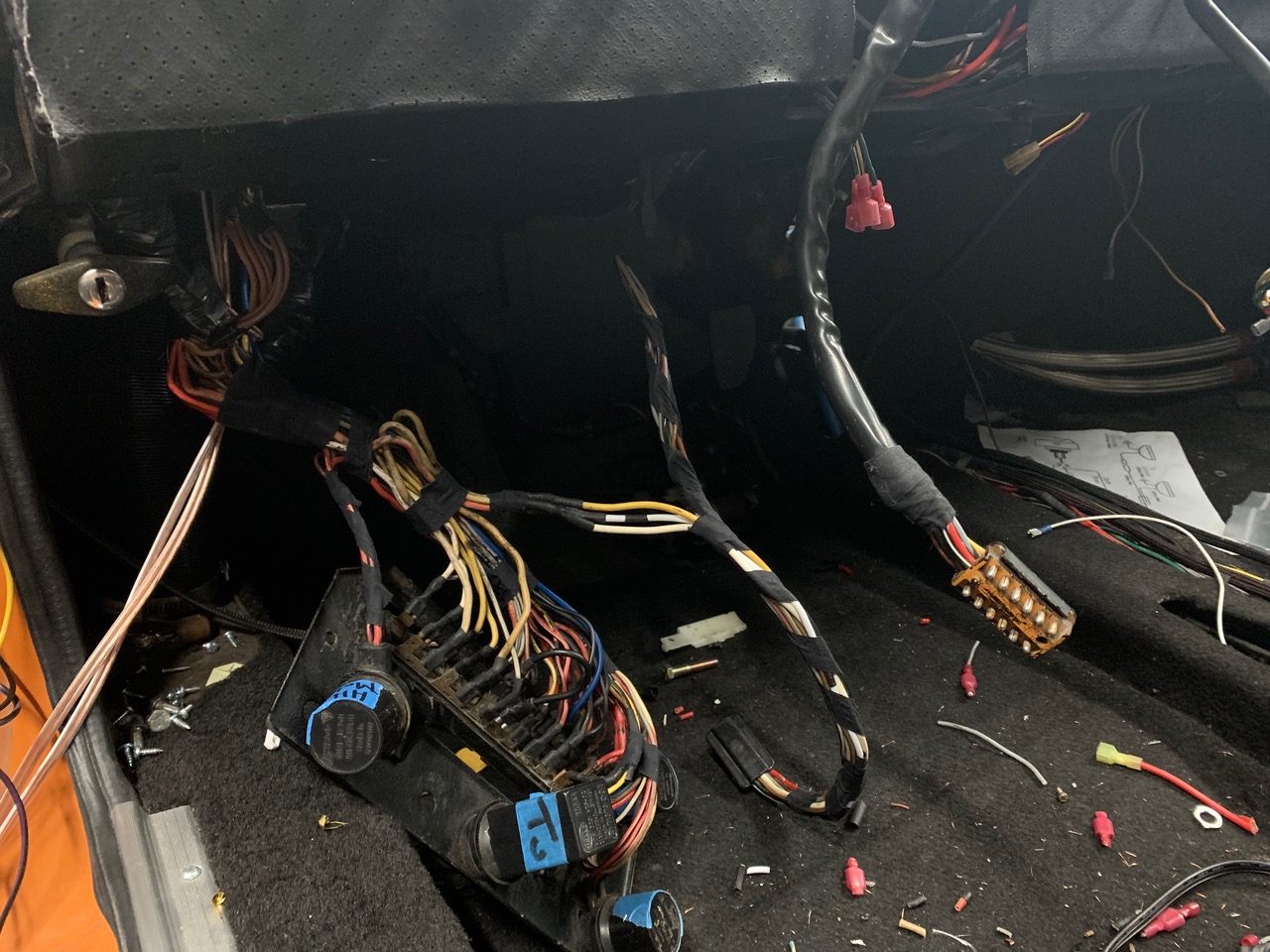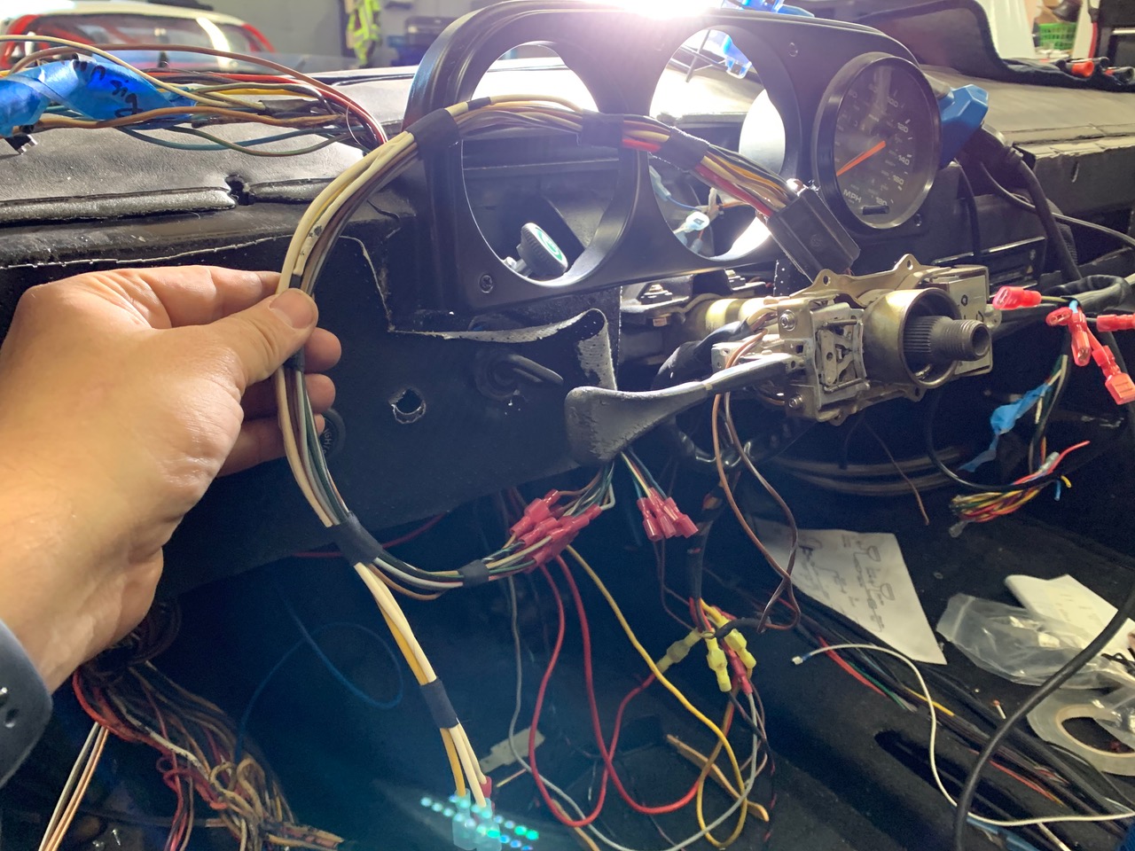 First order of business was to wrap up the wiring for the three primary gauges dash; Speedometer, Tachometer, Oil Temp / Oil Pressure. Center console to follow, though thats significantly easier (Fuel Level, Oil Level, Clock with Status lights). This was easy enough, given the 964 diagram. Photos and references to come. In addition to connecting up a few items that didn't really exist before, I left 3x 'extra wires' that run back to the ECU for future use. All connections work, and I only have 4 wires that I have to figure out (Speedo signal, Oil Pressure Sender, Tach +12v and Tach signal) and I was even able to run 2x new lines to differentiate between Right and Left Turn-signals. I'm not 100% familiar with the different icons from the 964, so I'm thinking to make my 'idiot light' the big 'EXCLAMATION MARK' signal found on the Oil combo gauge. Done here for now, once everything is tested, I'll probably wrap in the same manner to match the rest of the harness. (IMG:style_emoticons/default/bye1.gif) ![]() ![]() |
