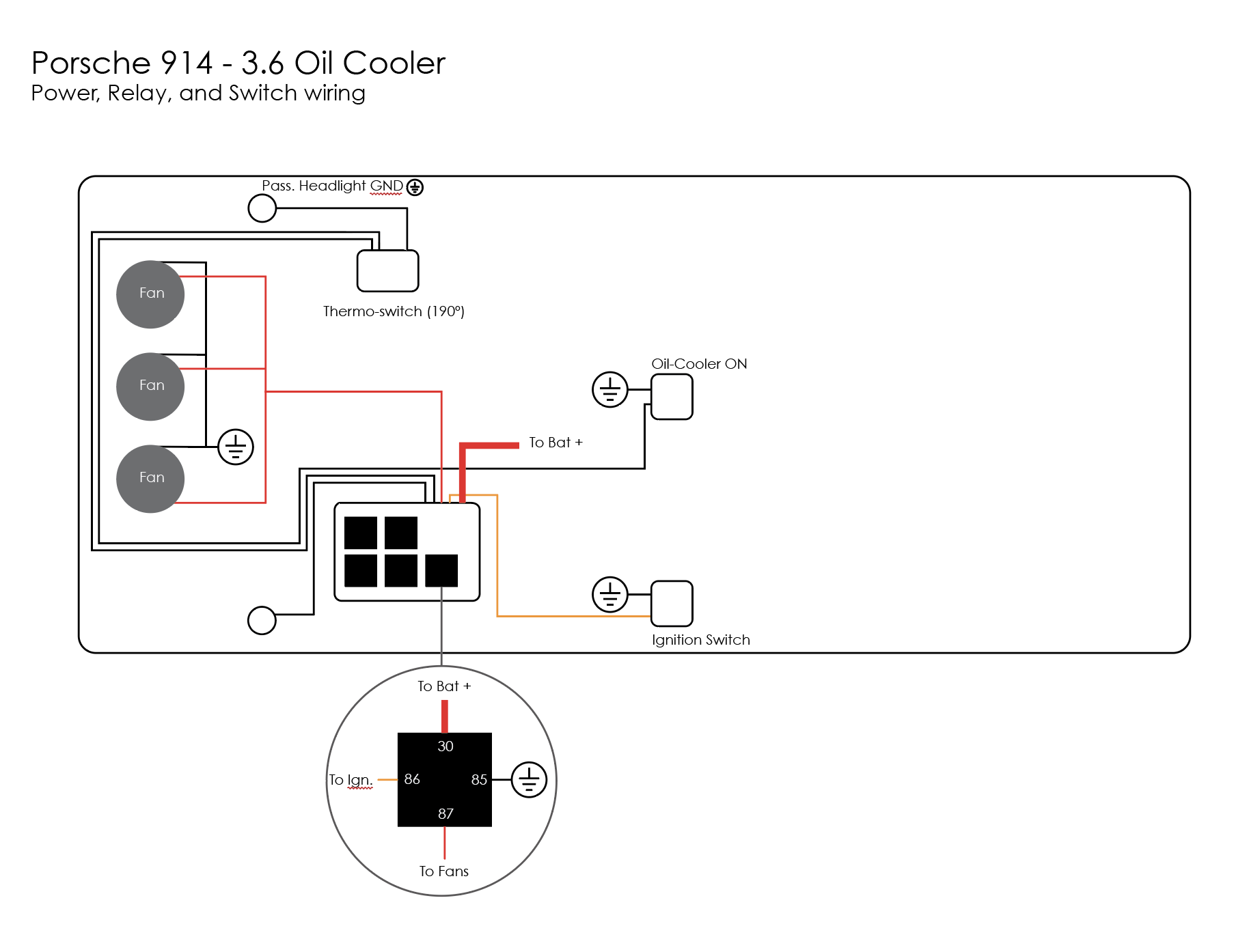 The relay box up front is now 100% active. Turning on the ignition powers the fuel-pump relay, need to decide if its through the DME or a new relay (more on that later) as well as power to the oil-cooler fans, controlled by the thermo-switch. Additionally, I added a dash-mounted switch in case the thermo-switch fails, diagram and a few reference photos below.