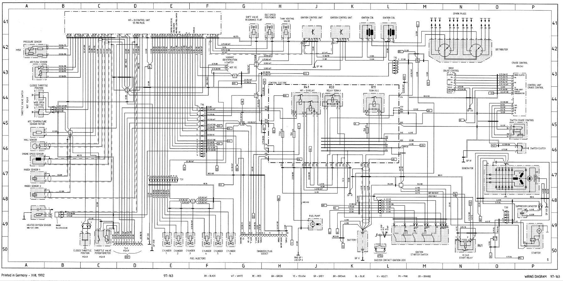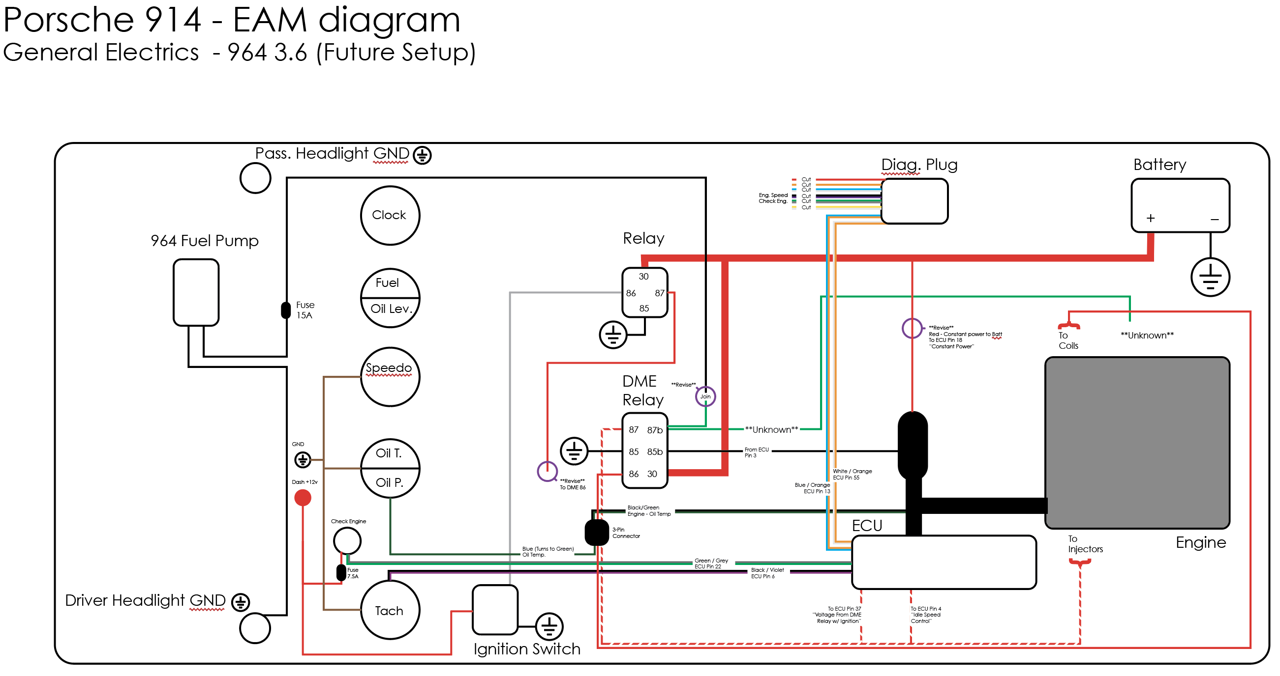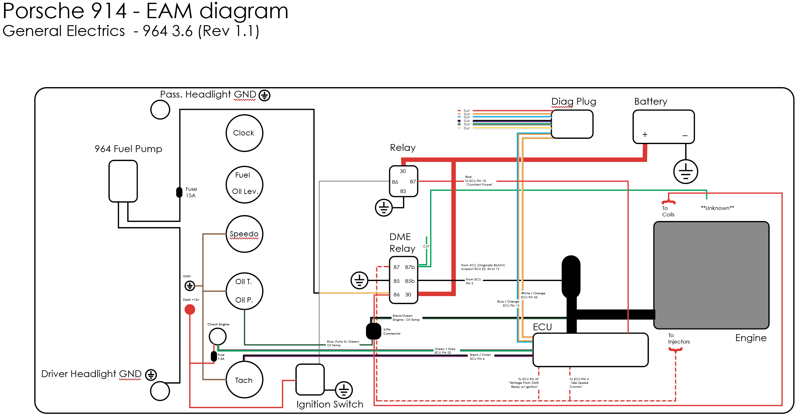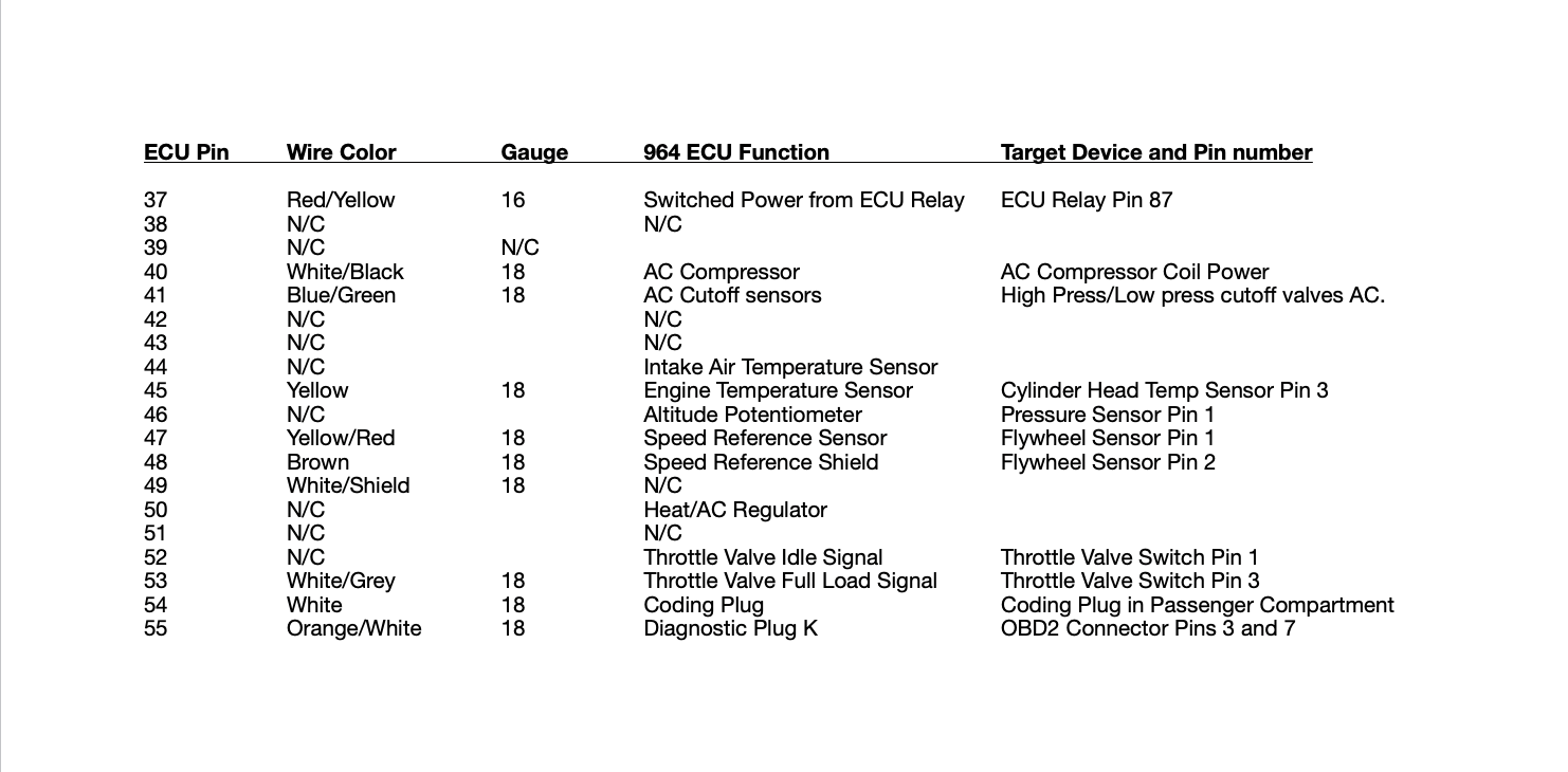 Inserted below is an Excel spreadsheet I made to put my 964 motor in. It may help you, but it does have some specific notes in it about my car. I am also attaching the 964 engine wiring diagram, which contains the DME relay and the ECU. I hope it helps. Let me know if you need any more info. Clay ECU Pin Wire Color Gauge 964 ECU Function Target Device and Pin number 1 White 14 Ignition Modules Signal Igniton Control Mudules 1 and 2 Pin 5 2 Brown 14 Ignition Modules Ground Igniton Control Mudules 1 and 2 Pin 3 3 Black/White 18 Fuel Pump Relay Fuel Pump Relay pin 85 4 Black/Red 18 Idle Speed Control Idle Speed Positioner pin 2 5 N/C Tank Venting Valve Tank Venting Valve pin 2 6 Red/Blue 18 Tachometer Output 914/6 Relay board Engine plug pin 2 7 Blue/Green 18 Air Flow Meter Signal Air Flow Meter Pin 2 8 White/Shield 18 Hall Sensor Signal Hall Sensor Pin 2 9 Red/Black 18 N/C 10 Brown 18 Oxygen Sensor Shield Ground Ground on Body at battery cable. 11 Green/Shield 18 Knock Sensor Number 1 Knock Sensor Number 1 Pin 2 12 Blue/Gray 18 Air Flow Meter Power Air Flow Meter Pin 3 / Pressure Sensor Pin 3 13 Blue/White 18 Diagnostic Plug Lead L OBD2 Connector Pin 15 14 Brown/Red 14 Ground Ground on Body at battery cable. 15 N/C Injector Number 3 Fuel Injector Number 3 Pin 1 16 Gray 18 Injector Number 6 Fuel Injector Number 6 Pin 1 17 Gray/Black 18 Injector Number 1 Fuel Injector Number 1 Pin 1 18 Red 16 Always on Positive ECU Power Battery via Auxuiluary Fuse Box in Engine Compartment. 19 White 16 Ground Ground on Body at battery cable. 20 N/C N/C 21 Black/ 18 Diagnostic Plug Knock Indicator OBD2 Connector Pin 11 22 Black/White 18 Check Engine Light added to bottom of Tachometer / OBD2 Plug Pin 9 23 Blue/Red 18 Resonance Plate Shift Valve Resonance Flap Pin 2 24 Brown/Yellow 16 Ground Ground on Body at battery cable. 25 Yellow/Red 18 N/C 26 Green/Red 18 Air Flow Meter Ground Air Flow Meter Pin 4 27 Black 16 N/C 28 Green/Shield 16 Oxygen Sensor Signal Oxygen Sensor Pin 1 29 Green/Shield 16 Knock Sensor Number 2 Knock Sensor Number 2 Pin 2 30 Brown 18 Shield for Knock Sensors, Hall Sensor and Knock Sensor Ground. Ground on Body at battery cable. 31 Yellow/Gray 18 Positive to Hall Sensor Hall Sensor Pin 3 32 Red/Green 18 Comsumption Gauge 33 Green/Blue 18 Injector Number 5 Fuel Injector Number 5 Pin 1 34 Gray/Red 18 Injector Number 4 Fuel Injector Number 4 Pin 1 35 Green/Blue 18 Injector Number 2 Fuel Injector Number 2 Pin 1 36 Red/Black 18 N/C 37 Red/Yellow 16 Switched Power from ECU Relay ECU Relay Pin 87 38 N/C N/C 39 N/C N/C 40 White/Black 18 AC Compressor AC Compressor Coil Power 41 Blue/Green 18 AC Cutoff sensors High Pressure/Low pressure cutoff valves for AC. 42 N/C N/C 43 N/C N/C 44 N/C Intake Air Temperature Sensor 45 Yellow 18 Engine Temperature Sensor Cylinder Head Temprature Sensor Pin 3 46 N/C Altitude Potentiometer Pressure Sensor Pin 1 47 Yellow/Red 18 Speed Reference Sensor Flywheel Sensor Pin 1 48 Brown 18 Speed Reference Shield Flywheel Sensor Pin 2 49 White/Shield 18 N/C 50 N/C Heat/AC Regulator 51 N/C N/C 52 N/C Throttle Valve Idle Signal Throttle Valve Switch Pin 1 53 White/Grey 18 Throttle Valve Full Load Signal Throttle Valve Switch Pin 3 54 White 18 Coding Plug Coding Plug in Passenger Compartment 55 Orange/White 18 Diagnostic Plug K OBD2 Connector Pins 3 and 7 |