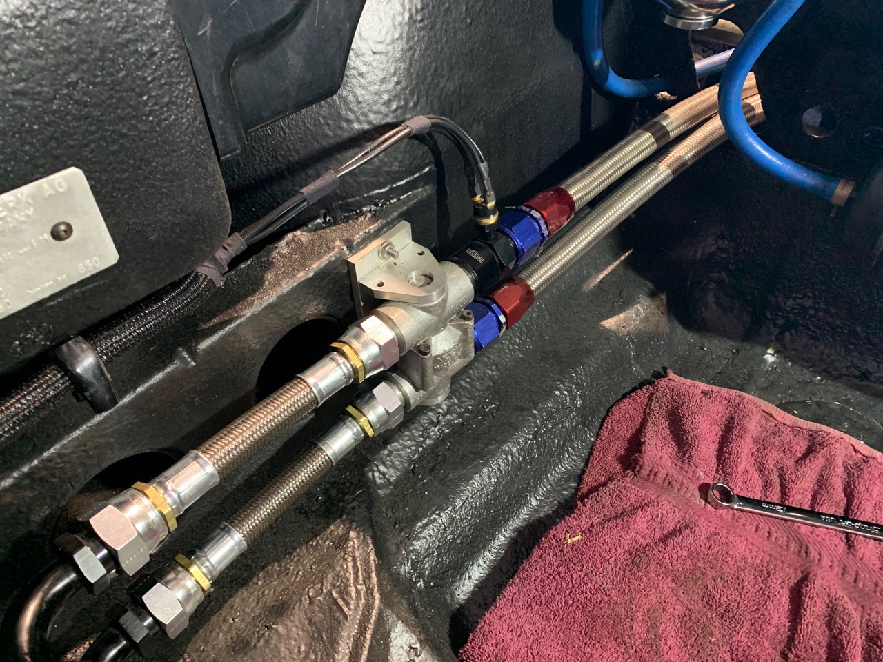 First order of business was getting it in. After, I was finally able to wrap-up the oil system with lines I had made at Parker. Though they were a bit on the expensive side ($128) for the set, it was much easier than making and fitting the braided lines, as these last pieces are only 7', and it's extremely difficult when they are that short with a fitting on each end. To make it all match, thinking to do a small connector for the other-side, and get rid of the ugly Blue and Red fittings, but thats not super important. (IMG:style_emoticons/default/bye1.gif) |