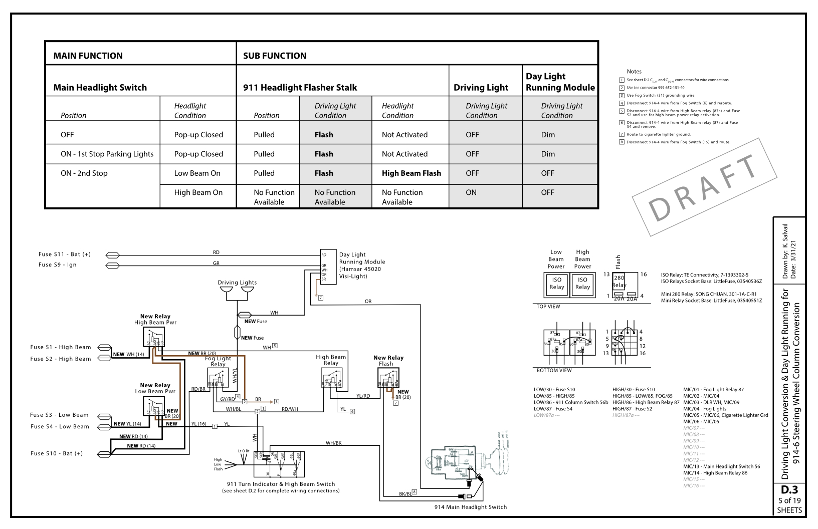 For my 914-6 ignition switch conversion, I am using the stock 1974 dash with Restoration Design's PP360 "Dash section for Ignition." Since I am using the 1974 dash, I lost a dash switch opening and decided to eliminate the fog light switch and run driving lights like a 914-6 with the 914-6 flash operation as well. In order to protect the column switch, I looking to add power relays to provide full power to the lights, like @JWest JWest Engineering "911 Headlight Relay Kit." I am also adding a DLR module to use the driving lights as daylight running lights. |
