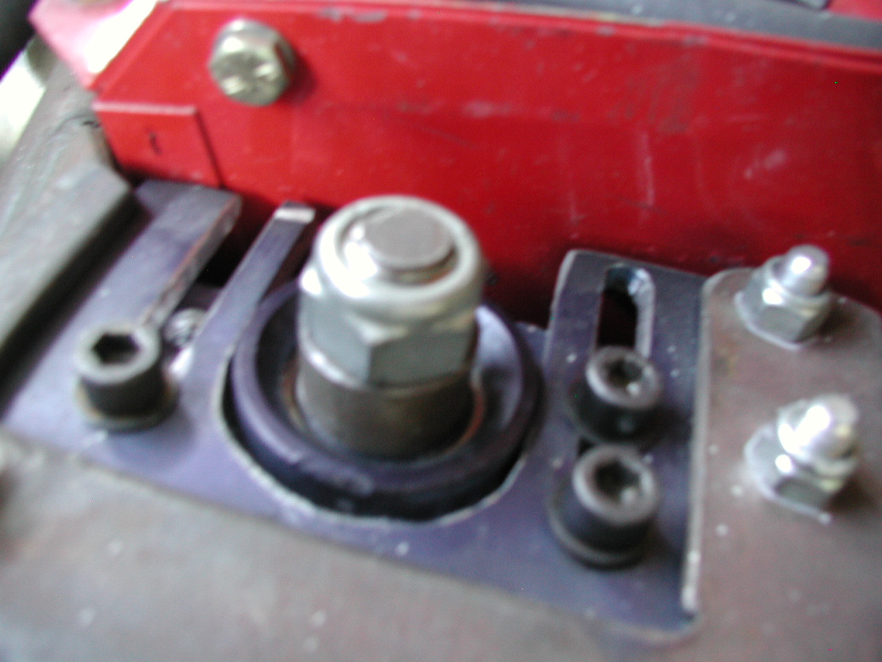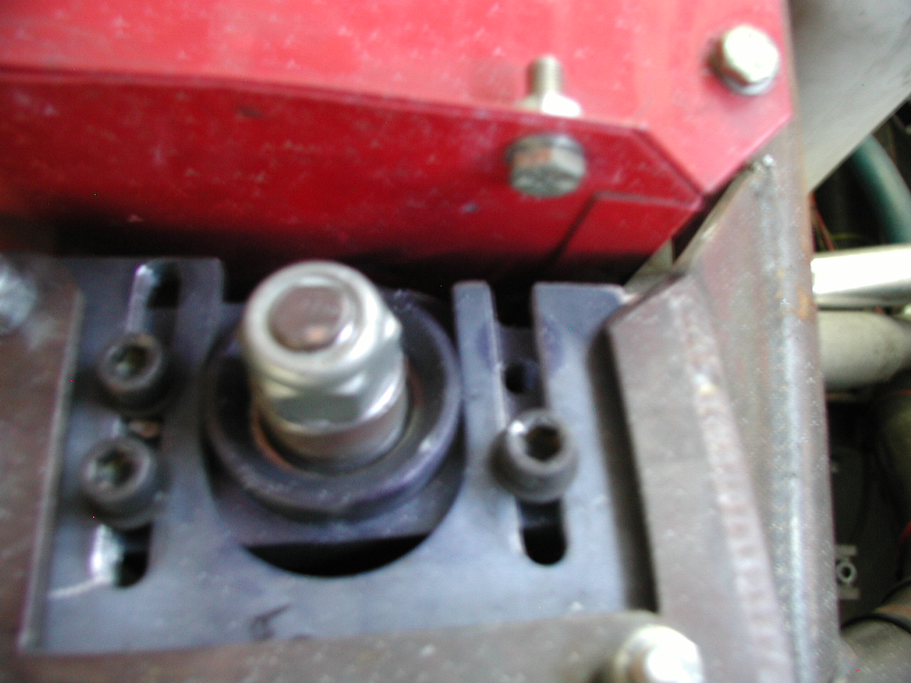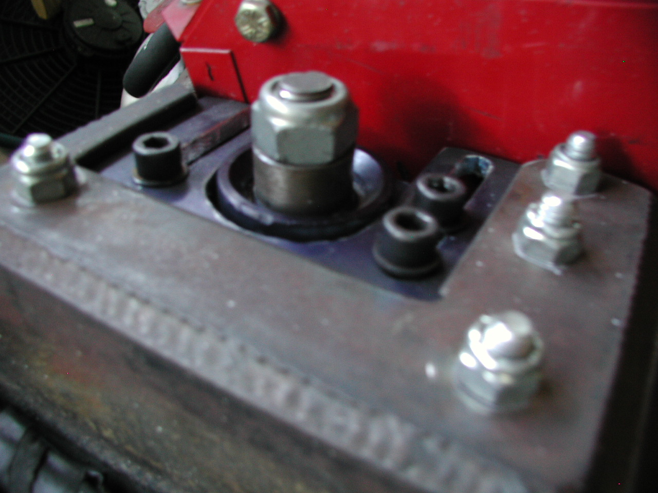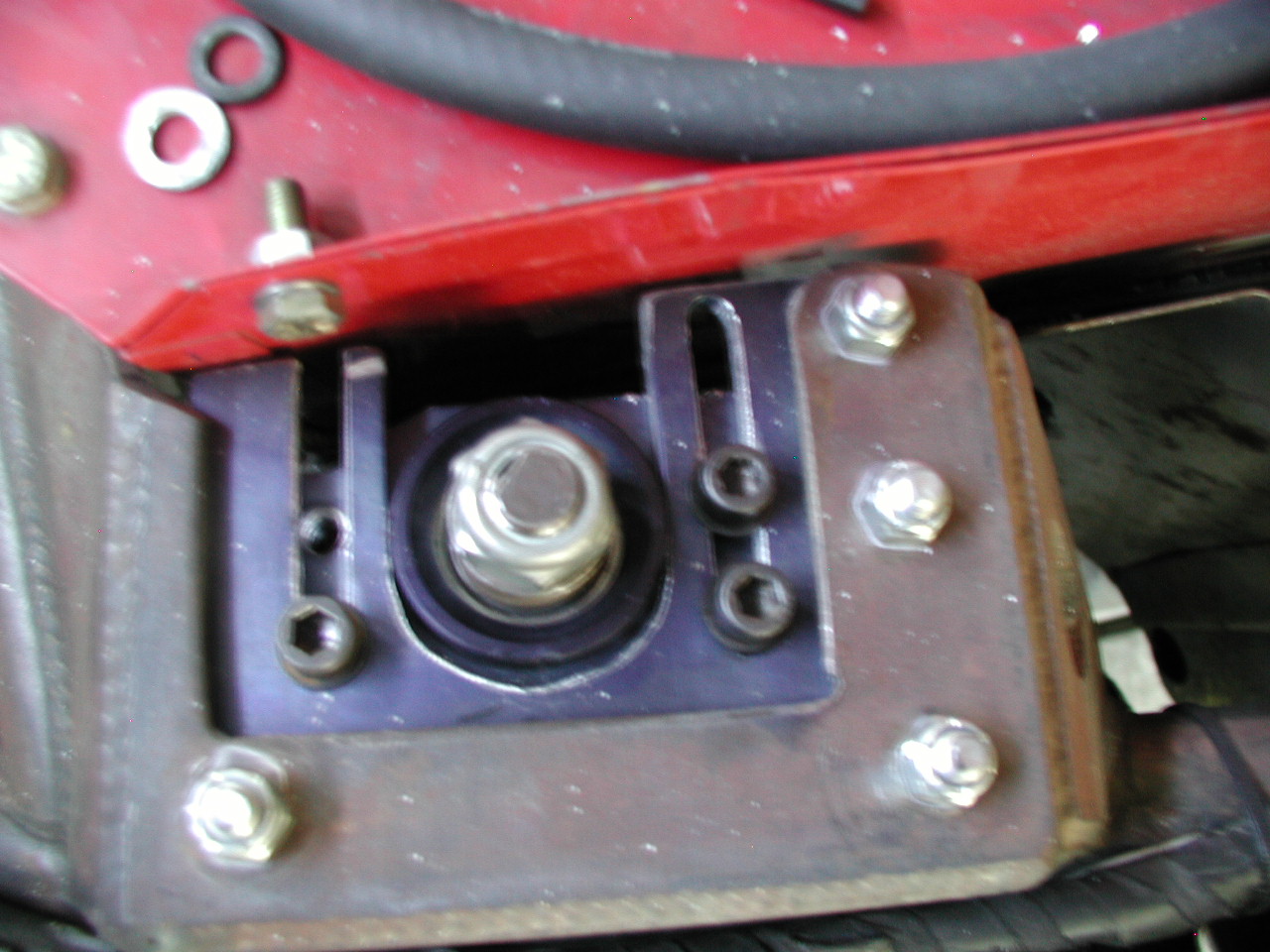 now for their shitty upper mounts - AJ and I finally gave up dicking with them, and basically made the best of a bad situation, hacked them to tuck near the cell to ensure I could get enough camber range, and I was left to rely almost completely on the lower arms for camber and completely for caster. Notice how one bolt is missing but also notice how boogered and hammered the threads are - that is where they forced the fourth bolt in before shipping to me (sorta grainy cuz my digital cam has a hard time focusing that close but you will get the point)
