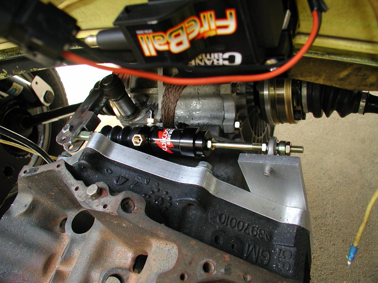 note this had a rod end and a super simple bracket to hold the slave to the engine - the clutch was so stiff it bent that rod end day 1 (they aren't supposed to be used in shear and I know better so I expected it), so I instead welded up a steel 90deg bracket to attach to the back of the V8 with the adapter mount bolts.