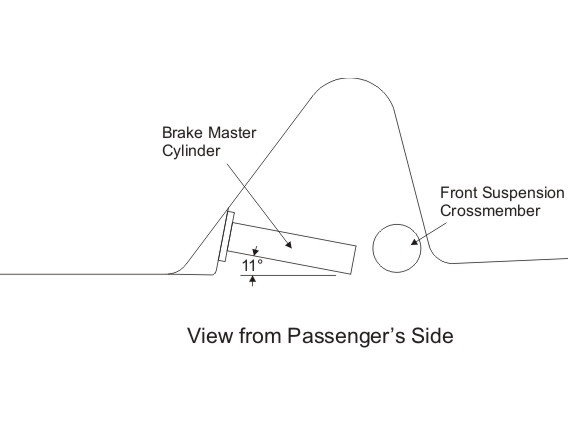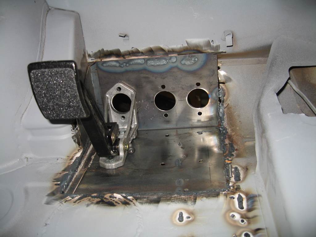 Made a template of 16 gauge sheet metal with this pattern. Folded it at the line to 90 degrees. Cut a hurking hole in the floor and welded it in. Here is a view from inside the compartment. Using wilwood pedals Another view form inside the drivers compartment. For Cylinders I'm using Tilton 75-series Master Cylinders as they are quite short and won't interfere with the rack. |