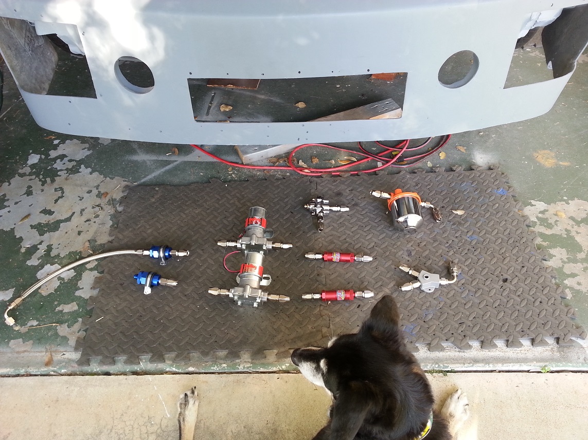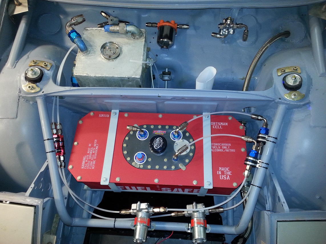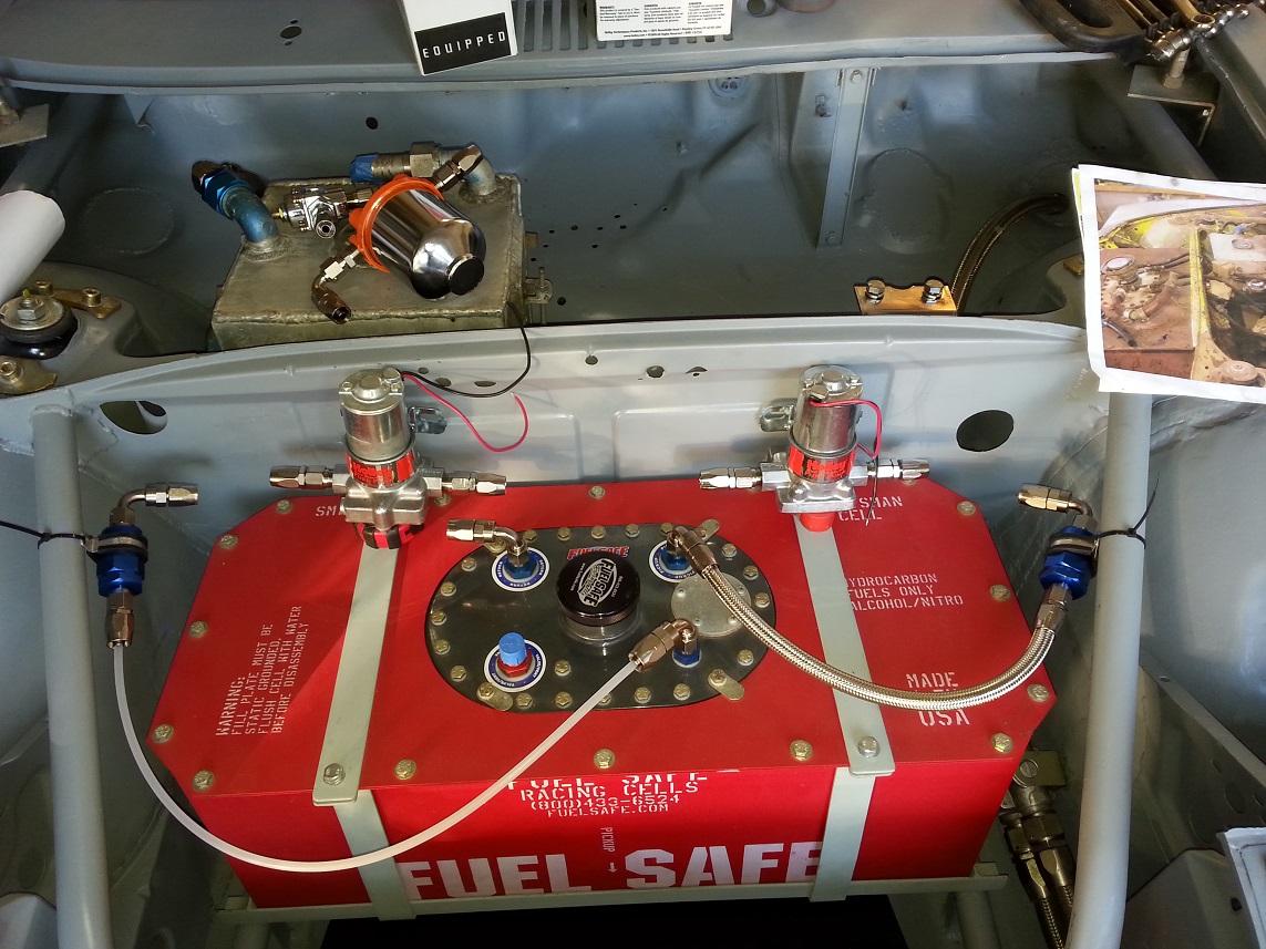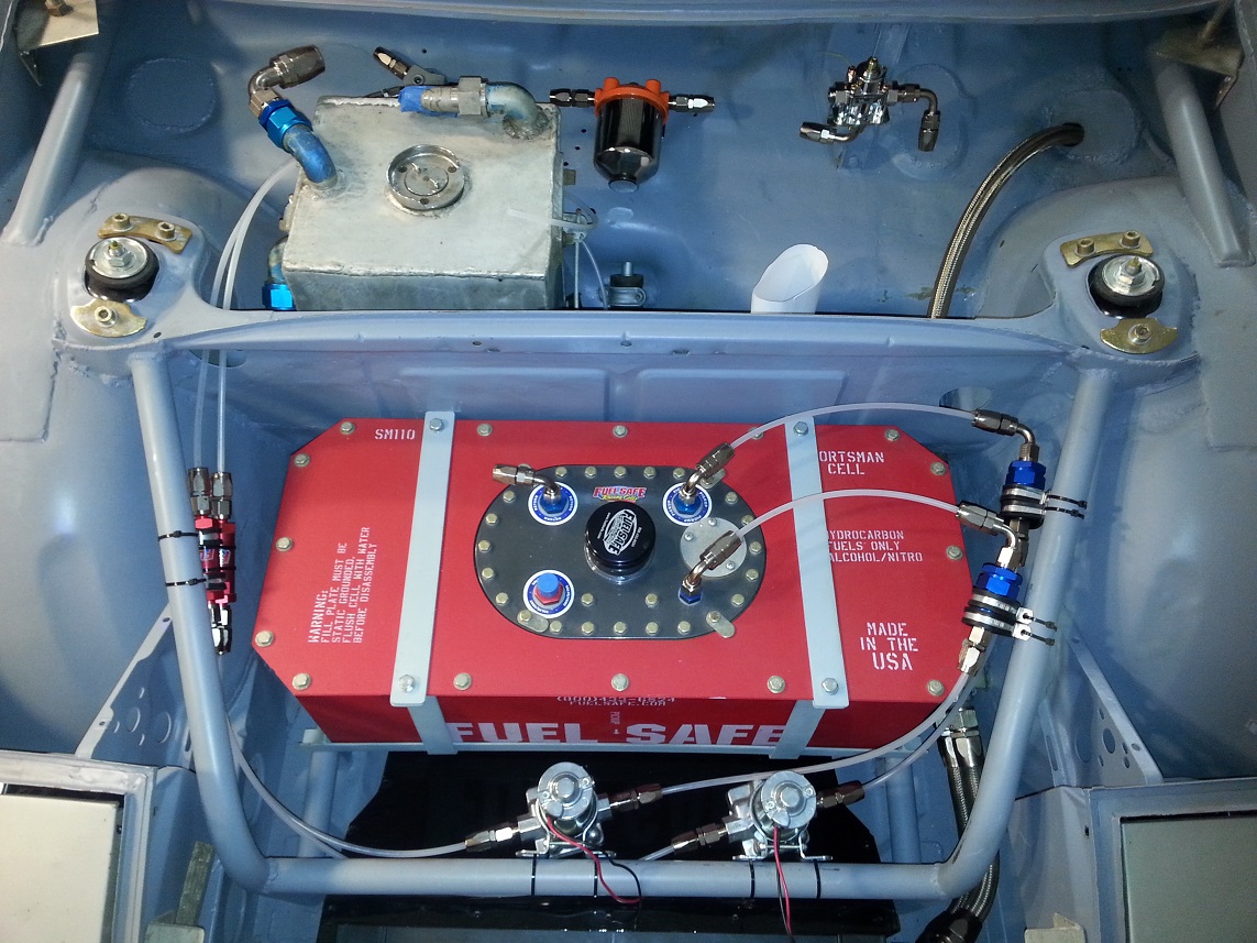 Then through the bulkheads to the front trunk. The line does not touch the fitting. Laying out all the parts for the dual pump fuel system. I need to find a home for all these in the front trunk area. Start playing with various locations. Using aquarium line for the mock up. This does not look promising. Keep playing with it. A much better approach that does not mount any components on the fuel cell or its straps. Rotate the pumps to put them behind the cross bar. I think this is very close for these parts! I will weld some serious tabs to the cross bar to mount the fuel pumps. They are Holley red pumps and weigh 3 pounds each. Still need to figure out a couple more fuel components. I need to make sure all parts can be serviced or replaced and that the braided lines are not rubbing on anything, etc. The plastic zip ties are just for mock up. This took about 4 hours to figure out but was very satisfying when it came together. John |