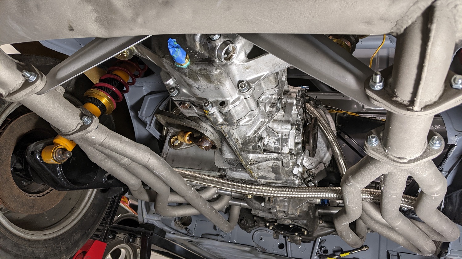 Mocking up the exhaust. I will add gaskets and lock nuts when I am satisfied with everything. I want to get all the various engine bay lines and parts in place to make sure everything will work together before finalizing anything. Need to add the axles, shift rod, clutch cable, etc. to complete the mock up. Want to make sure the oil lines are not touching the exhaust. Getting everything to fit and not interfere in the space available is one of the bigger challenges of building a customized car like this. Adding a muffler for the initial testing. There is no way I can run open exhaust in the neighborhood where I live without people calling the national guard. (IMG:style_emoticons/default/smile.gif) The muffler occupies the same central space where the original builders placed the transmission cooler, so I will have to figure out another location for it until I can install megaphones or some other kind of split exhaust system. At this point, I just want to get the car running and start debugging the various systems. Next steps are completing the oil lines. I want to keep the oil supply line at the same level all the way to the engine so that gravity will ensure there is oil waiting at the pickup point. I will make sure the oil line is not the lowest part of the car and is as protected as possible. The return line I may loop over the transmission on its way back to the front of the car. I think this will work because the oil is being actively pumped out of the engine into the return line. Does anyone see any problems with that approach? John |