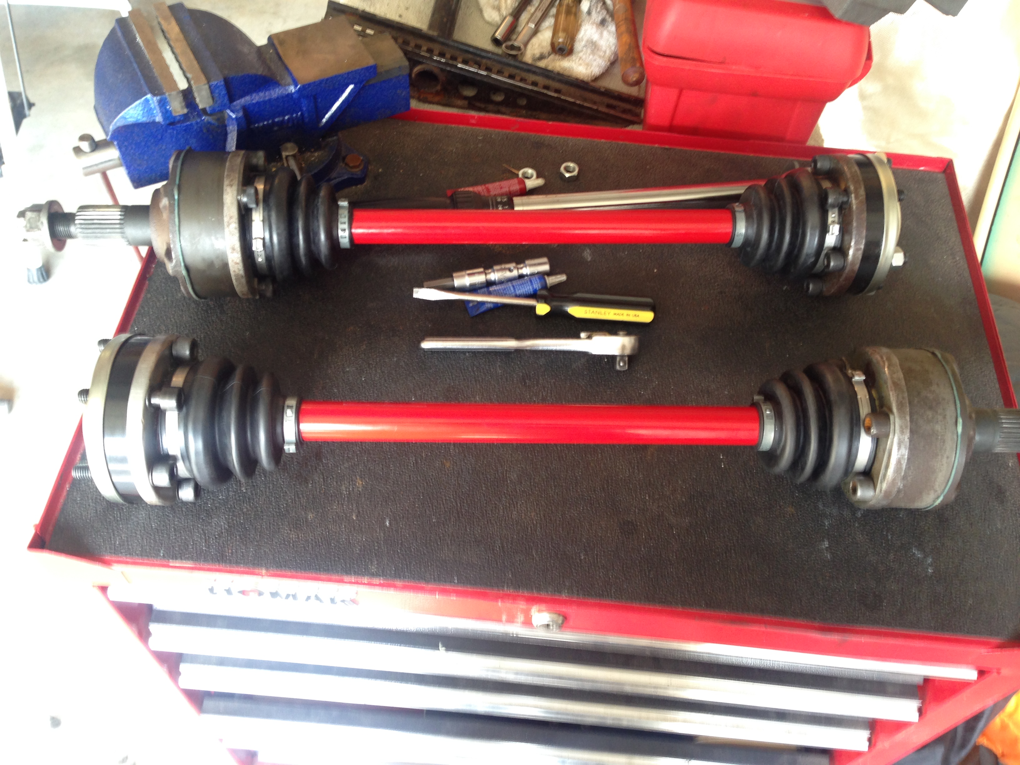 Eric can correct me if I'm wrong but since the sway a way axles are meant to float, I don't think the with of the cv's matter. You will need shorter cv bolts, something I've had difficulty finding.