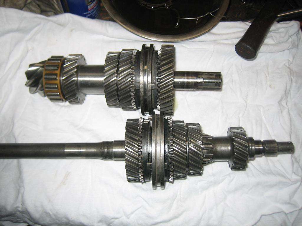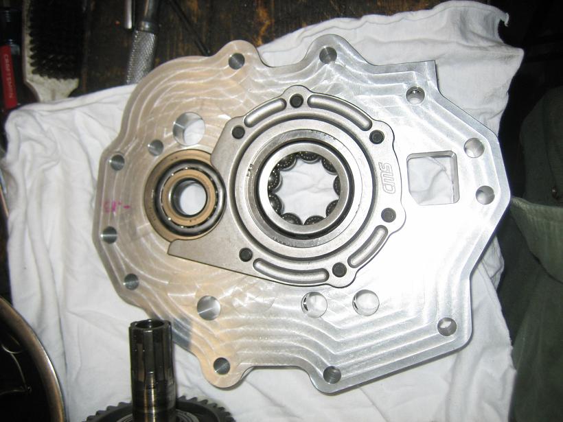Here are some pics of a tranny I am building for a customer. This is a factory LSD box that is getting converted to side shift, with billet plate and billet bearing retainer, and AFMSX gears. The customer sent me a few stacks to harvest parts from and the MSX gears. One of the cores had one of the nicest 1st sliders I have ever found in a core which means he just saved a lot of $$ (IMG:style_emoticons/default/smile.gif) Also, you may notice that the input shaft bearing in the int plate is of the better design with the steel cage, a very good part to have and was on one of the cores. So far, I only have these pics. The stacks, you may note the smaller gears, and the bling parts.