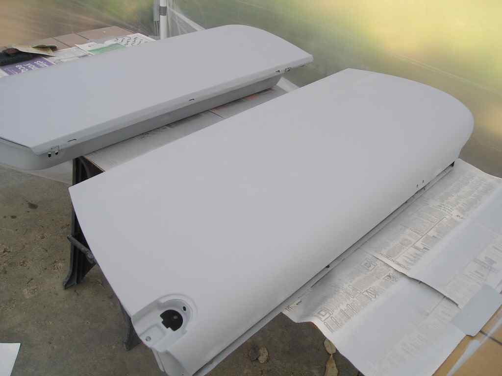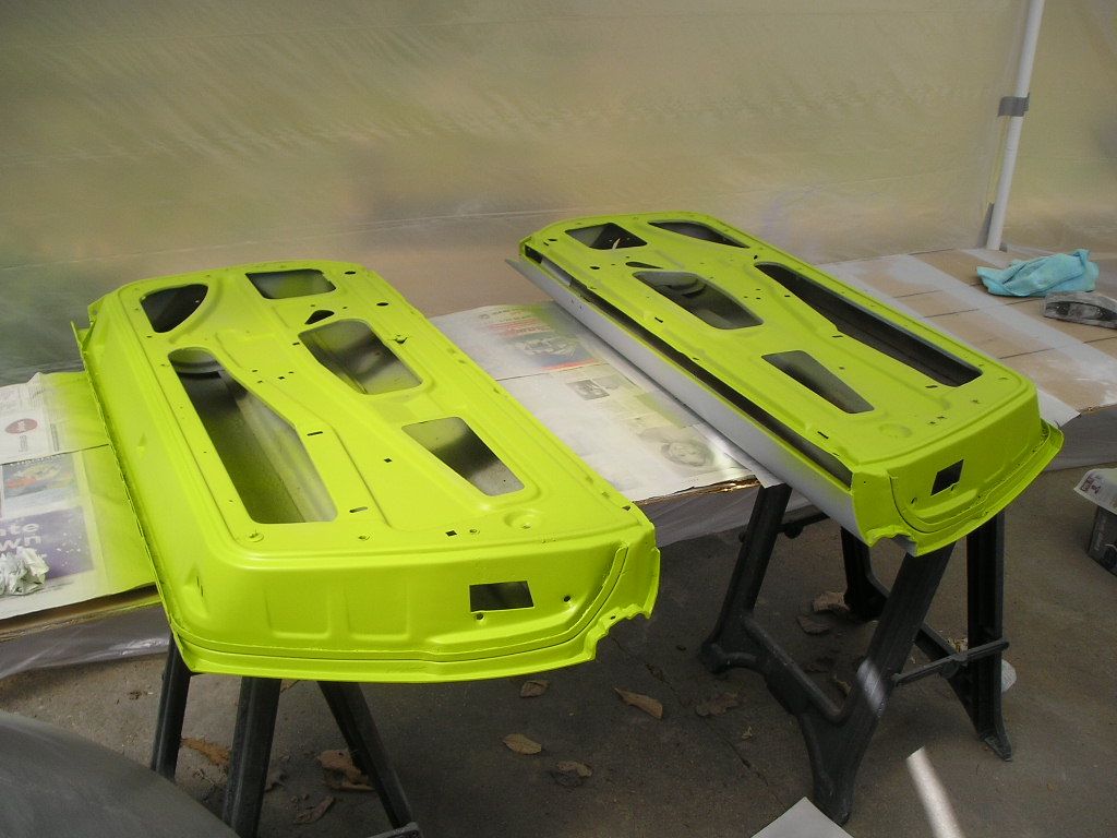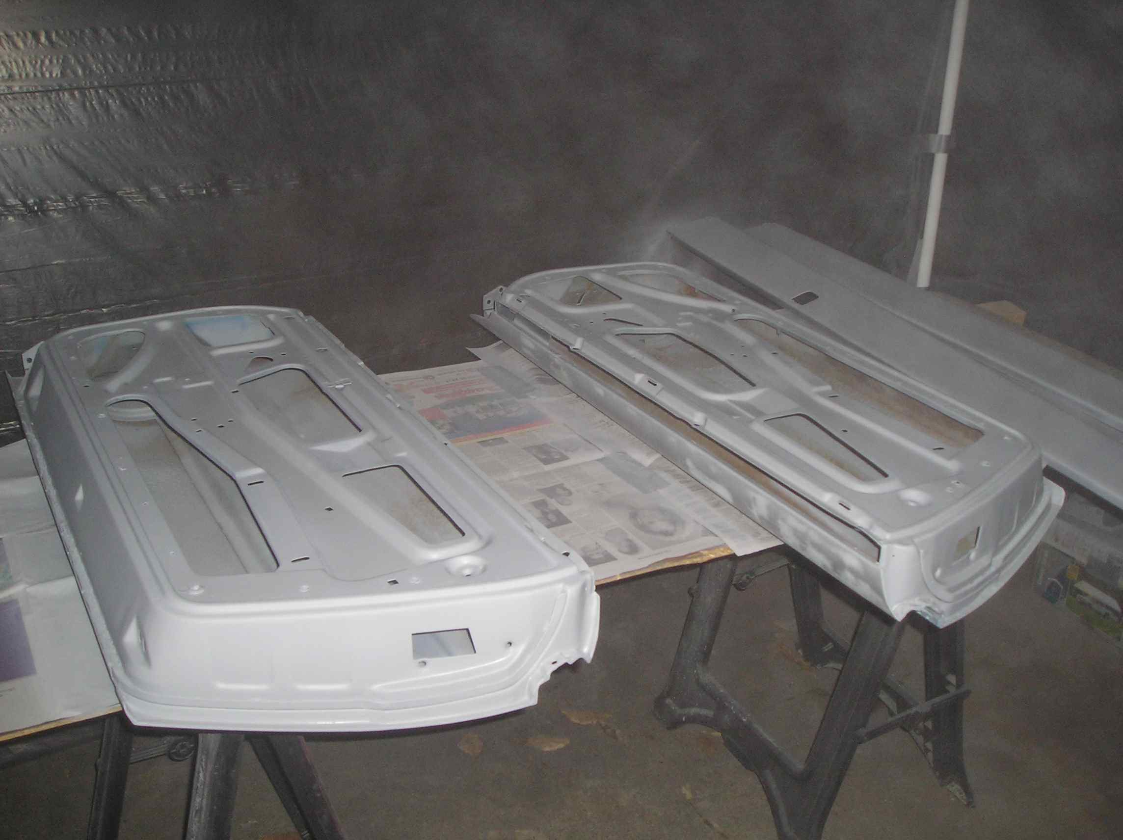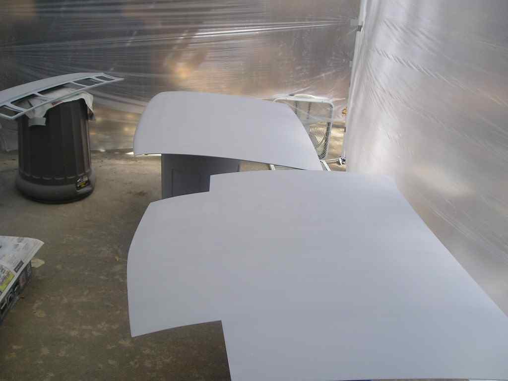 I finished up with sanding the doors, trunk lids, engine lid and the headlight covers. The body of the car still has a few small spots that need some sanding though. I went ahead and set up a paint booth so I could start getting some of this stuff primed. And priming I did! (IMG:style_emoticons/default/biggrin.gif)