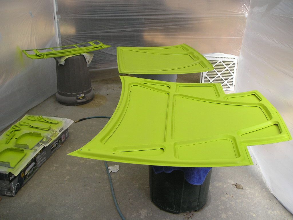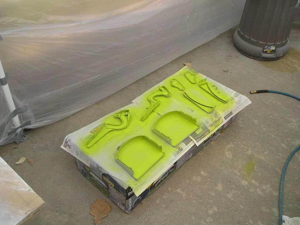 We bought this carpot/ canopy a long time ago to use for painting so I set it up yesterday and then draped plastic down the sides. It worked really well for my needs. (IMG:style_emoticons/default/smile.gif) I apologize for the pictures, it was getting dark by the time I stopped. This was my first time painting anything with a gun but I got use to it real fast and was surprised how well it started out. I primed the underside of the lids, the backside of the doors and some smaller pieces. Tomorrow morning I will turn everything over and prime the other sides. I will also get better pictures of everything. |