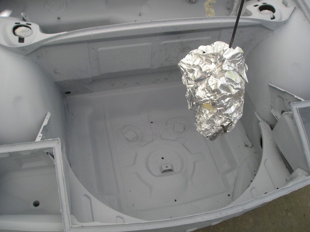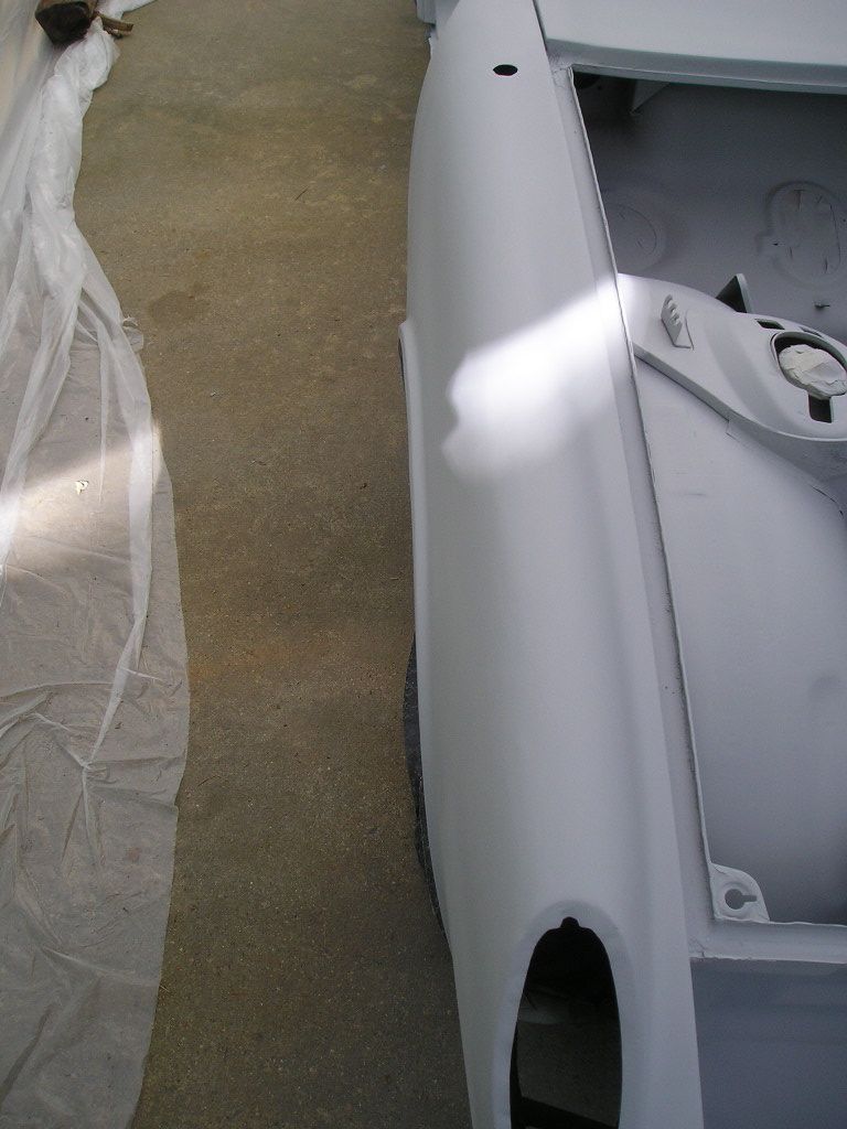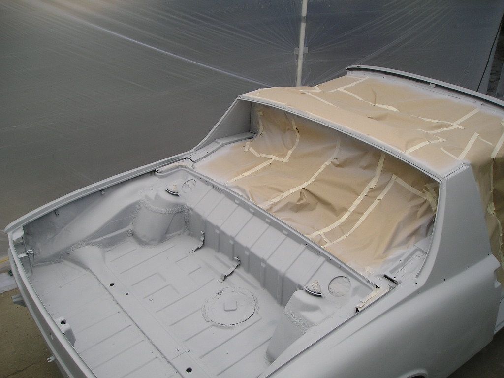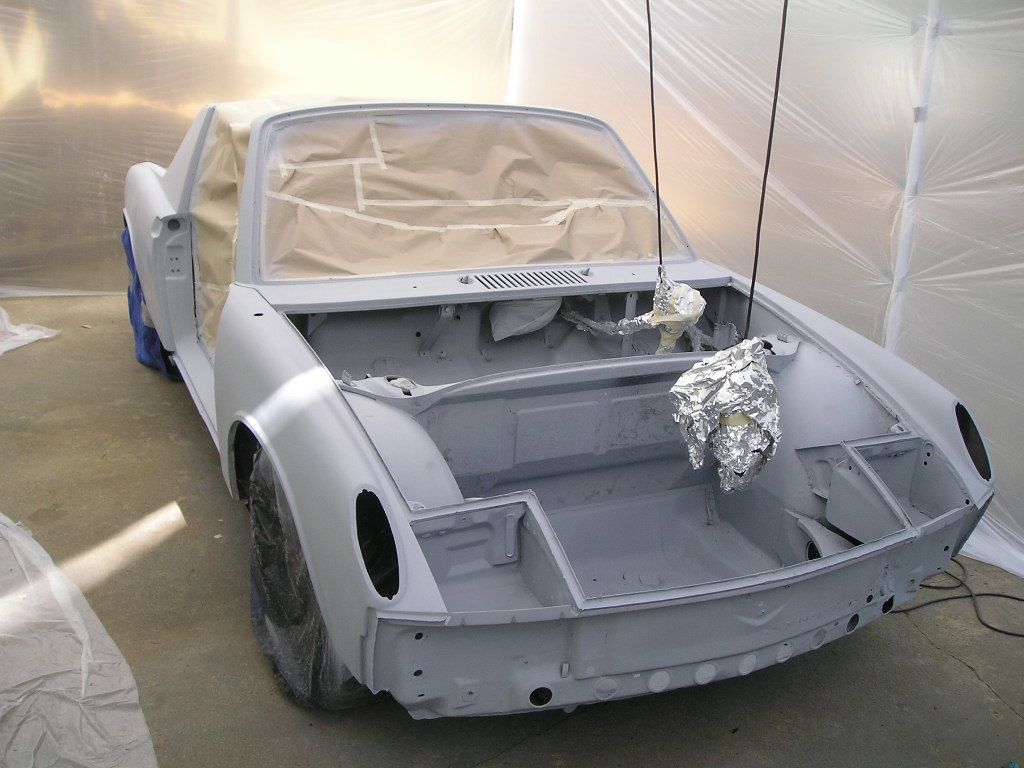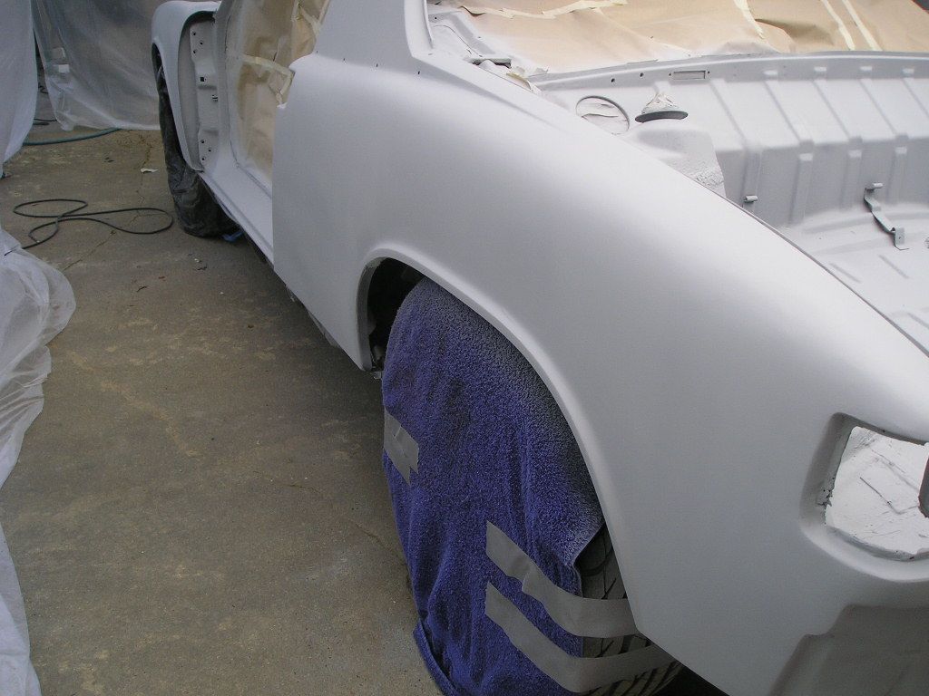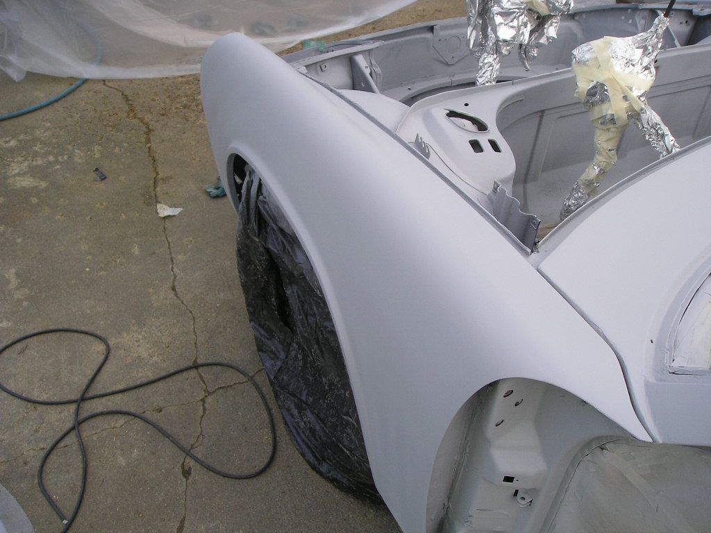 Yesterday it was too cold and rainy here to paint so I spent the day getting the body ready for primer. This morning I masked off the car and finished little things up, then this afternoon I shot the first few coats of primer on the body. Now I can see there are a lot of little things that need sanding and such.