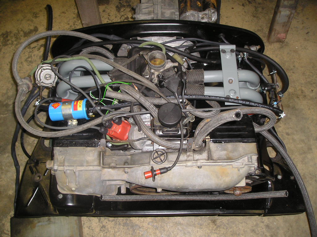 I finally got the motor all done. I ended up buying an ignition harness and oil temp wire from Jeff Bowlby as well. I just couldn't bring myself to putting the old ignition harness on along with the new engine harness. I also replaced all the fuel and vacuum lines as well as many other little things. Hopefully when I get the engine in, I won't have too many troubles and if I do, they will be easy to track down. Here is a picture of the engine...