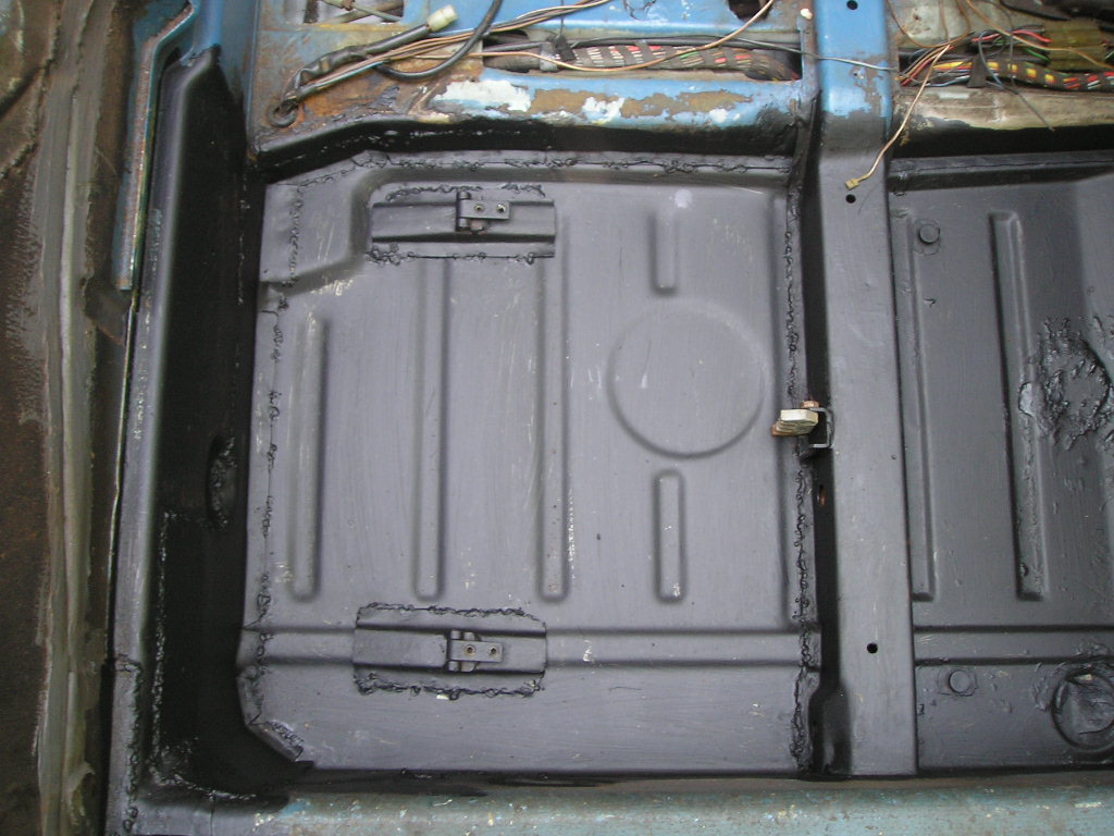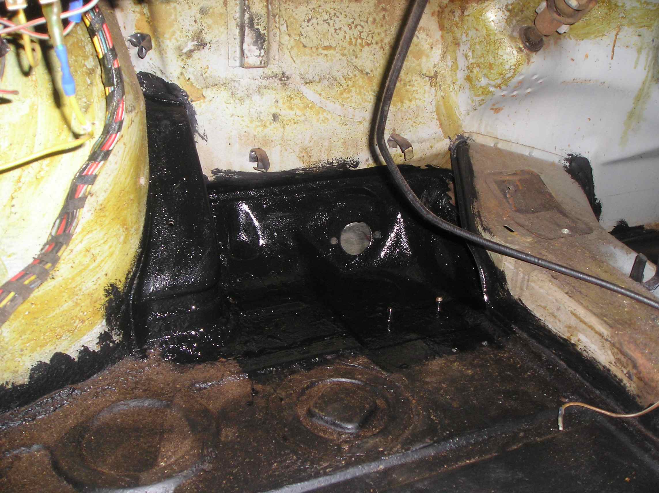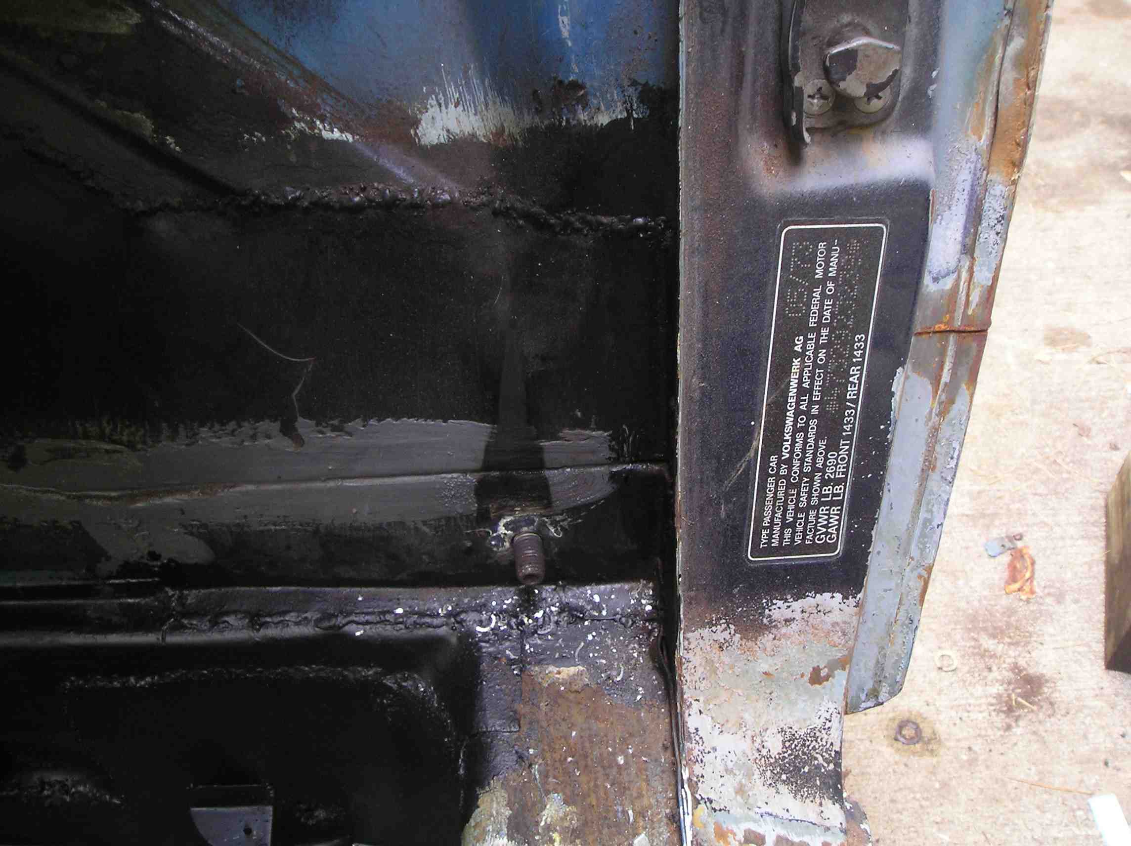 For those who are interested, I used 18 gauge sheet metal for most of the structural areas such as the longs. I used 19 gauge for other areas such as the firewall and center tunnel. Finally I think I used 20 gauge for the engine shelves. I was able to get most of my metal from a local guy that I found on TheSamba. The rust encapsulator that I use is Eastwood's product. I just make sure to clean the metal real well before applying and it has held up pretty well for me in the past. I also use Eastwood's seam sealer as well. As far as the car goes, I finished welding in the passenger side firewall piece and seat mounts. Today I welded in the driver's side firewall, the seat mounts, and the e-brake mount and cover. I wrote out a list of everything else that I need to do to the car so I will just work my way through the list over this holiday weekend. Next up on the list is to fix the rust under the gas tank/wheel-well/front passenger floorpan. Driver's side Passenger side Rust in the wheel well |