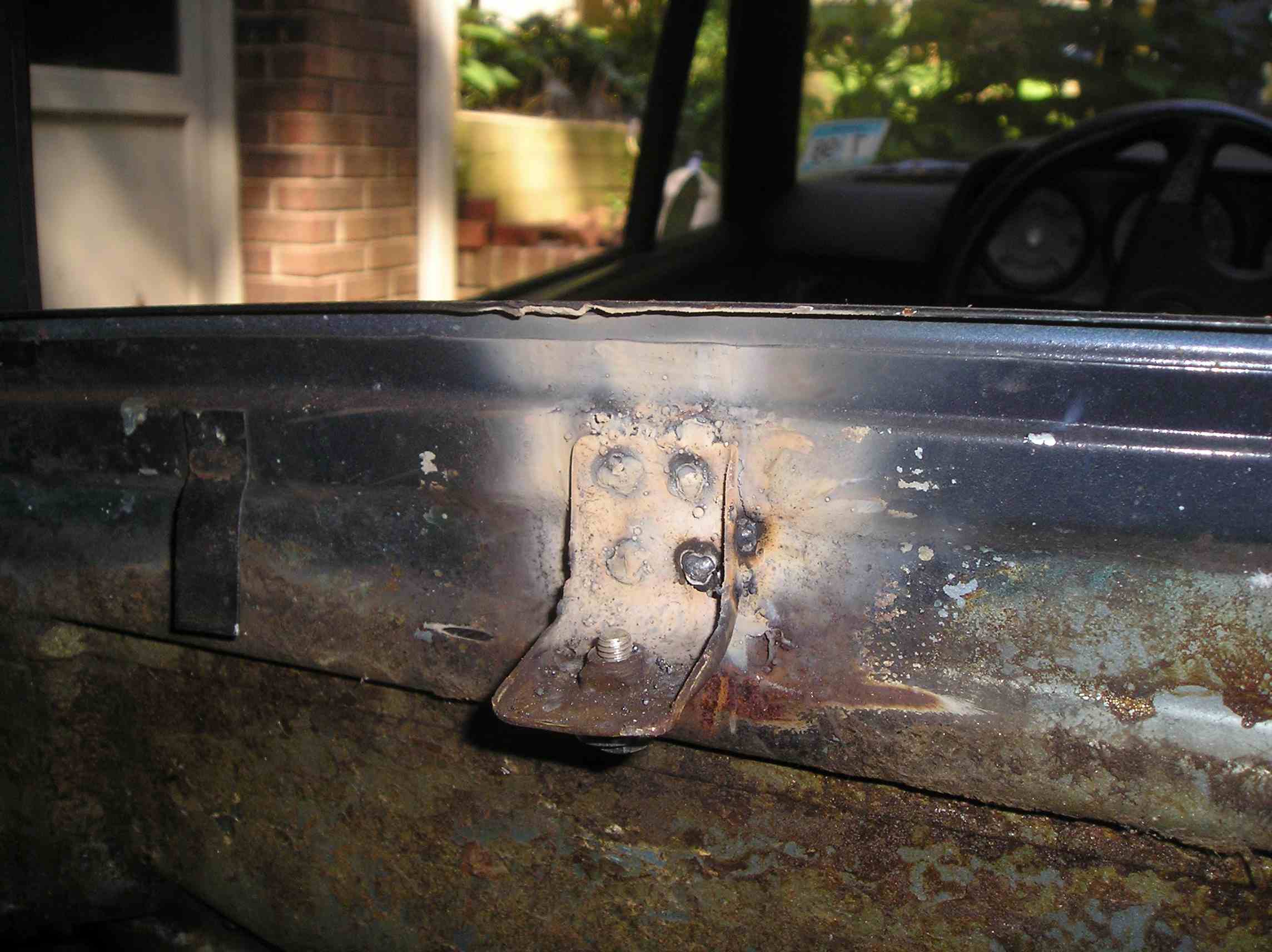 I also welded in a new engine lid pull tube from a spare car. It's hard to see in the picture but I purposely cut it about two inches short and attached the two ends together with a rubber piece of hose. In case dirt or anything gets down in that corner, I can remove the lower portion of the steel tubing and clean everything out. I already routed the cable and hooked it to the latch and it works perfectly. (IMG:style_emoticons/default/smile.gif)