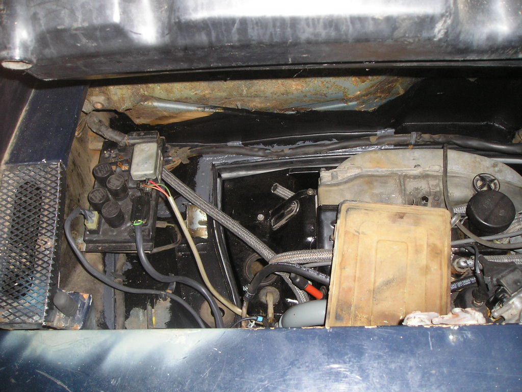 Oh and the fun doesn't stop there! I went ahead and finished any welding or repairs needed in the engine compartment, coated it, and sealed all the seams up. I then installed steel gas lines through the center tunnel, the fuel pump, and any gas lines underneath. I installed new engine bay seals, relay board and routed the wiring harness in order to get ready for engine installation...