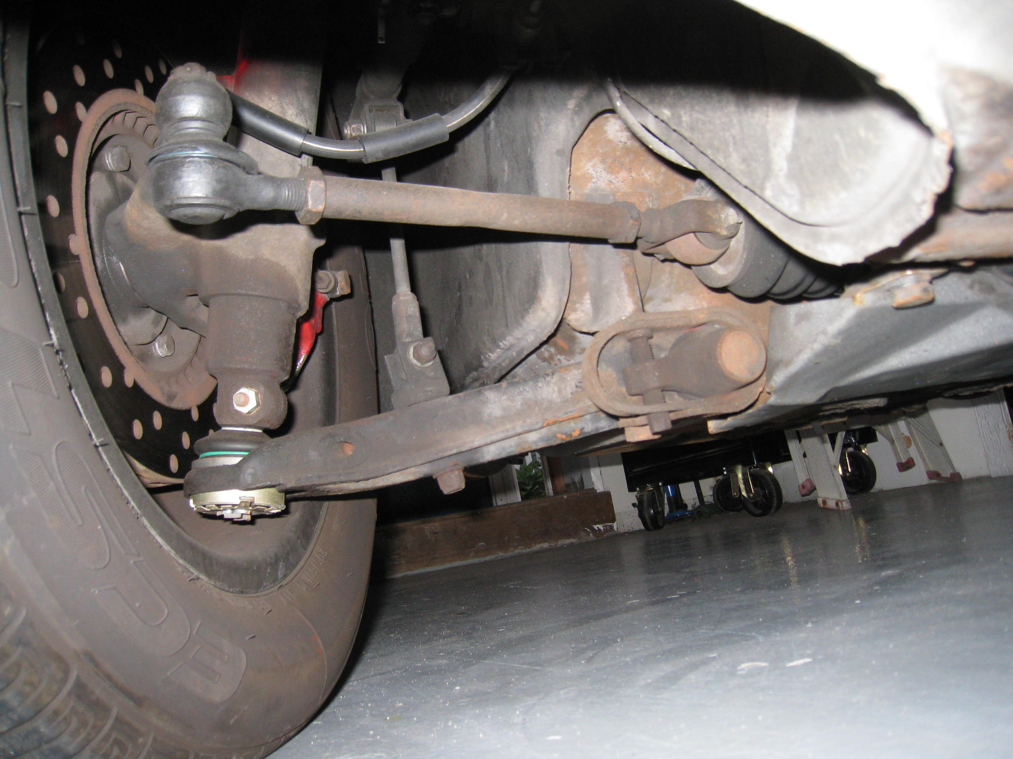 from the pictures the lower arm being level creates a good swing ark. as long as the tie rod is parallel to it, via bumpsteer kit. the theory is if the two move up and down parallel to each other there won't be "bump steer" or one pull more than the other. there are many factors that will effect this though, like unequal lengths. a cool study of this is how carrol shelby relocated the mustang upper arm 1.5" lower. this only changed the upper arm angle from downward angle to level. it also altered the ride height, altered the charicterists of the camber swing. ever see the inner wheel on a turn change to negative camber as it lifted on an old mustang before the mod.? |