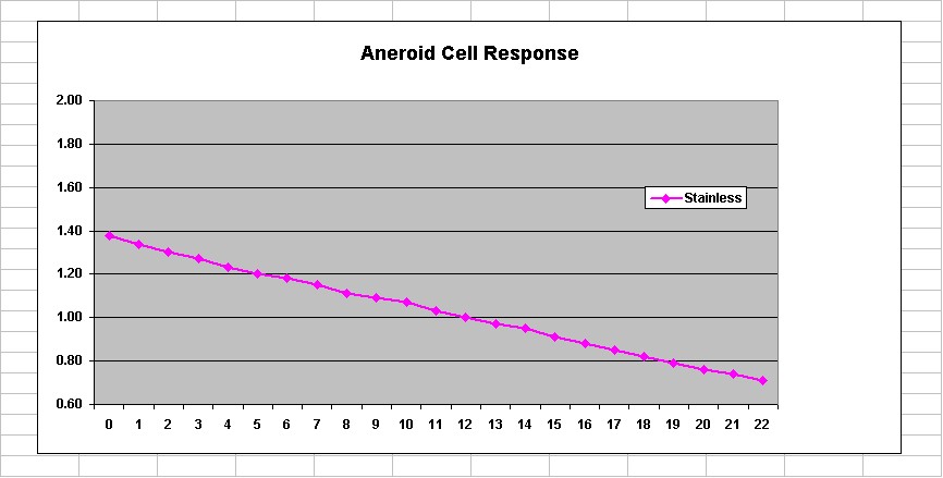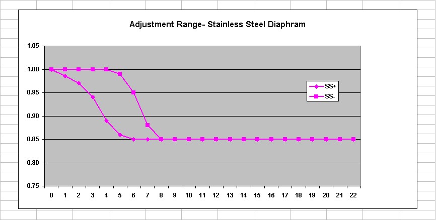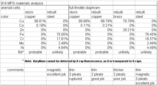 *** EDITED *** Materials. I measured alloy composition at work using an X-Ray Fluorescence analyzer. This machine is very precise, but it has limits to the range of elements that it can detect. Unfortunately, it cannot detect Beryllium (Be), and it is likely that the stock (at least) diaphram contains Be to harden and strengthen it. You can see a couple of things here though- the stainless diaphram and stainless cells are of exactly the same composition- nickel-chromium stainless steel. The nickel explains why they are slightly magnetic, as many stainless alloys are not. ***