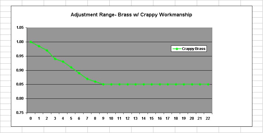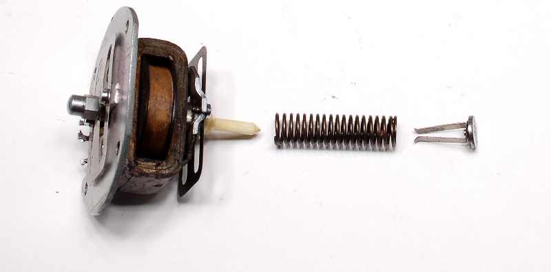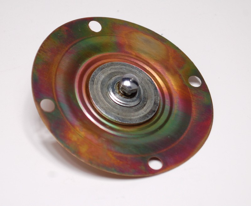 #3- brass, 2 pleats. This is from a rebuilt MPS. I have three of these diaphrams, all similar. This MPS was freshly rebuilt in a rebuilder's box. Looked like new with fresh paint and plastic cap on vacuum port, but it leaked slightly. You can see why when you look at the ripples in that flange. The O.D. looks like it was cut out by hand with tin snips, and the threaded bushing was taken from a stock diaphram and soldered by hand into place. At the bottom in the picture, you can see that the flange is pretty smooth- that's where I tapped it out with a machinist's hammer on an anvil. I have no doubt that the leakage was from around the O.D. of the diaphram, and that tapping it out would probably fix it. This material (brass, see chart below) is stiffer and thicker than any of the rest. It would add quite a bit of spring tension to the mass-spring-damper system. In general, I rate the workmanship on this as "crappy", though maybe you could get a running car out of it.