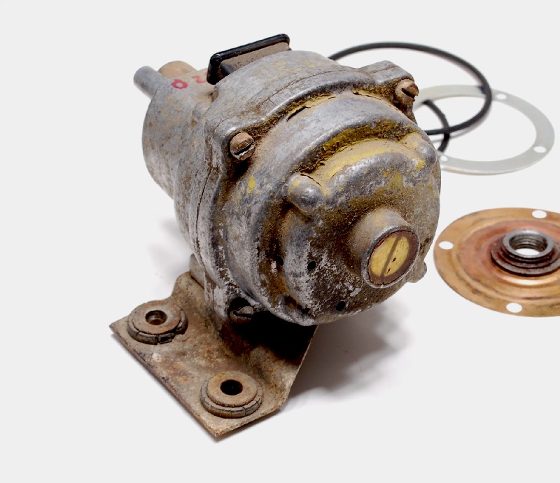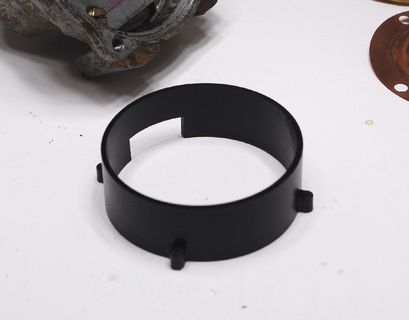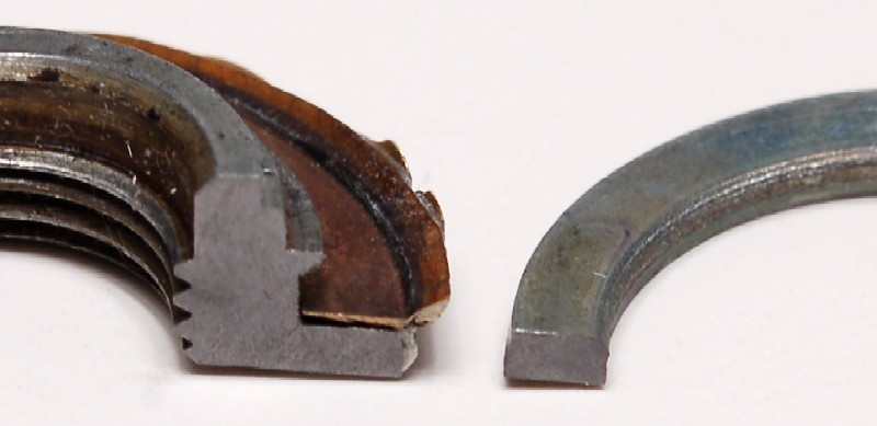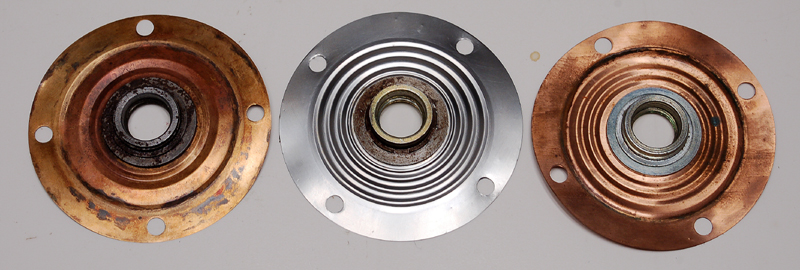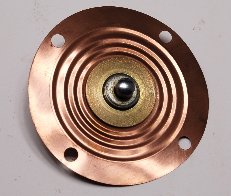 #1- copper, 2 pleats. This came from a rebuilt MPS that was in a pond or river for some time. There was actually sand in it, along with tiny aquatic snail shells of some sort, and the copper was pretty much green. This diaphram was ruptured. The workmanship is very good, and the alloy is idential to stock (see chart below). The threaded bushing looks like stock in design and attachment.