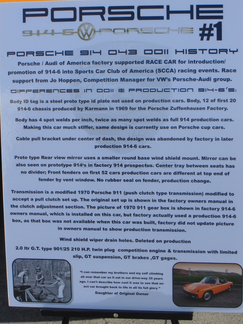914-6 0011 is part protype, car used as assembly test/work load pre production car, has many protype parts, rear view mirror, under dash pull bracket for possible gas cap release in hood,sold by porsche for off road use, was a euro car so could not be sold by porsche in USA for street use ( used in racing to promote 914-6 in scca), engine is full race twin plug only 914-6 to have full set of matching #'s on body,engine,trans. #'s end in 0011