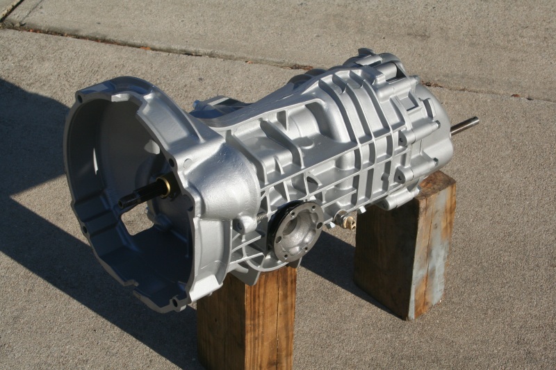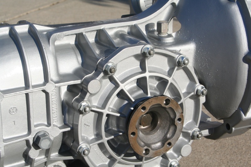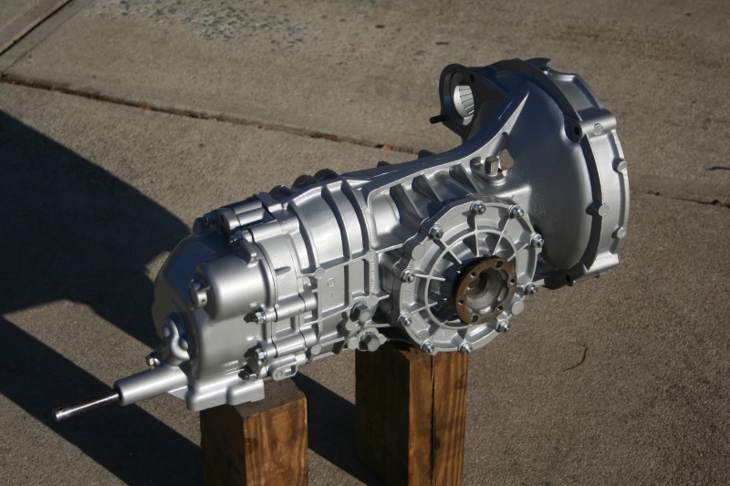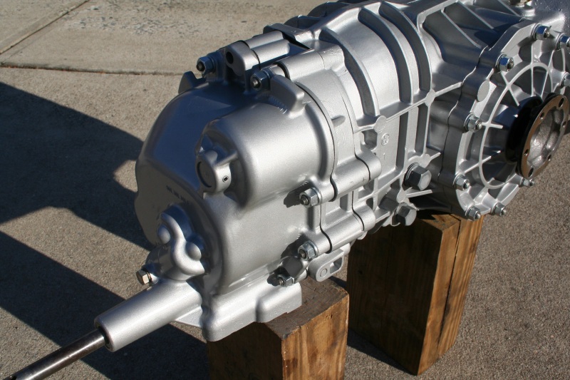 The transmission is going into a 550 Spyder kit car. Initially the customer was looking to use a type 902 transmission (out of an early 912) that he had on hand, and it would be using a cable shift setup designed for the 911 style tail-shift. But due to various difficulties with the 902, we decided to instead to use a tail shift type 914 as the basis and then make some modifications to match his cable shifter setup. It still is a tail shifter, but it now uses the magnesium tail and shift rod from a 911 instead of the 914 setup. It is very much like the magnesium case type 911 transmission (used by the 911 just prior to moving to the type 915 transmission), but setup in mid-engine configuration. There are some other tweaks such as the 911 style fill drain plugs, some replating of parts as well as the fact that it is painted!