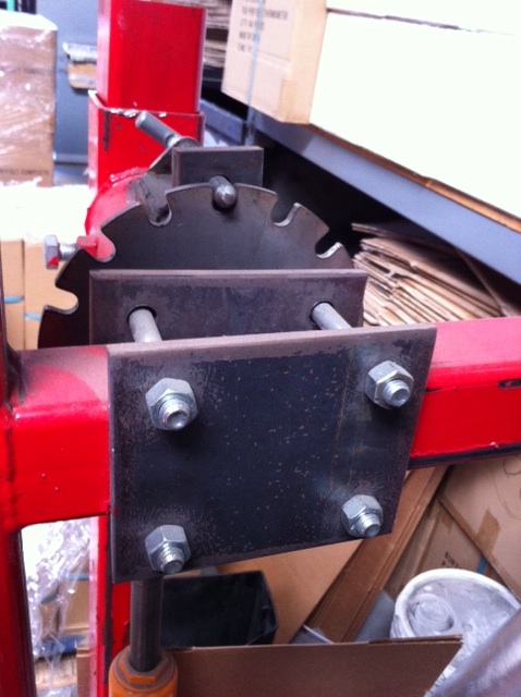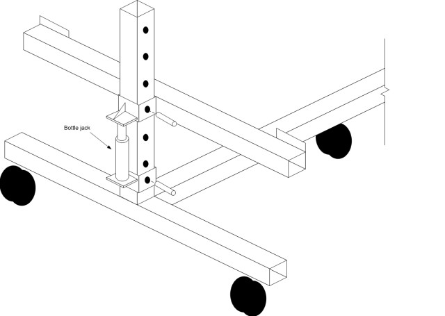 Put the jack on the inside. Placing it on the outside you are pushing the framwork into itself. By placing it on the inside you are lifting directly verticle on the load point. I would also recommenr using a hydraulic jack like on an engine hoist and soild mounting it to the lower leg. The set you have planned is going to be a little awkward with having to jack,set pins, raise jack, re-jack reset pins etc. A bottle jacks throw is VERY limited, whereas the tyype I am using has a long throw and can be mounted on the base and left