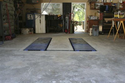 After learning the hard way I bought a nice Bend Pak SP-7 with a 6 foot lift and sunk it in the concrete. Here are two pics on top of the concrete and then after I sunk it. It's an awesome lift that you can stand under, not crawl under. I'm getting too old for that crawling routine.