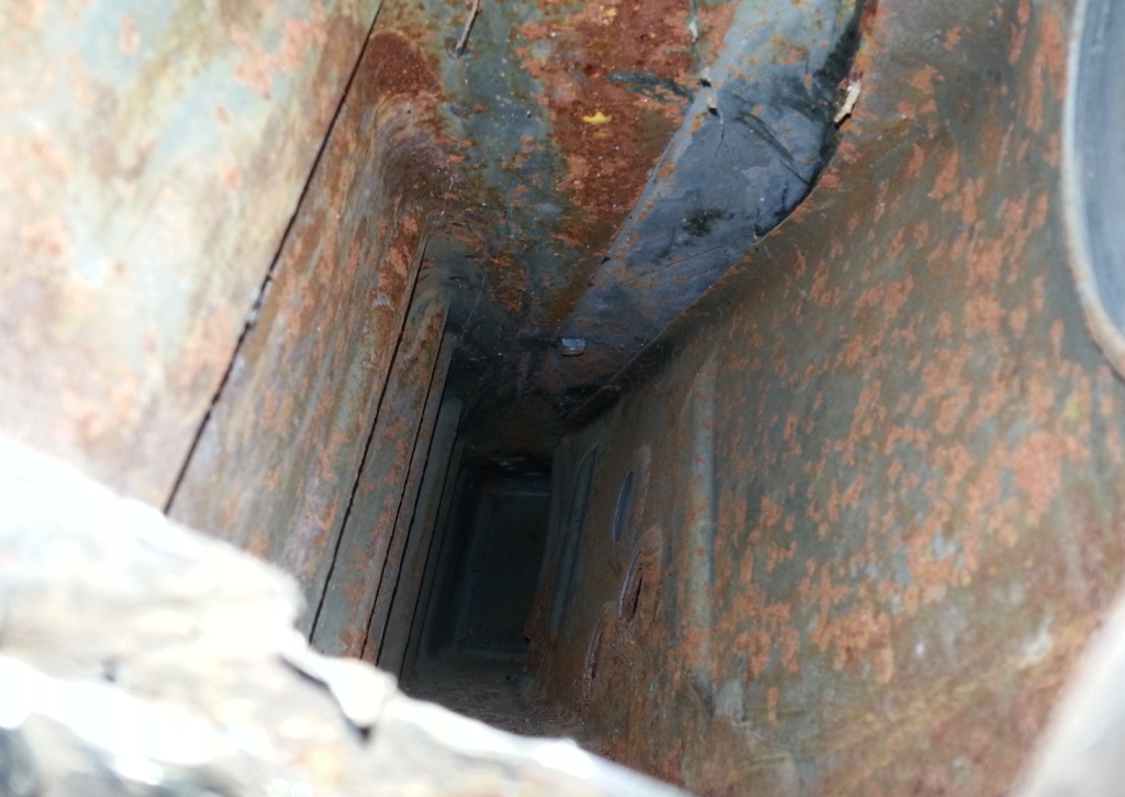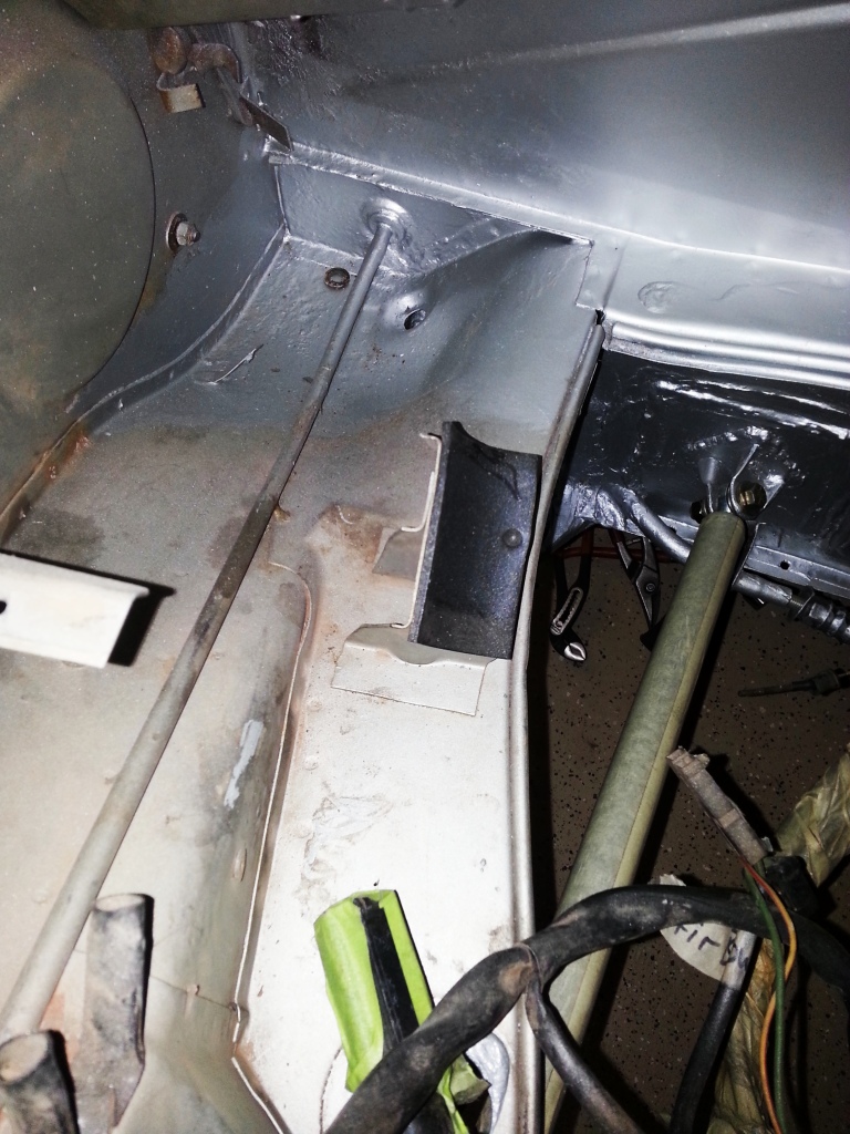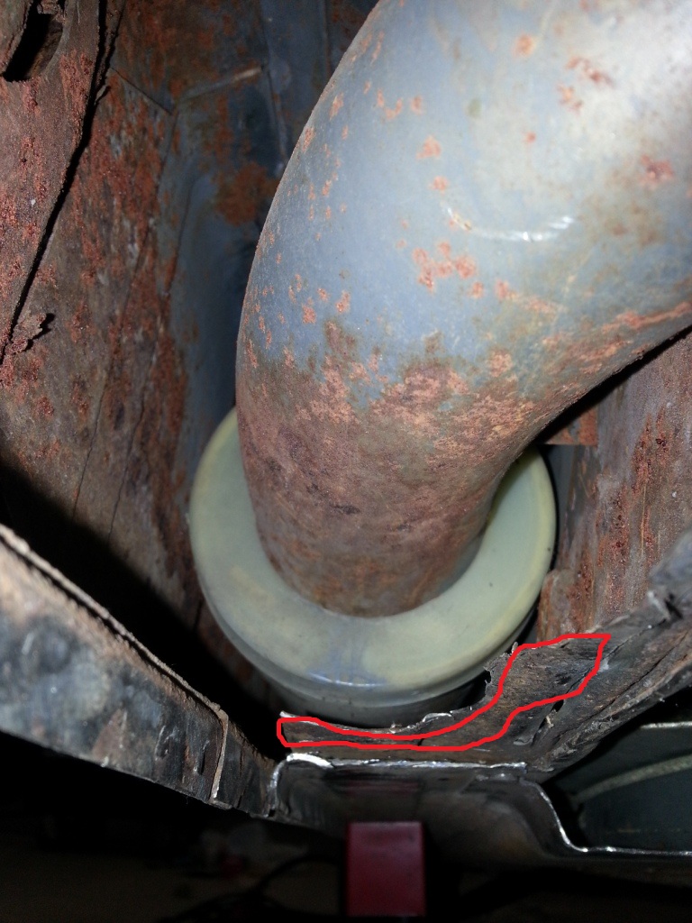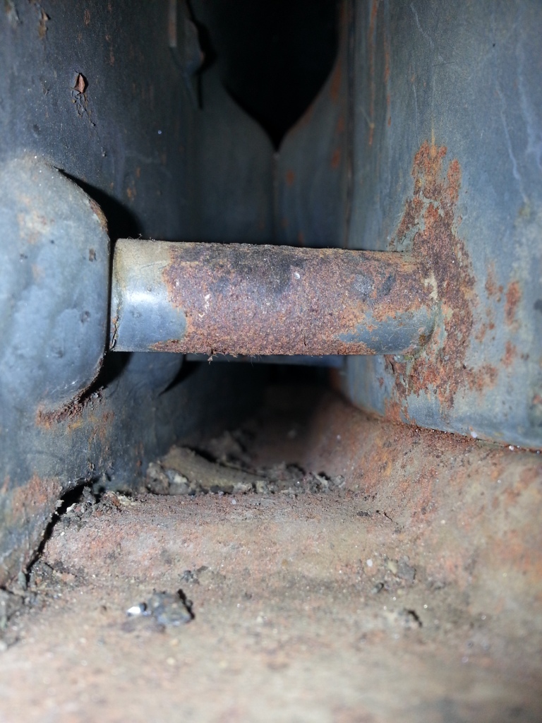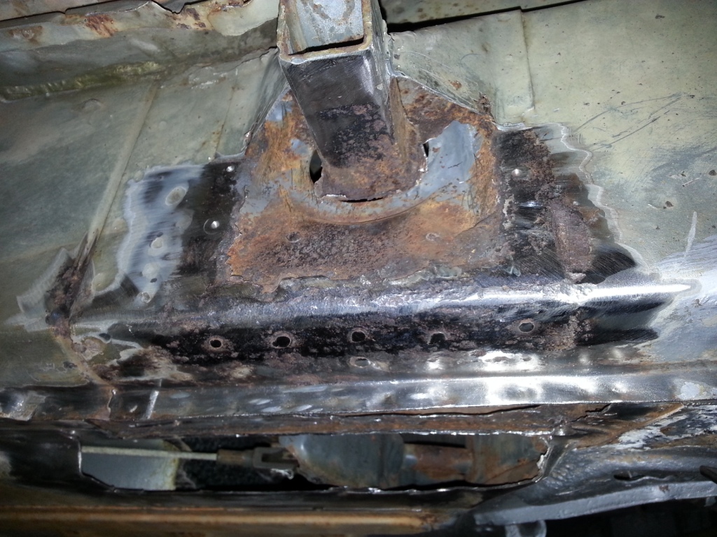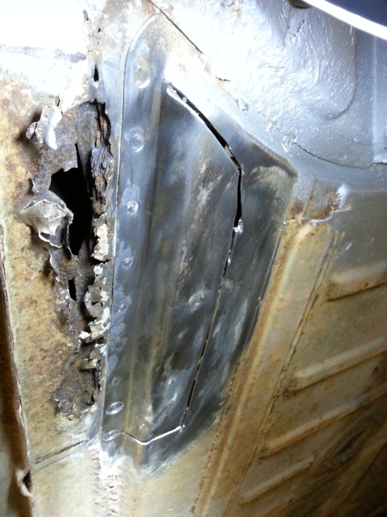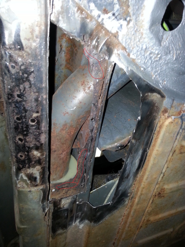 Once I cut the floor pan to gain access to the long, I found that the inner c-shaped metal was thin and rusted. I cut all the way into solid metal to gain access for inspection and cleaning.