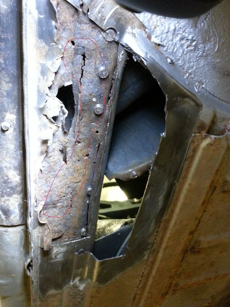 Just below the left jack post, it appears that one of the PO must have "hooked" the car on the long - resulting in a rip and rust, about 4-5 inches long: