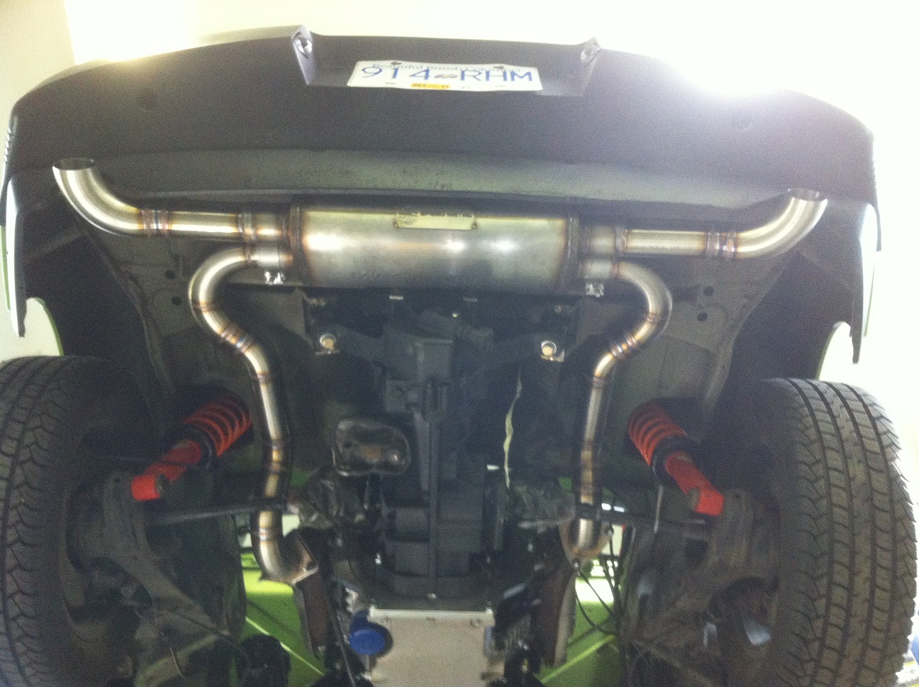 I designed the system, including the hanger, routing and exit to include sizes. Mike made it a happen. Wanted a port hole, but not the tiny little pipe exit. Not straight either. The down angle looks right, this system sounds fantastic. I suppose the best description is that it does not sound like a Type 4 Volkswagen engine. I'll get the part number of the muffler later if you want it. Give me a call later in the day, I am working on the race car at the moment...