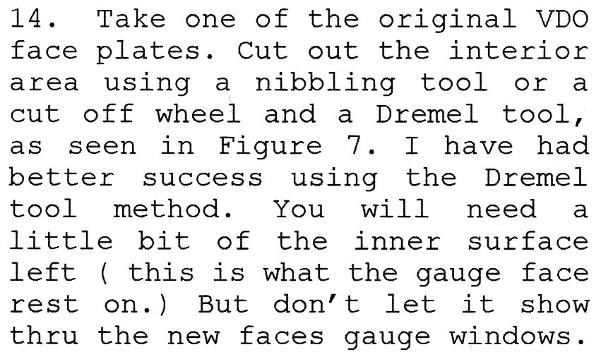 This a replacement to step 14, I did when I did mine. I cut out the original faces to use as support for the new face. This save you trying to epoxy stand off of inside the gauge body. Much easier for me.