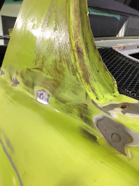 It's coming off on my green car, and here's an idea of what you find underneath. As for the holes, I'm welding them closed.