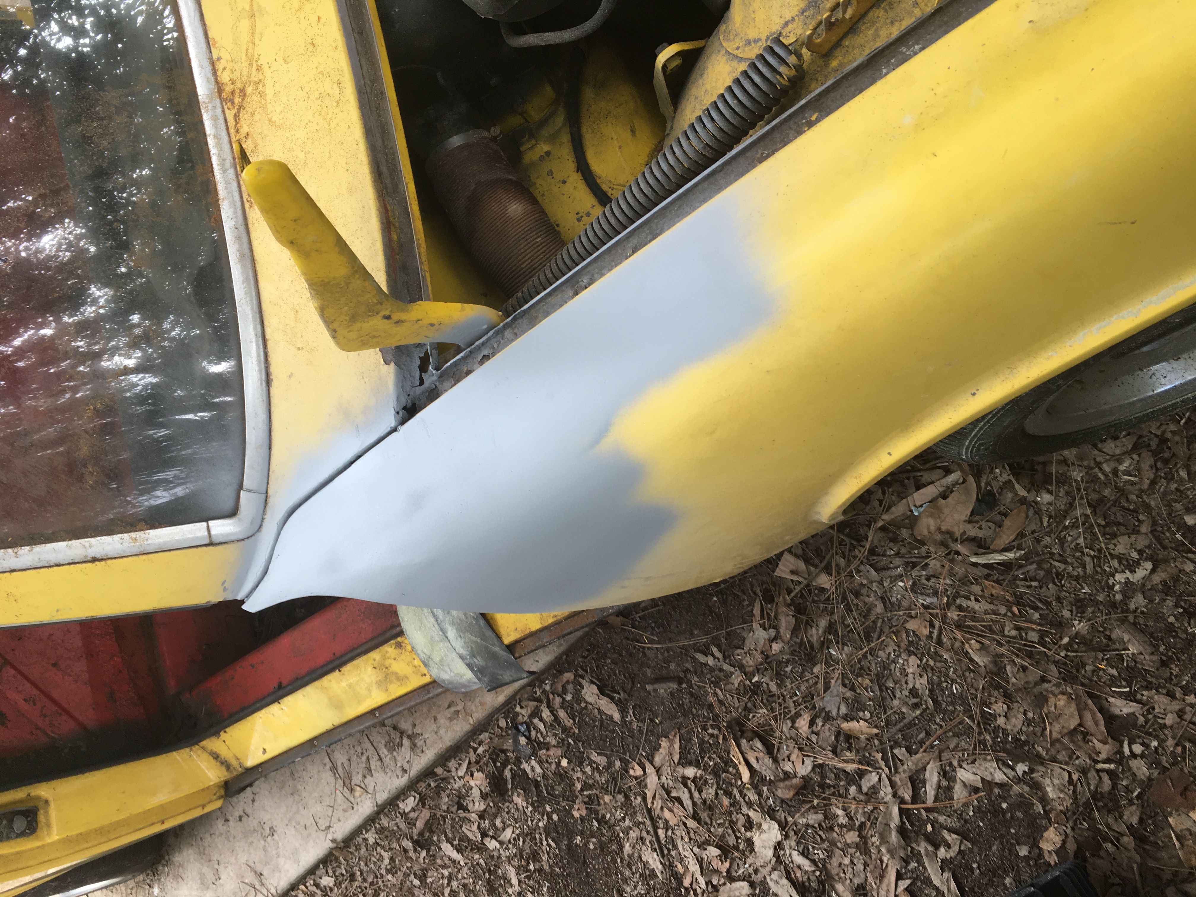 Just getting started on the front end of my '76. This is the biggest hole on the front end of the car, and while it wasn't an easy fix, with the help of my more experienced buddy, it is my first step down the path.