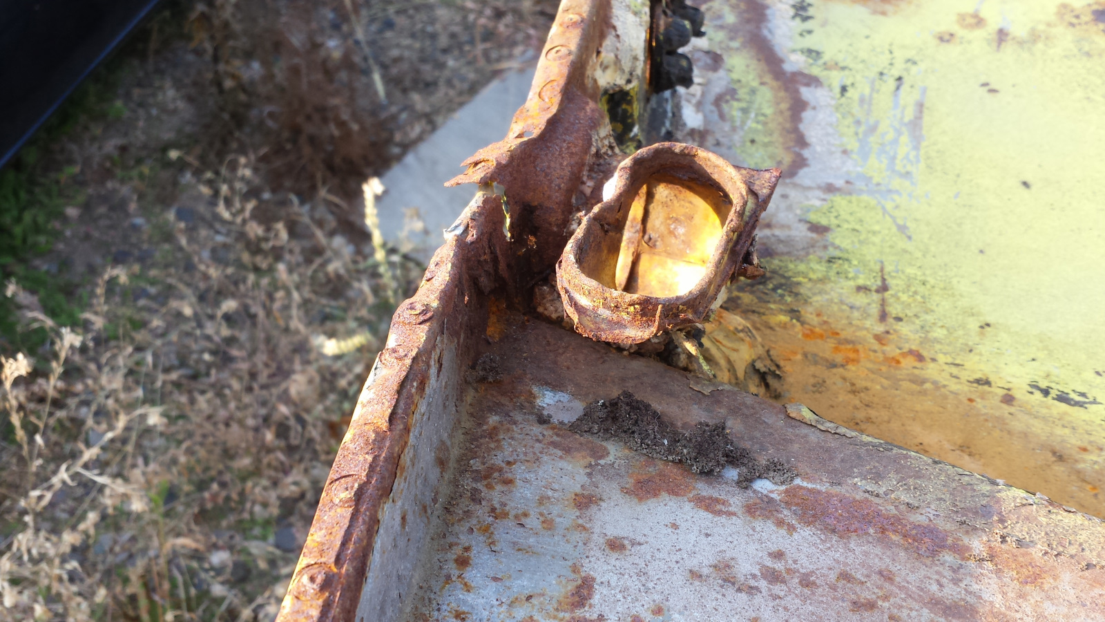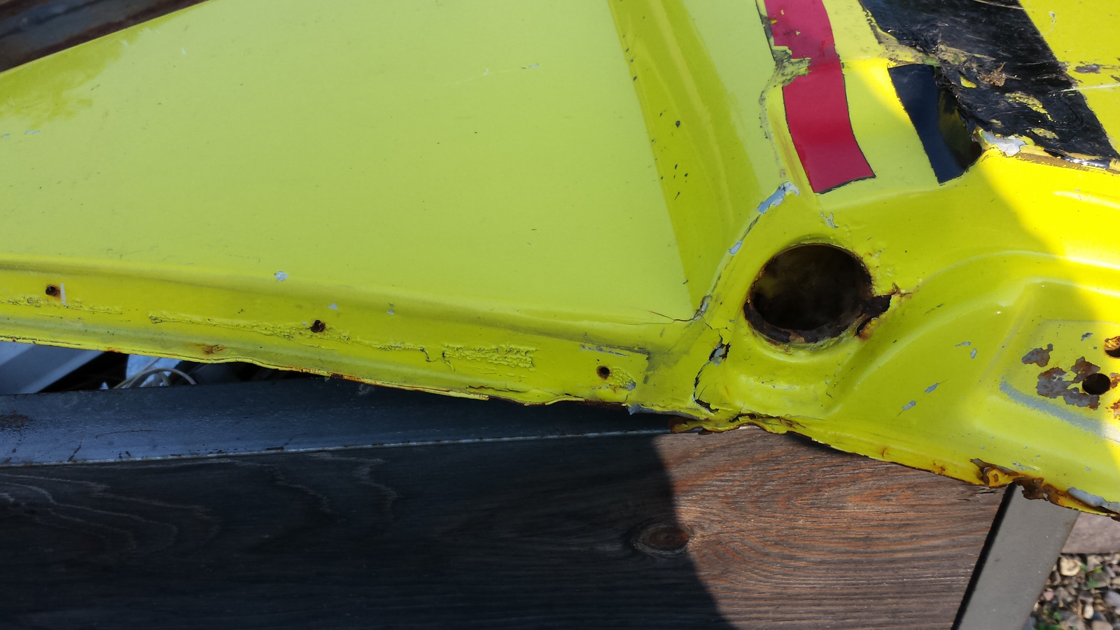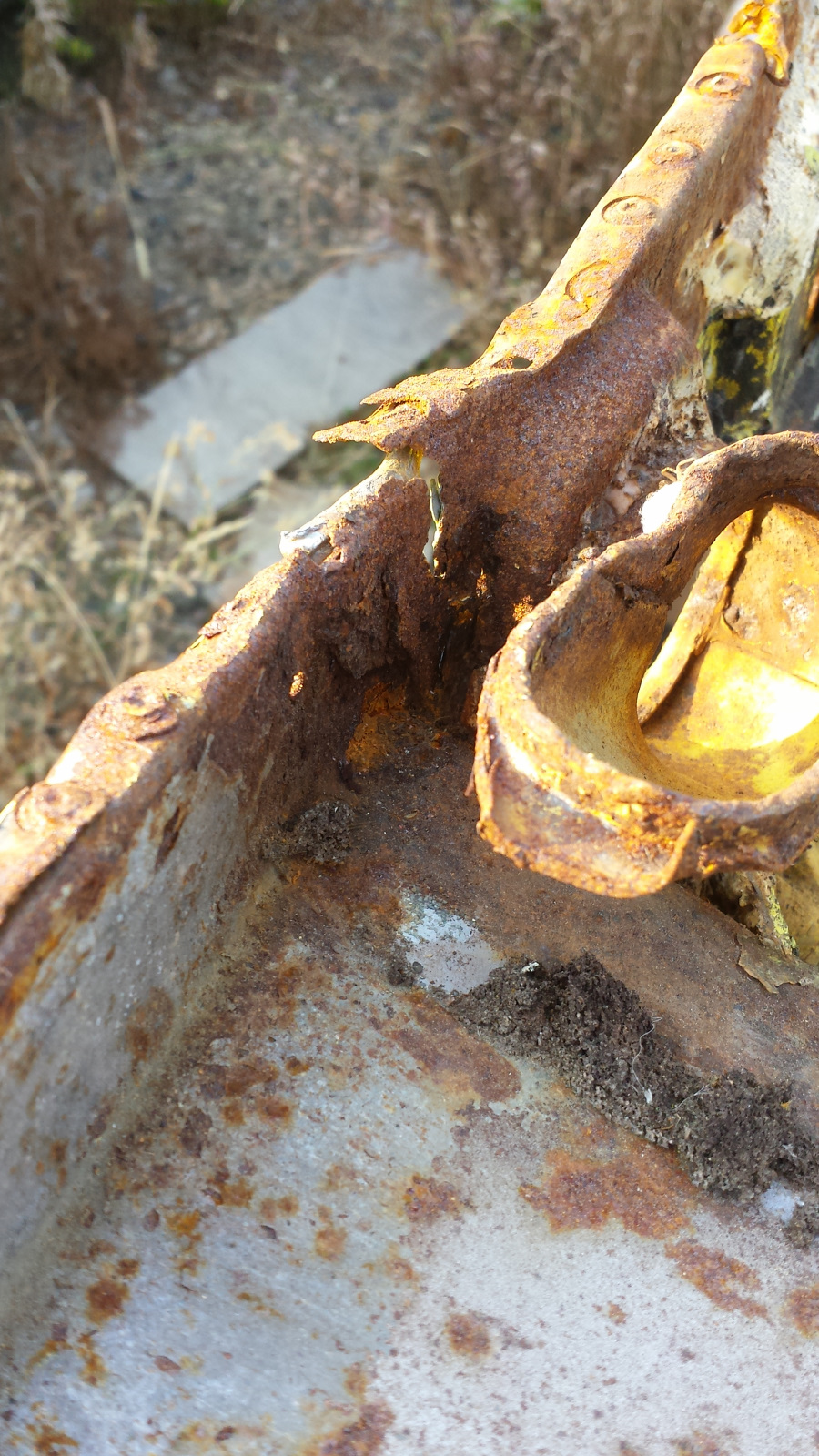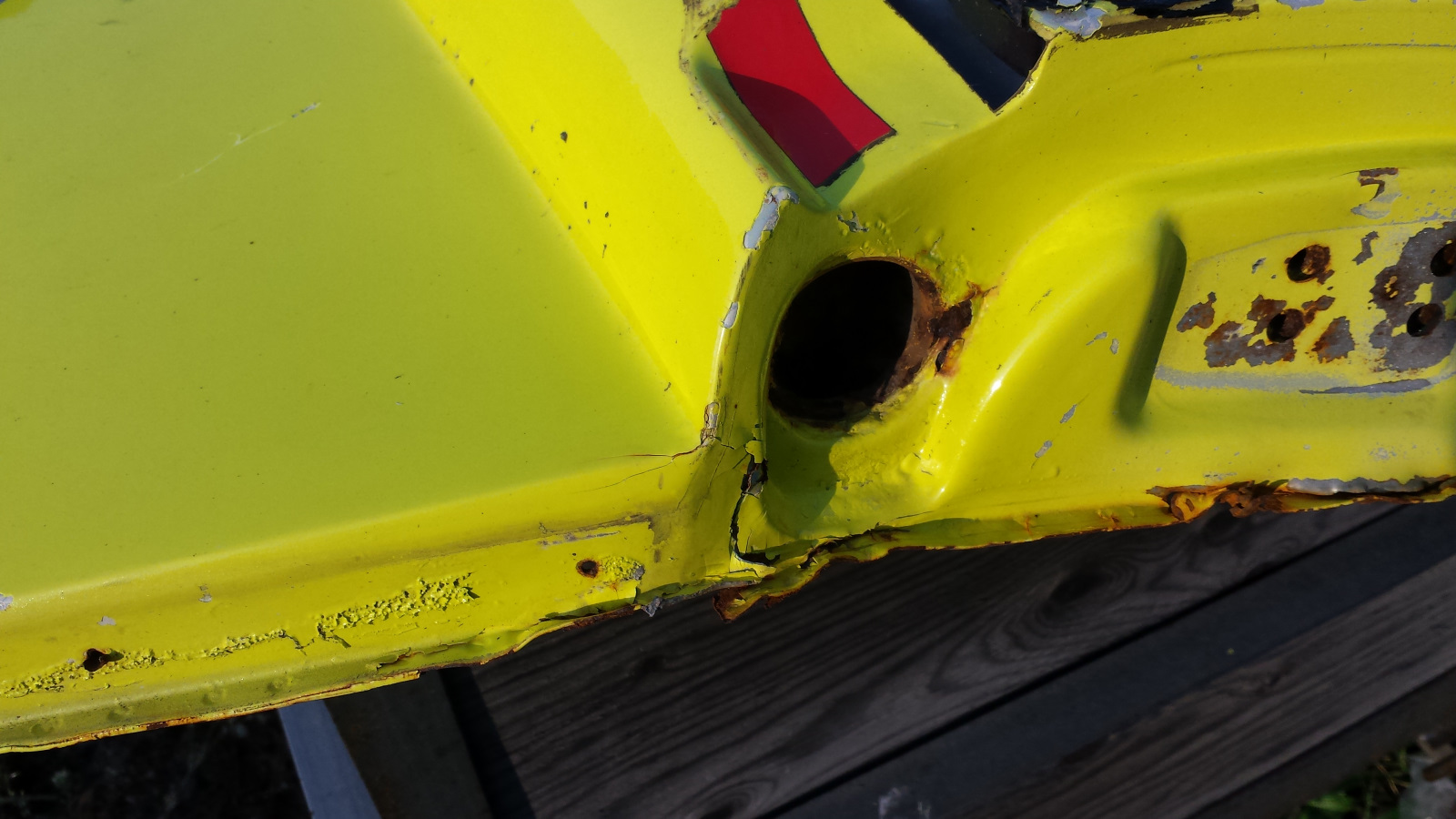 Rear left tail lamp area. Swiss cheese.