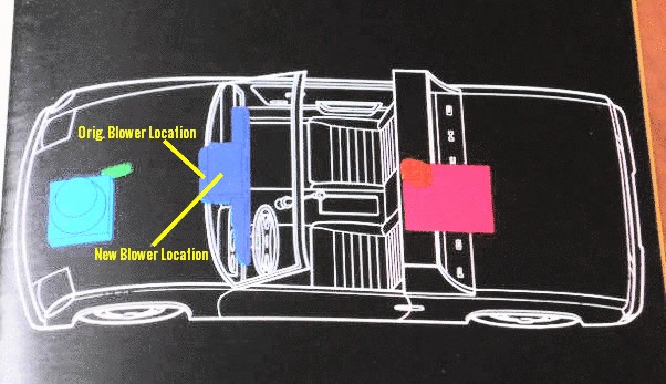 Along comes another scorching Florida summer and I realized I needed some sort of ventilation, especially when sitting at 5 minute stop lights. Just putting the blower back in its original location would not do, as it would block my foot again. That's when my wife suggested placing the blower "inside" the ventilator shell, since the evaporator was no longer occupying any space (see attached diagram). It fit like a glove and still had plenty of air supply when installed inside the shell, as it is open on one side in the back. Wired it back up to the original 3-speed switch and voila- I now have blowing air for relief and nothing is in the way of the accelerator pedal! In addition it all still has the appearance of the original A/C unit. Also, I realized my wife is a "helluva engineer"! - ANSBACHER