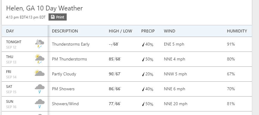 I live thirty miles from Helen. I just checked the latest forecast and there a 40% percent afternoon thunderstorm on Friday and Saturday is mostly sunny with only a 20% of a stray thunderstorm.
