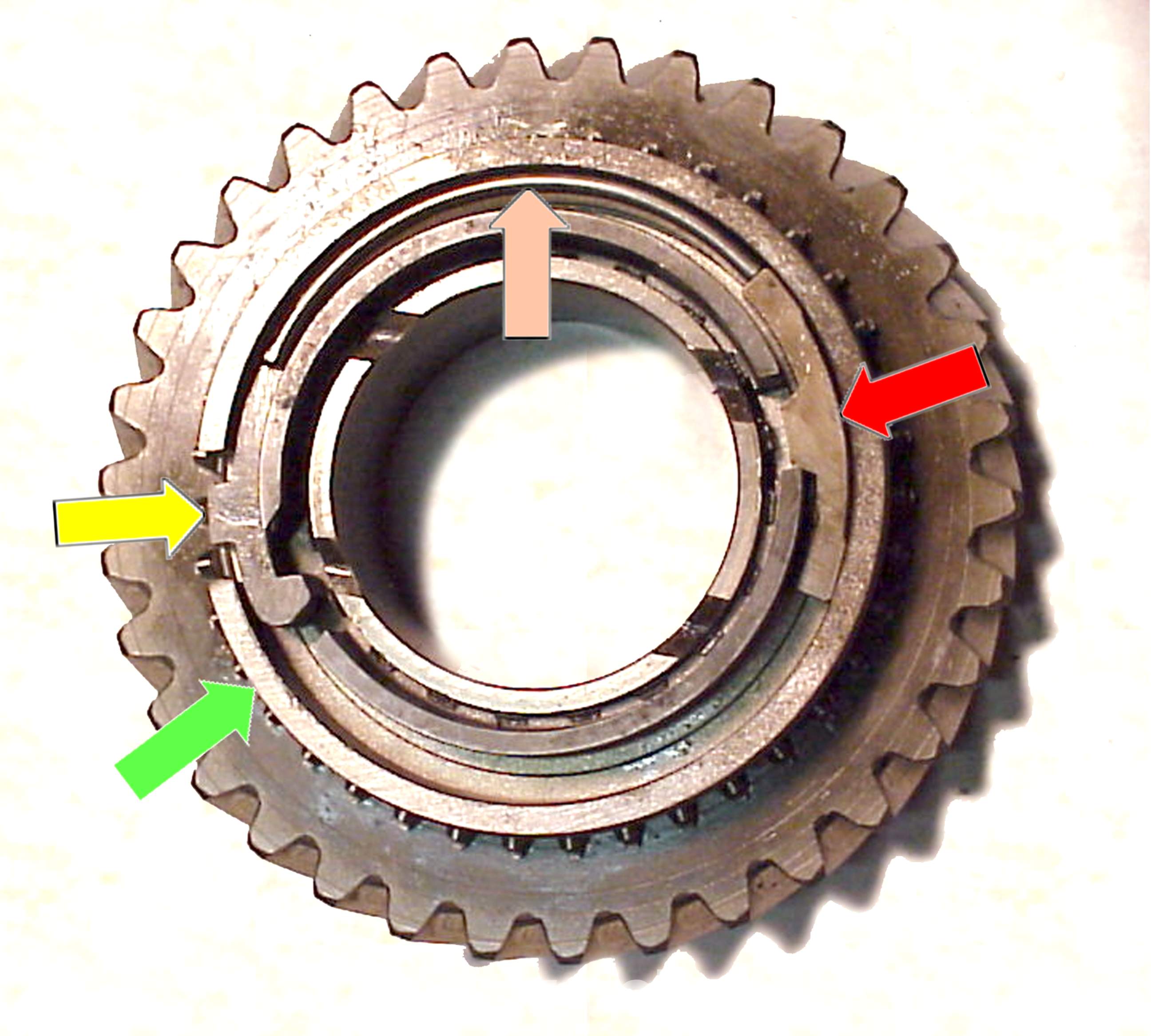 Here is a pic of a stock 1st gear from 73-76. I can tell that its likely from those years (if not messed with) because the bottom block (red arrow) is wider. The early ones are smaller, but still fail in similar ways, but usually wont hold into gear or wont let you get into gear. This is also first because it has two notches for blocks, has a hooked upper block (Yellow) and a single energizer band (Tan). You only need one band in 1st because you do not upshift into first. (Oddly, you dont down shift into 5th, either, but it has two bands.)