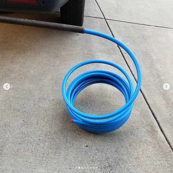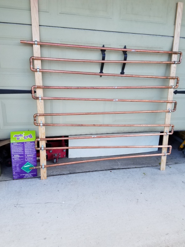 Pipes all soldered up for the dryer. I planned on running this 3/4 inch RapidAir Maxline from outlet of air filter after the dryer. Not going to happen. Took me over 5 minutes just to straighten out that little portion.