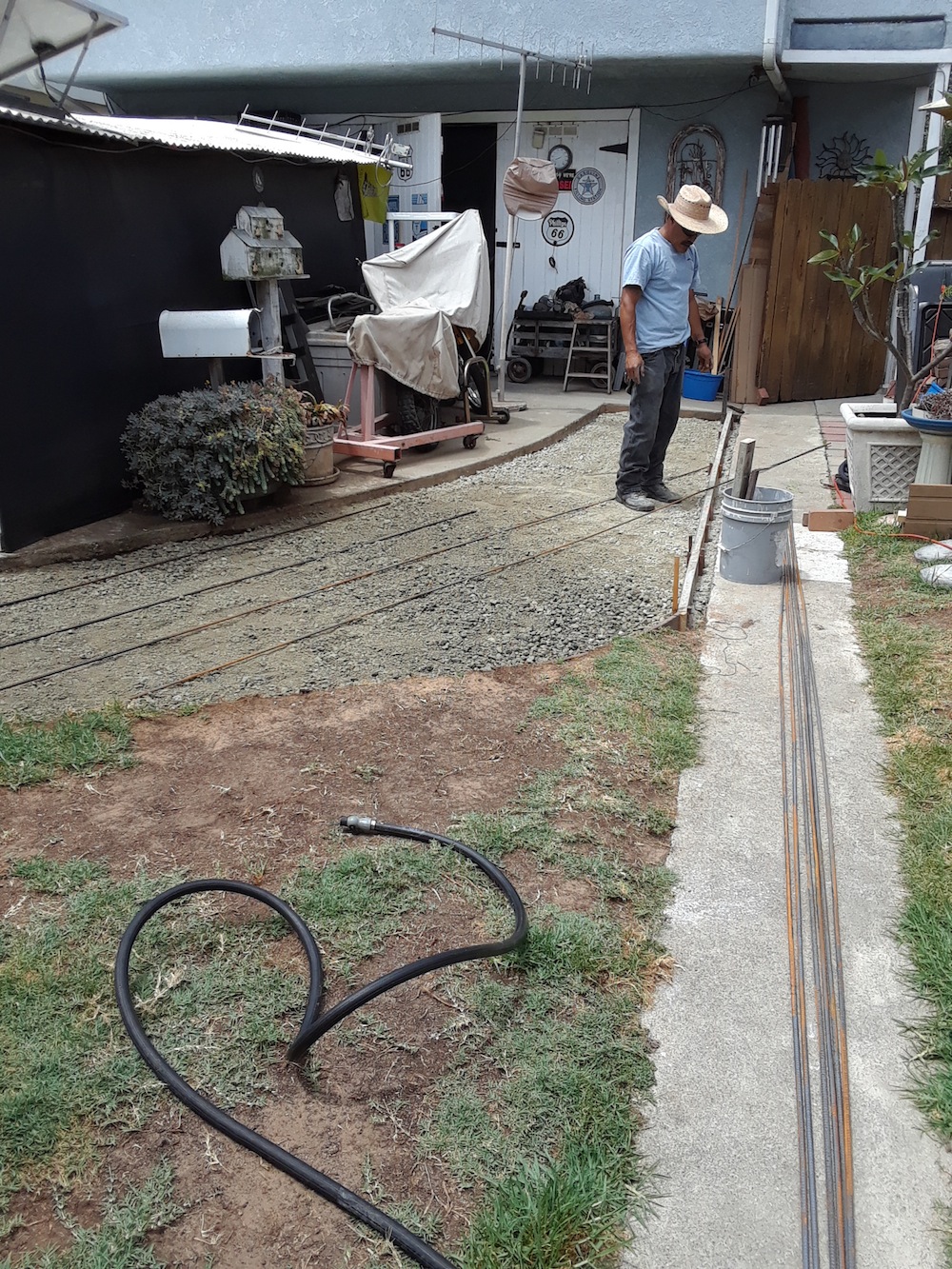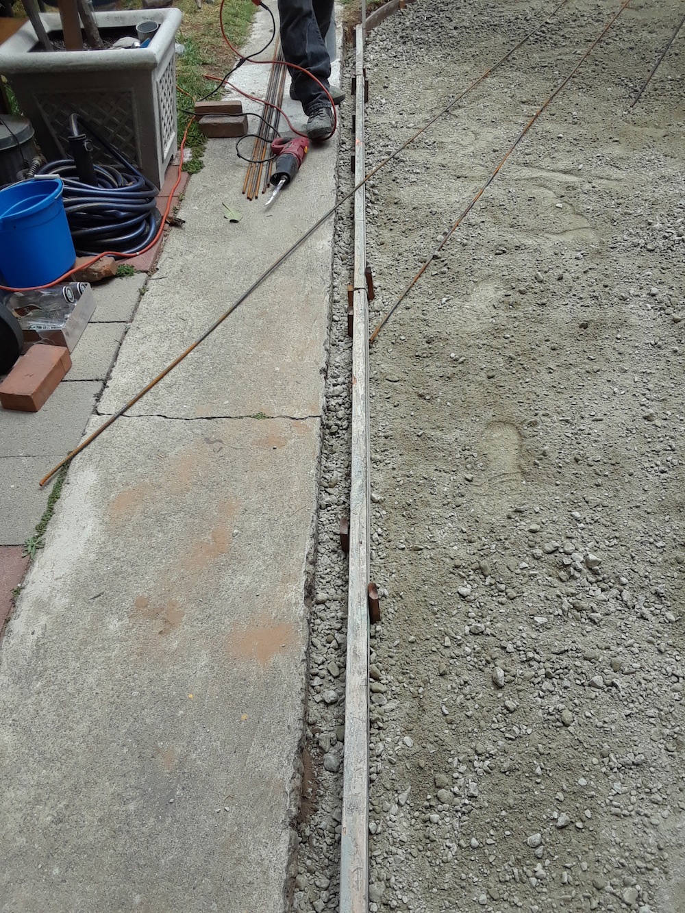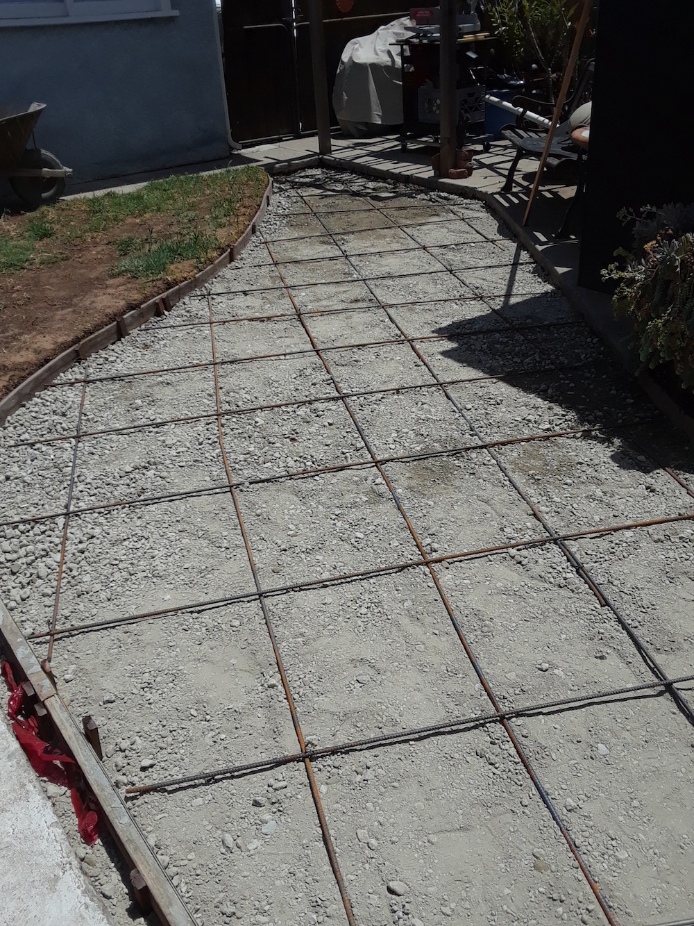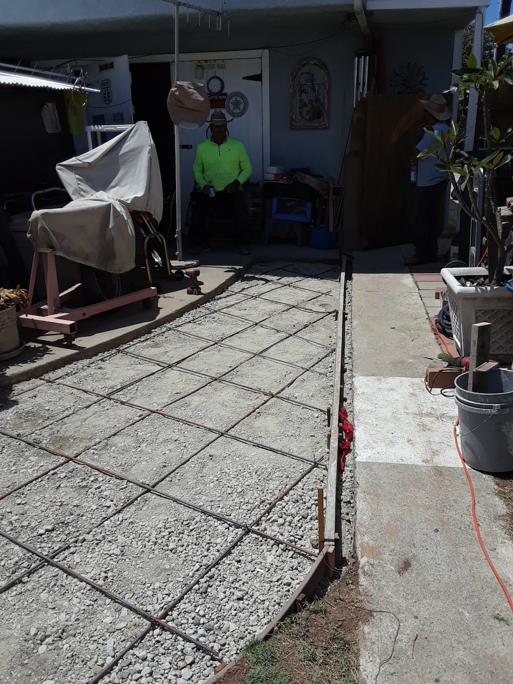 Gravel & the rebar was installed today, need to put down some dobie blocks and the concrete is scheduled to get pumped in and troweled tomorrow ... weather permitting. The form running the length is spacing for bricks to line the edges between the new slab and the existing walkway, giving it a little more 'wife pleasing' appearance